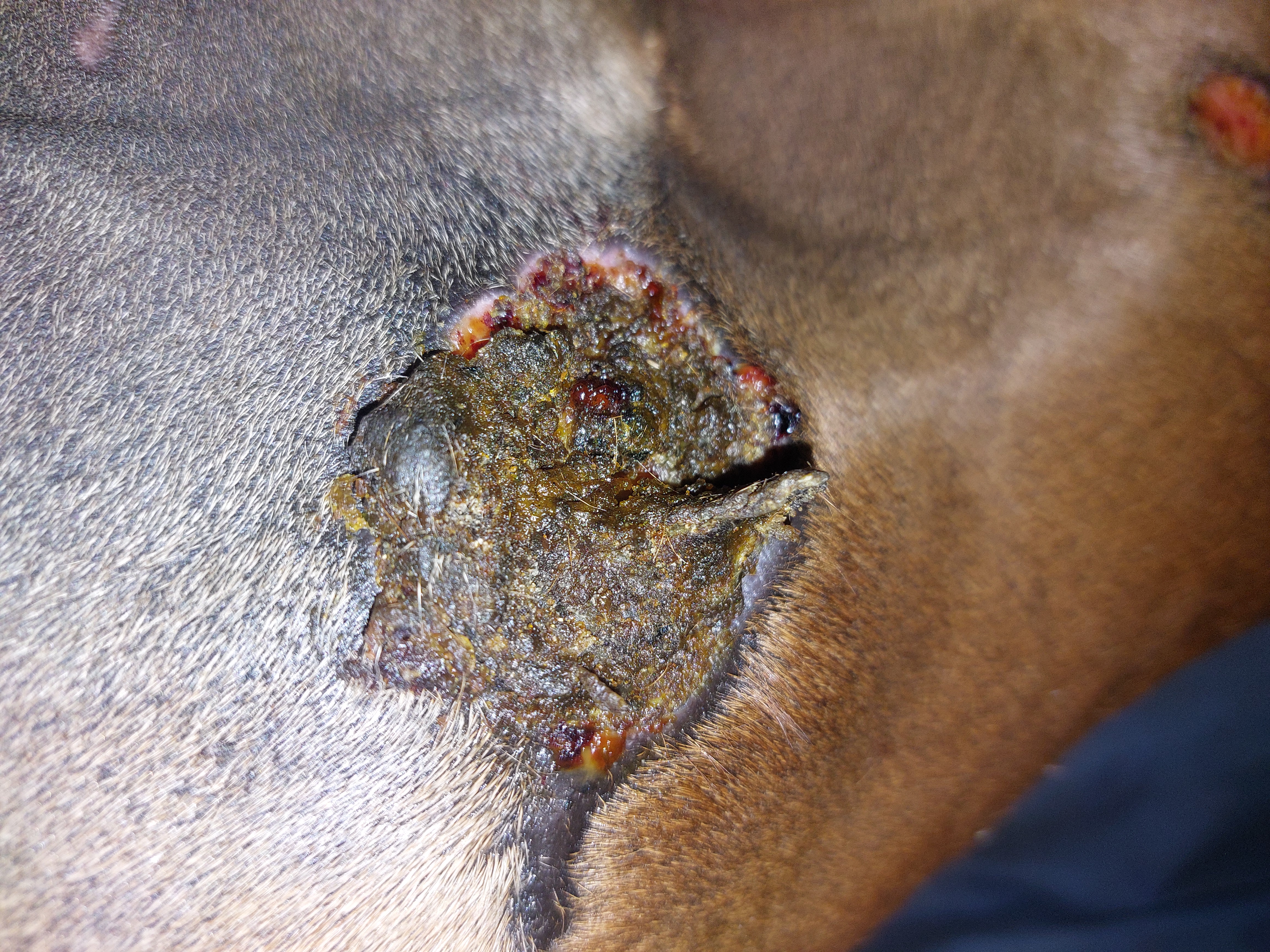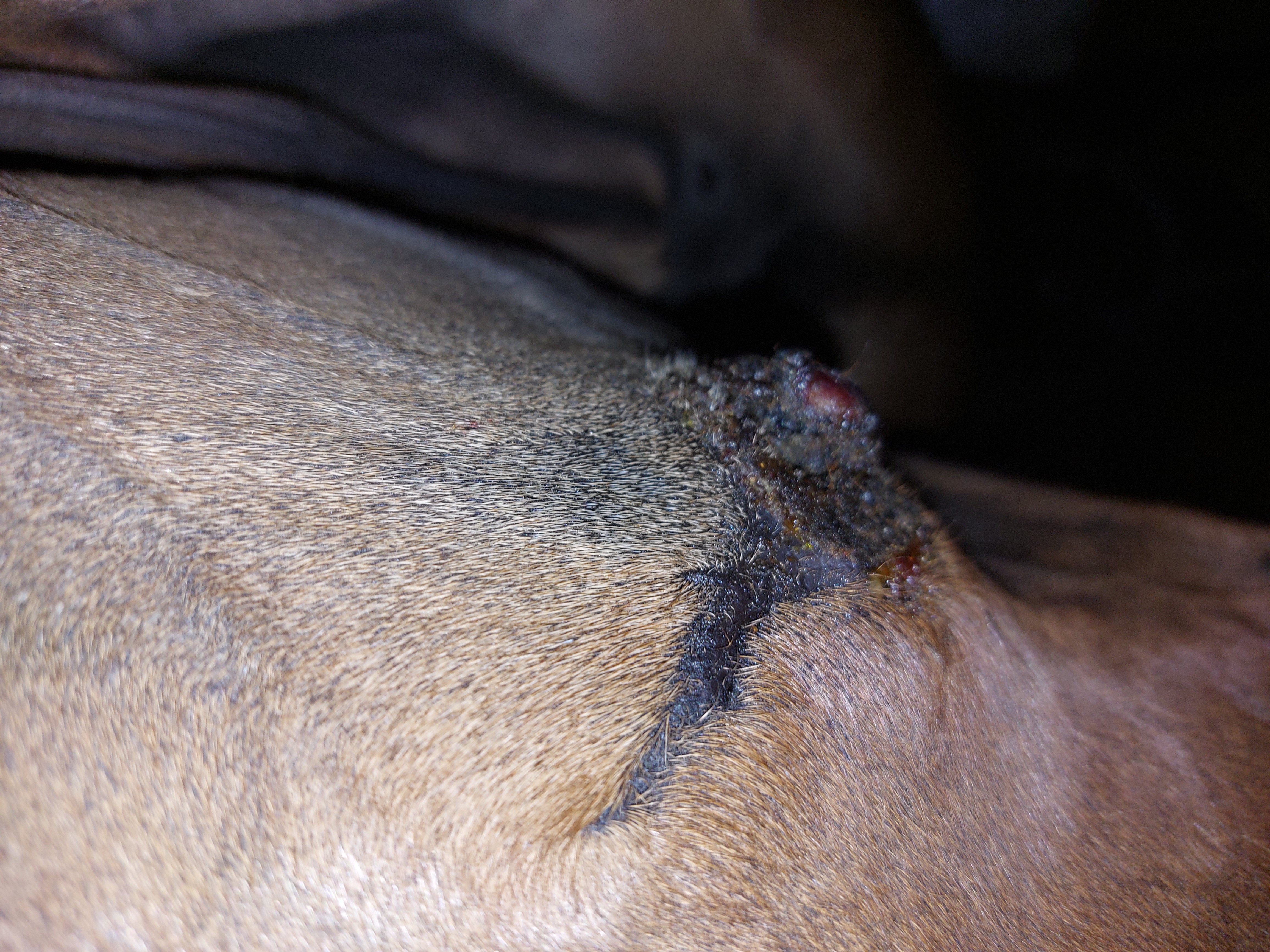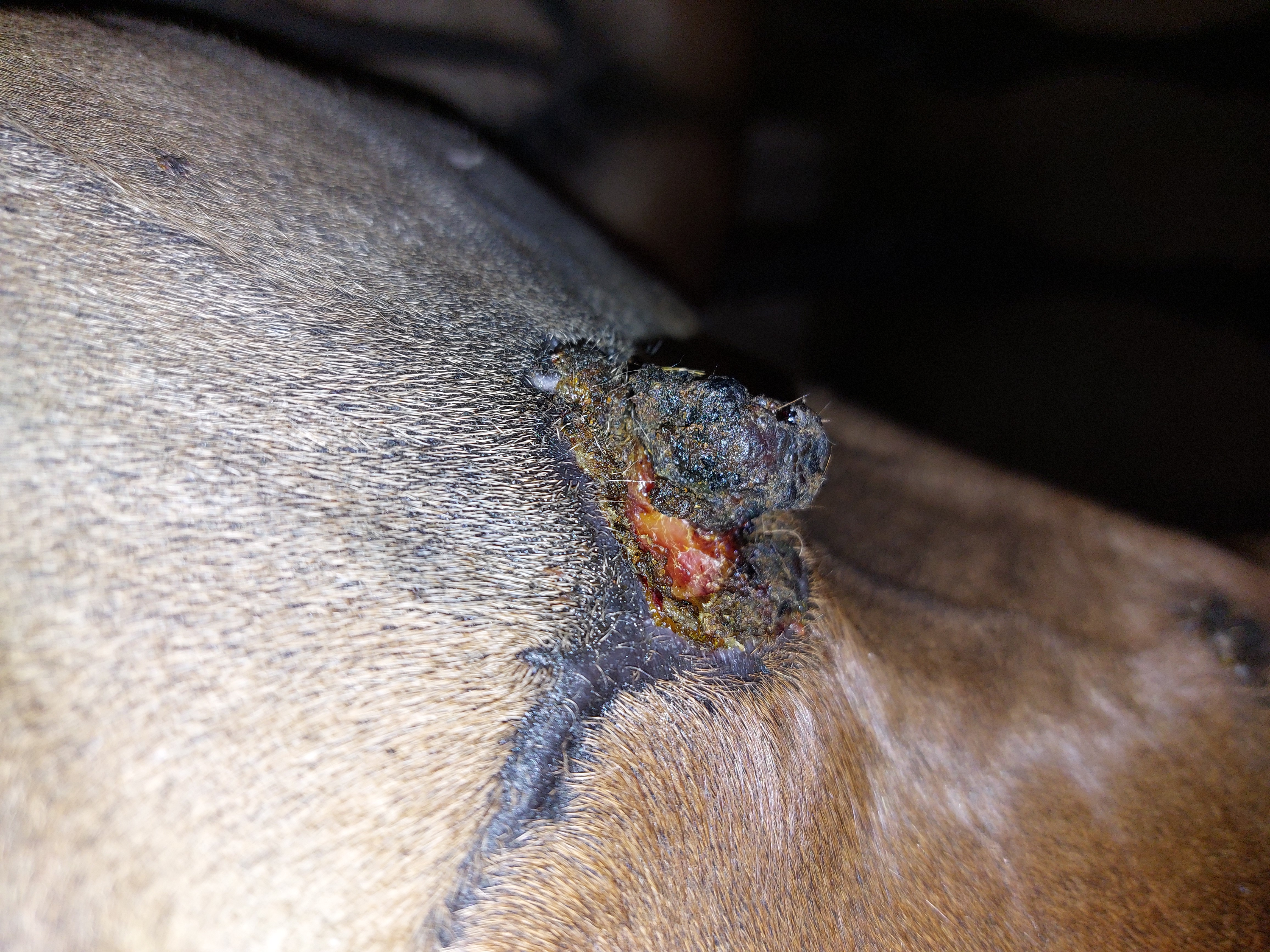 Hier gleich einmal der Stand von gestern, ich wage mich schon etwas zu freuen, denn ich finde sowohl vorne in der Achsel als auch am Hinterbein ist schon etwas gesunder Wundrand zu sehen.