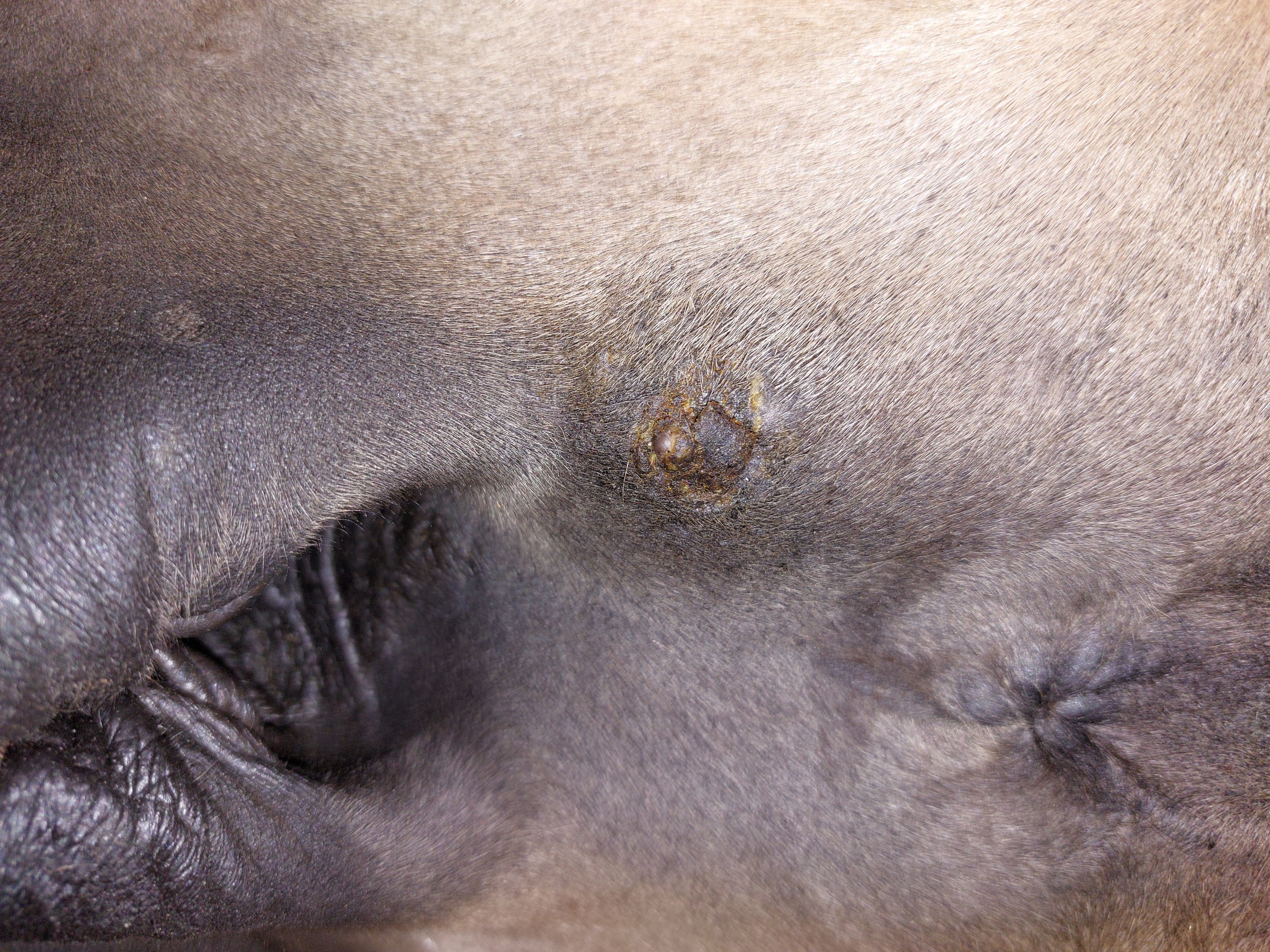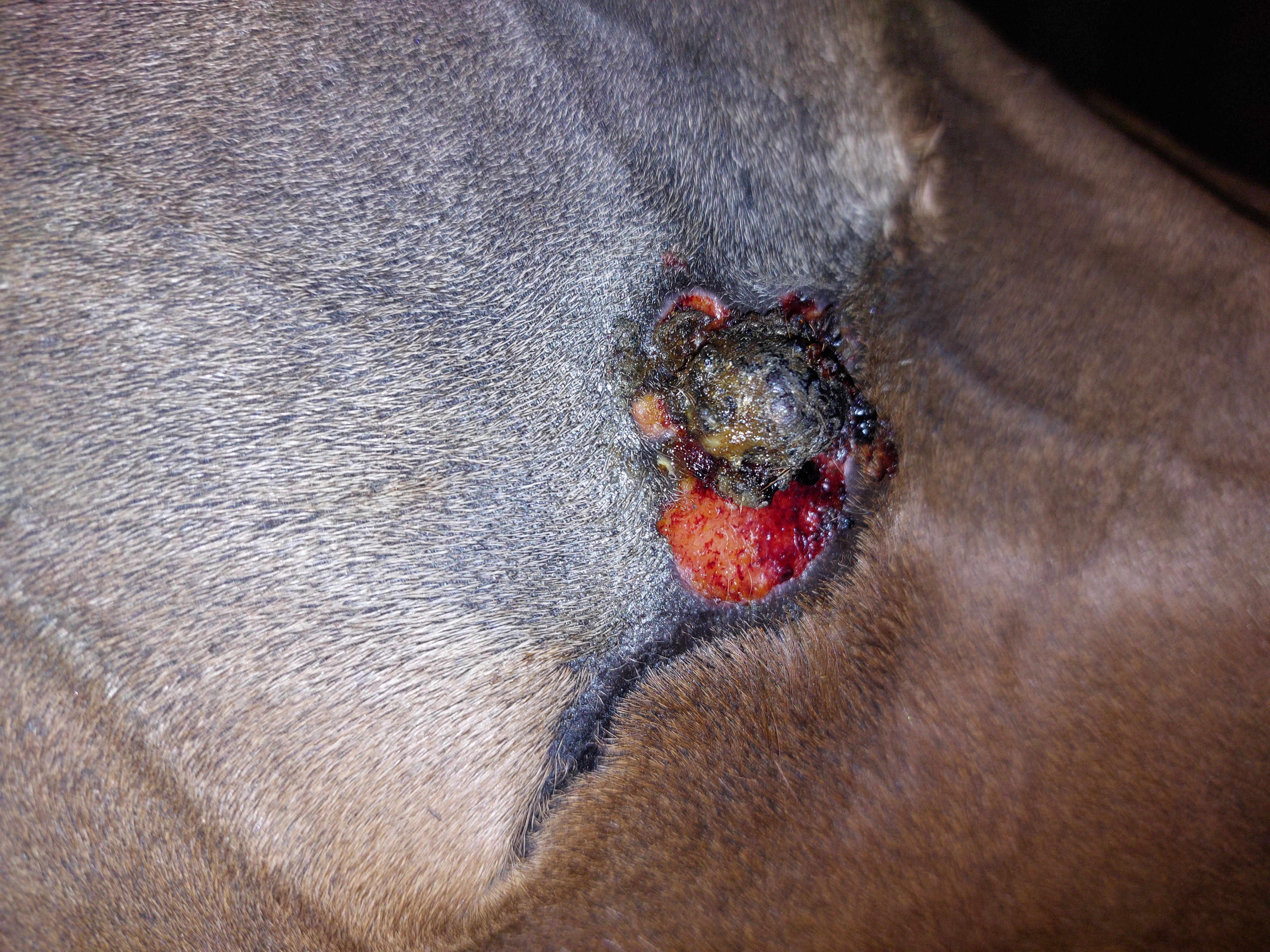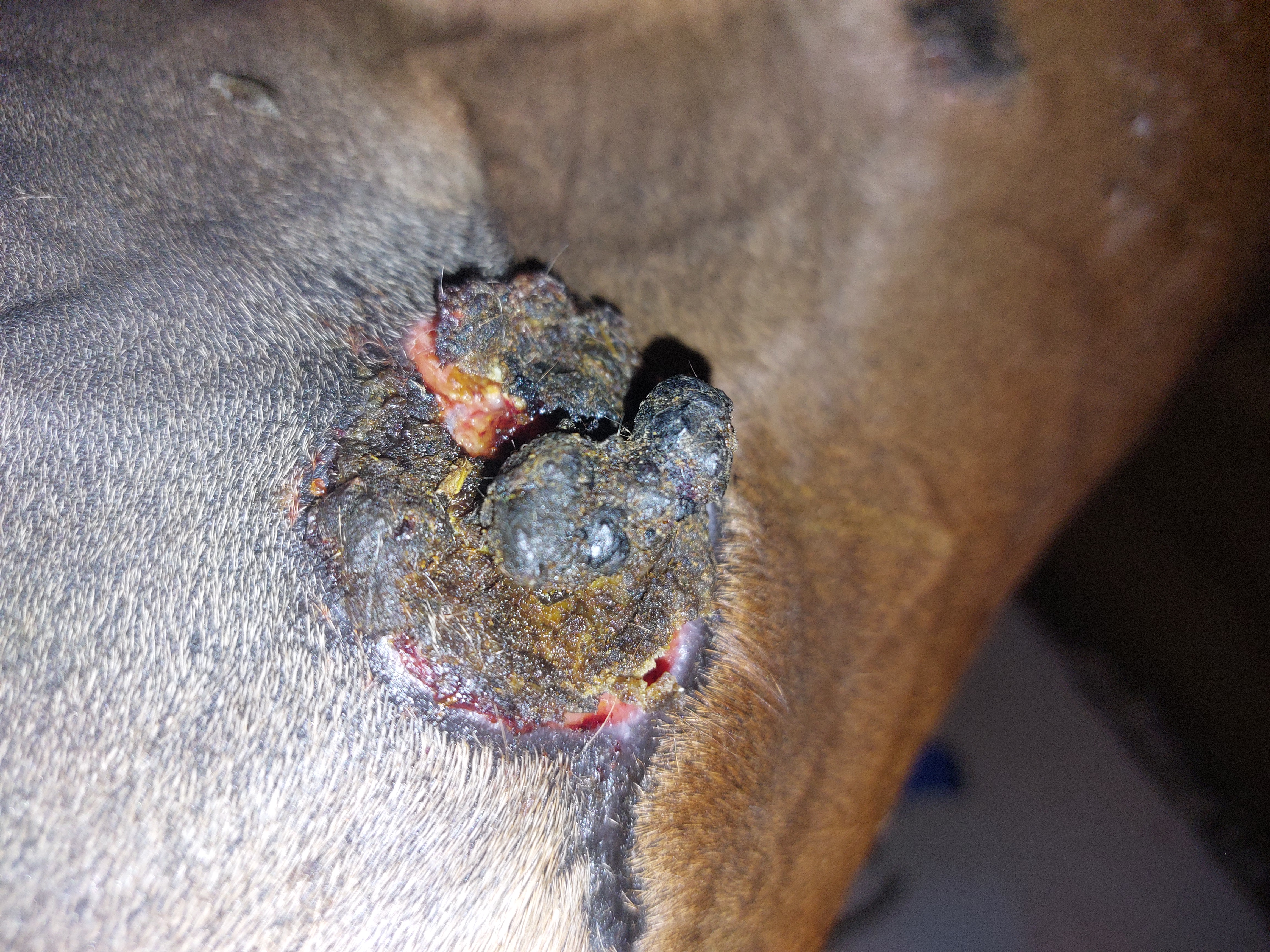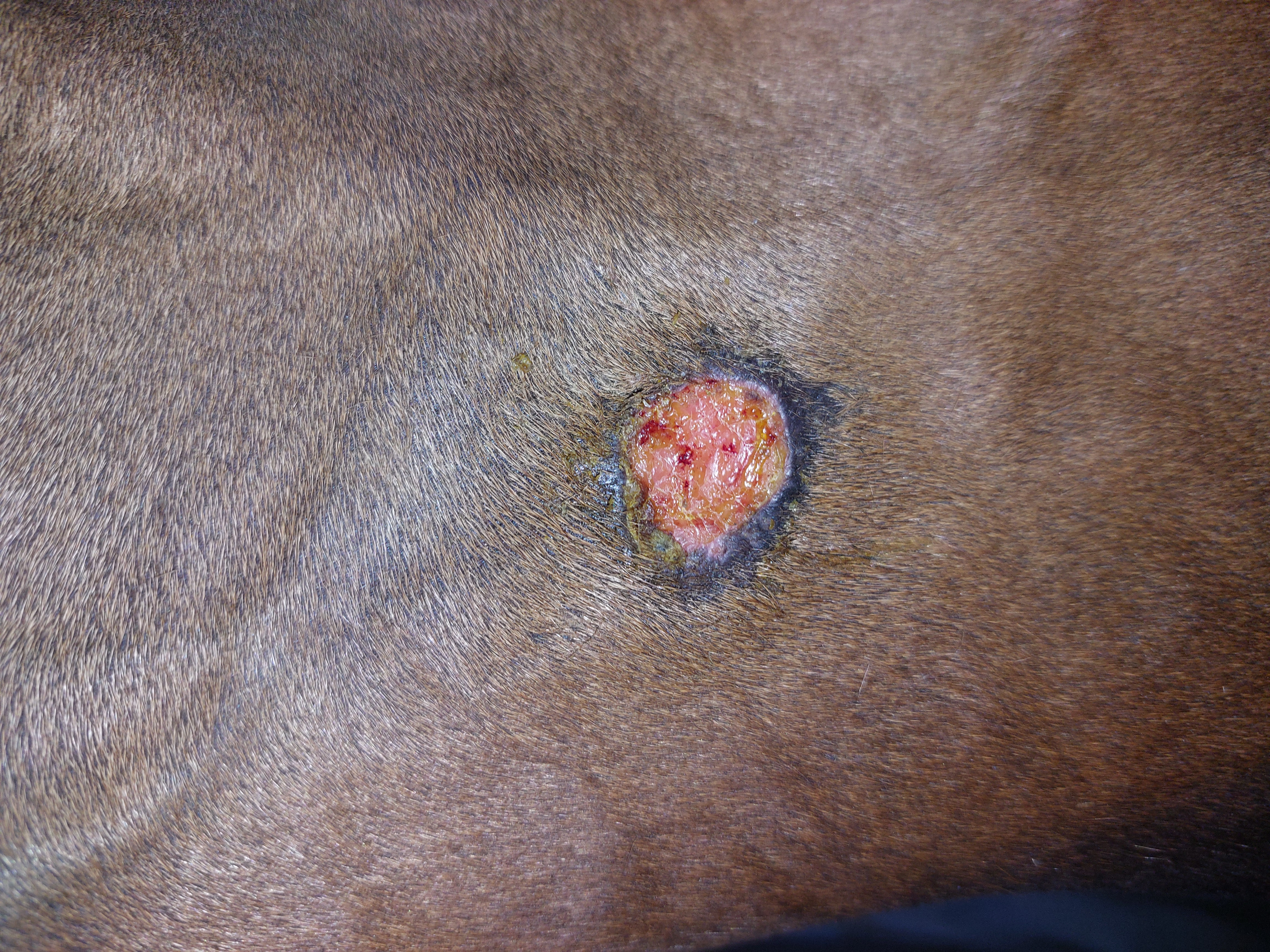 Hier gleich einmal der Stand von gestern, ich wage mich schon etwas zu freuen, denn ich finde sowohl vorne in der Achsel als auch am Hinterbein ist schon etwas gesunder Wundrand zu sehen.