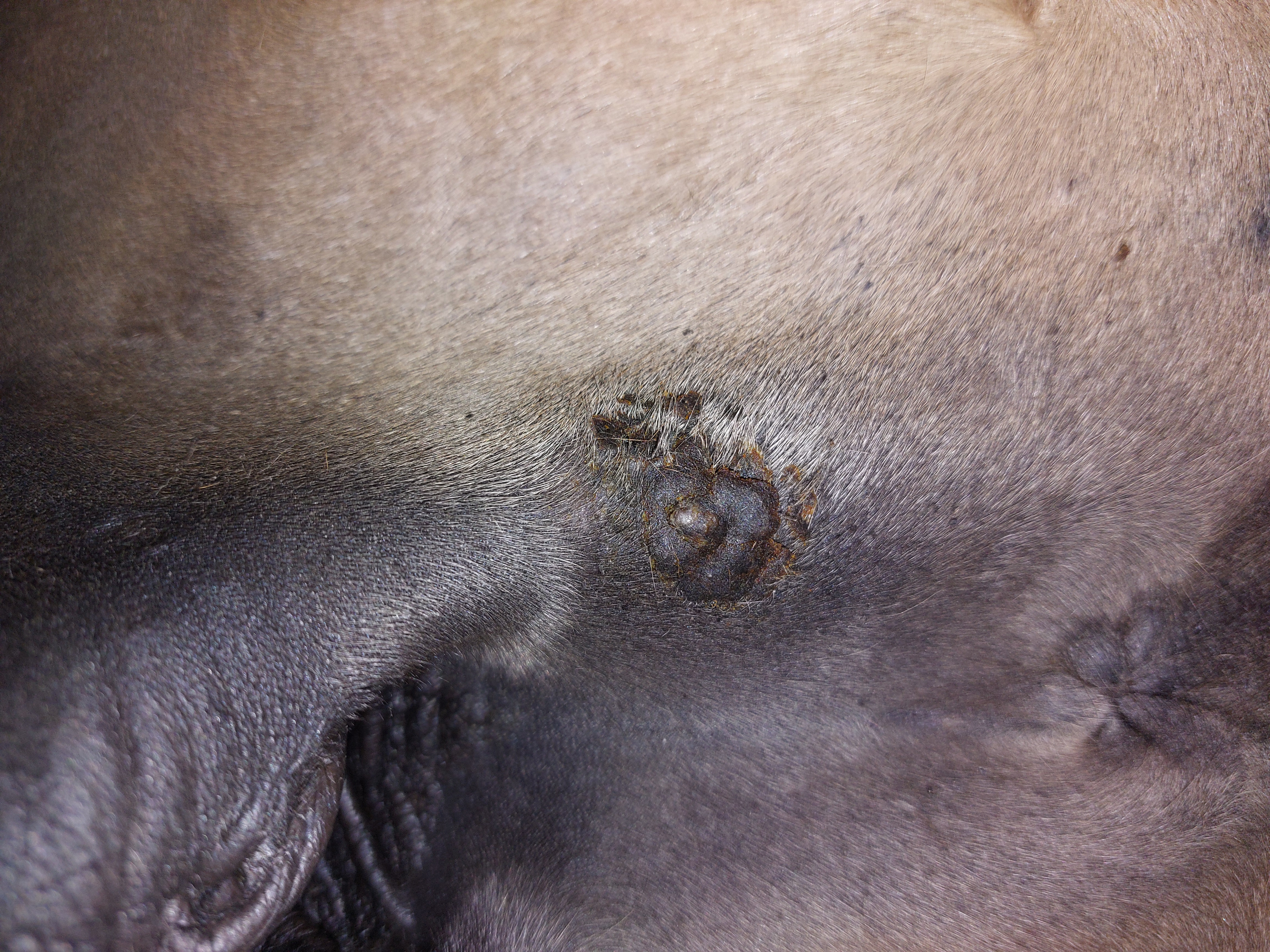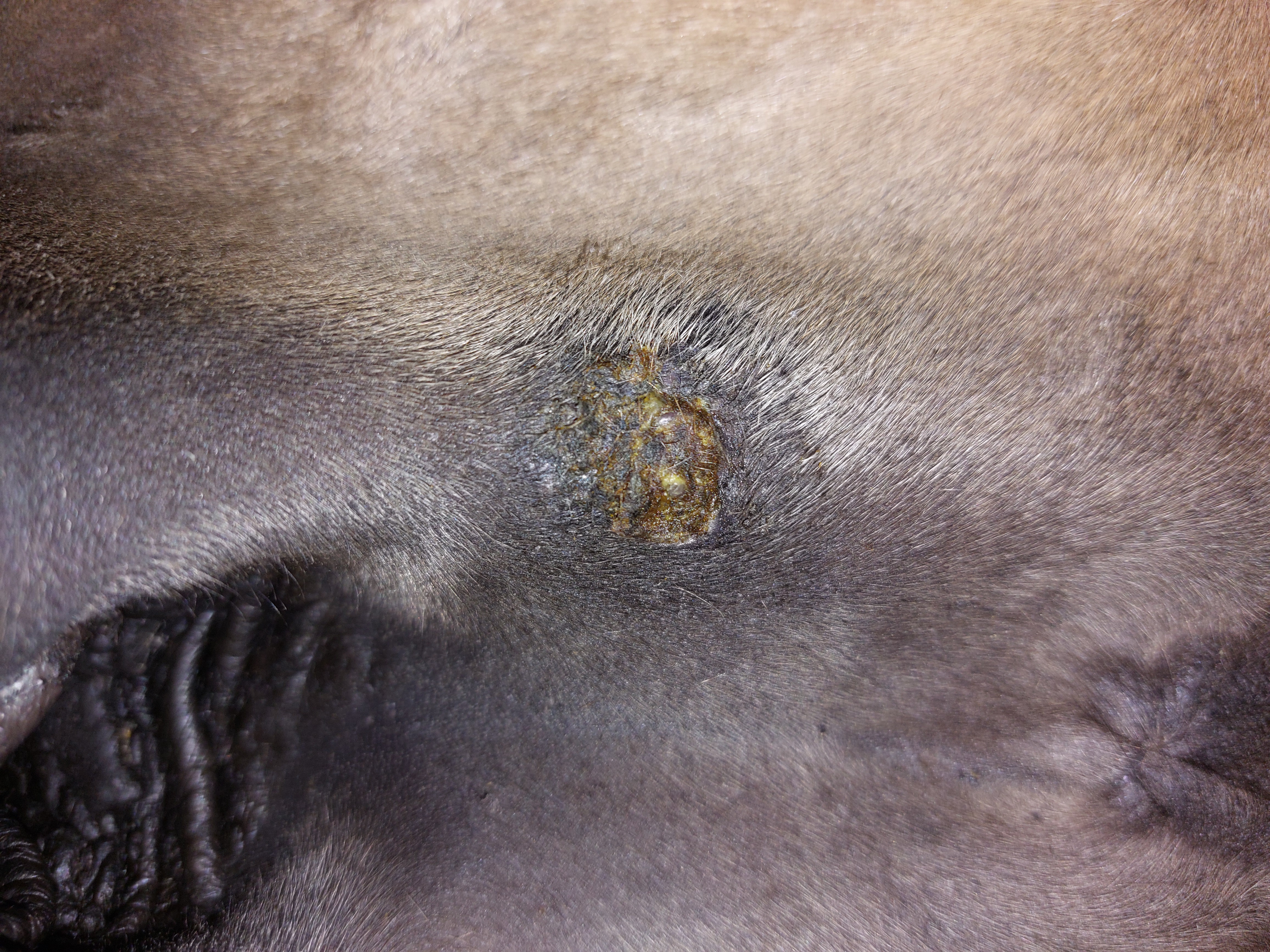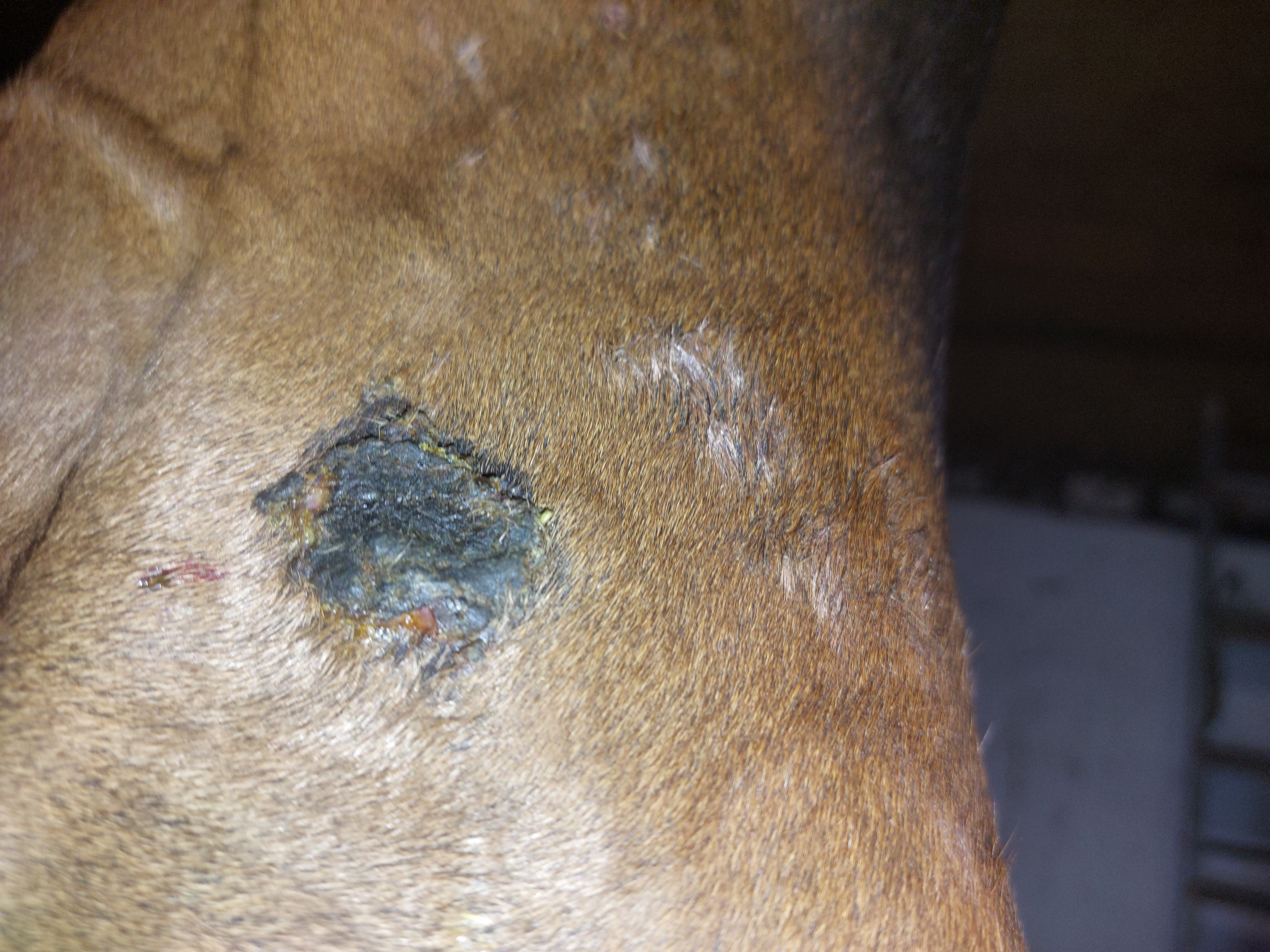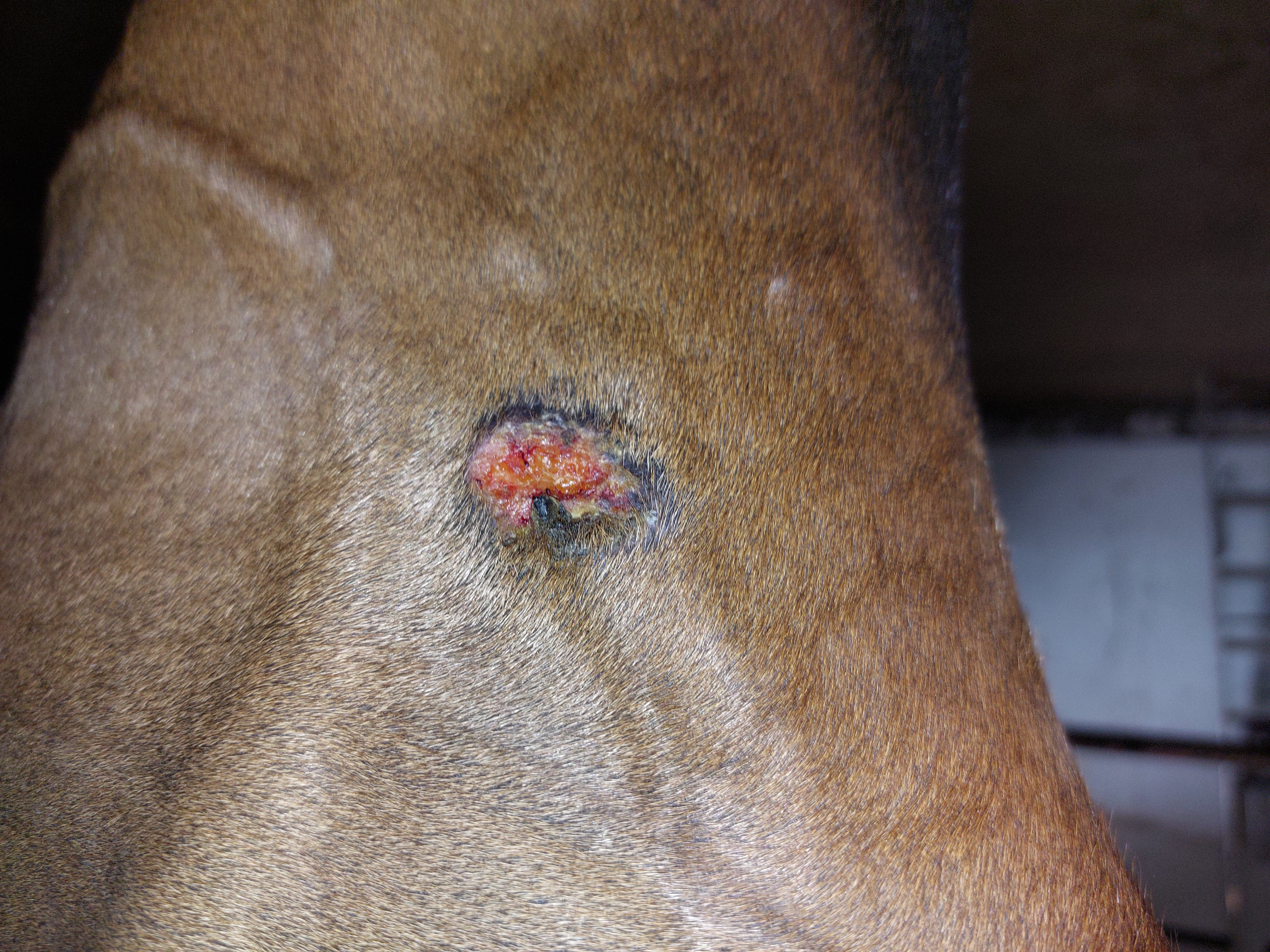 Die Stelle in der Gurtlage lässt sich leider sehr schwer fotografieren, ich müsste sie vermutlich sonst mal rasieren. Auf dem Foto lässt sich der Knubbel mehr erahnen als das er sichtbar geworden ist. Er liegt aber im Grunde wie zunächst bei dem an der Schlauchtasche noch unter der Haut, ist also noch nich fibroblastisch. Von daher würde ich tatsächlich auch befürchten, dass der vom Schmieren länger braucht und habe natürlich Sorge, dass Jaro dann wieder fit zum Reiten wäre, wir aber nicht mit Training starten können, weil er dort dann zu empfindlich für den Sattelgurt wird.