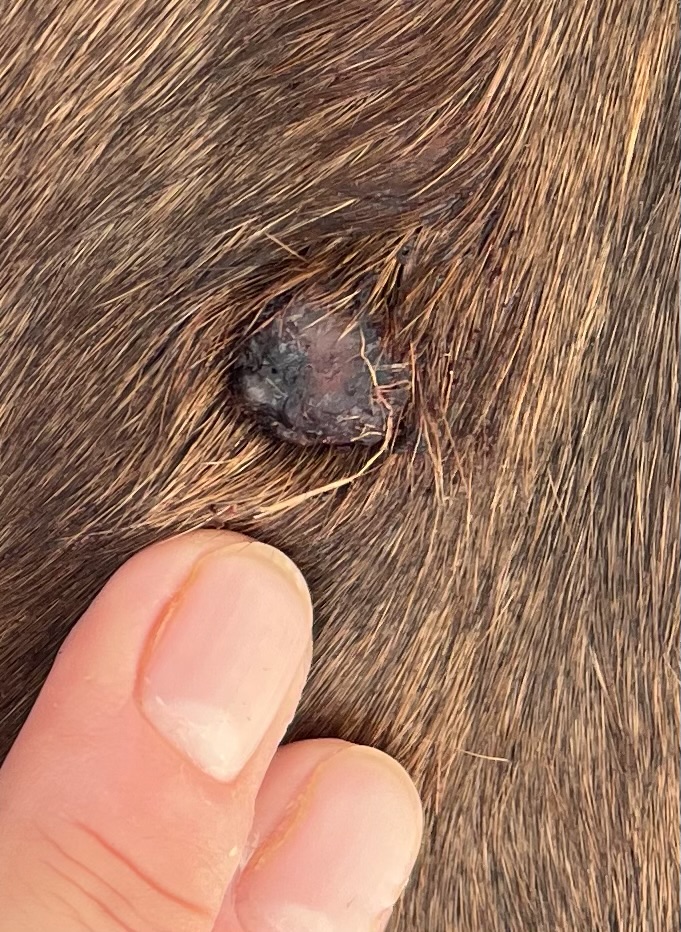 danach: Nochmal sauber gemacht (leicht blutig) und noch mal Salbe drauf. Die ist durch die Wärme sehr dünnflüssig.