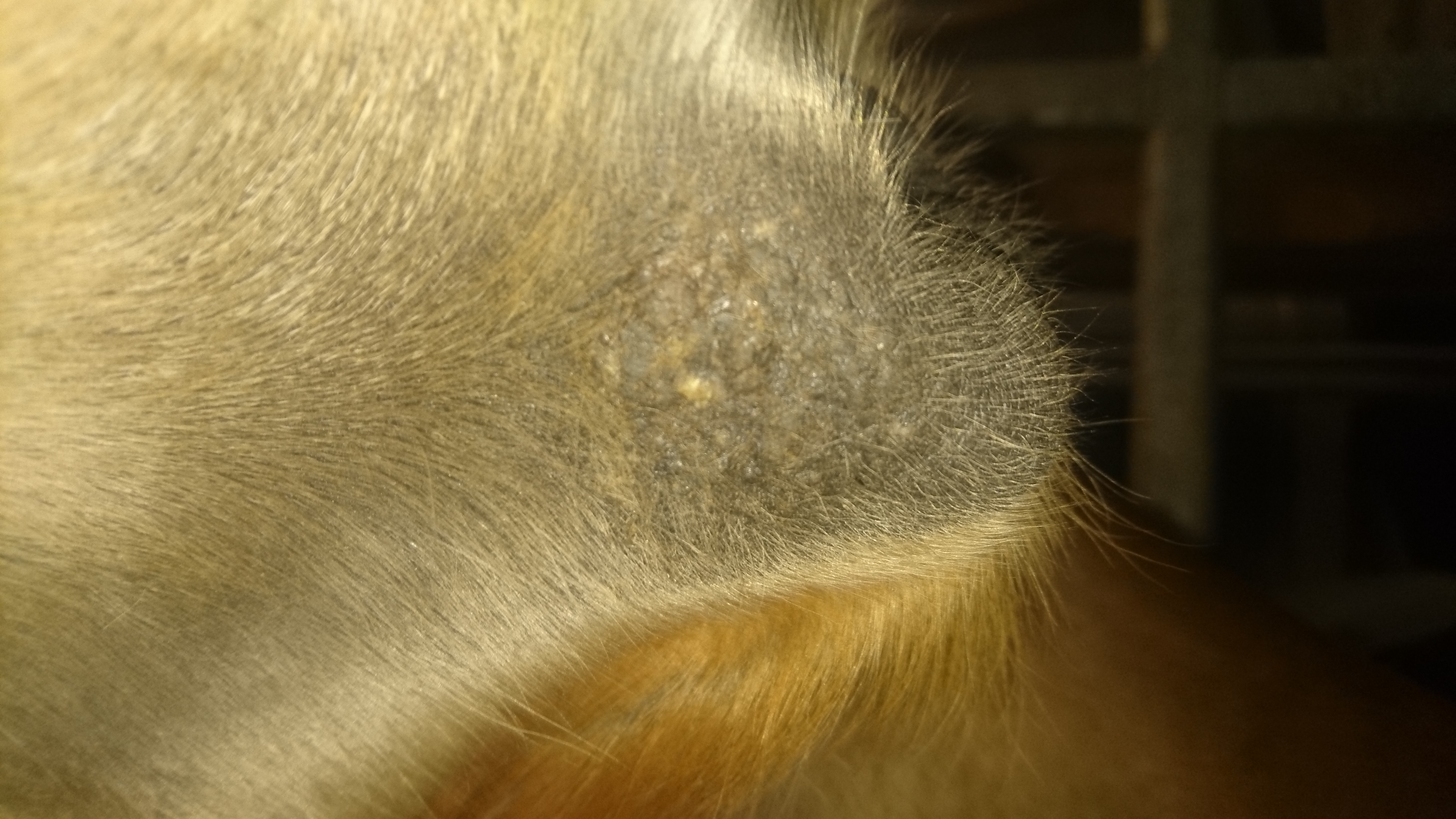 Bild 1 und 2 sehen eigentlich nach Kruste aus (wobei bei Bild 1 so helle Flecken an der Bauchnaht sind - ist das auch Sarkoid? abgeheiltes Sarkiod? abgefallene Kruste? auf dem Bild scheinen mehrere Baustellen zu sein)