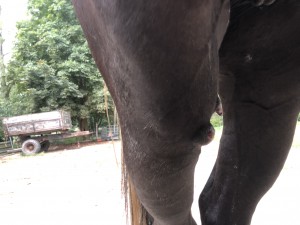 Tag 5: Das offene Sarkoid hat eine dunkle Kruste, aber noch nicht 100%ig durchgehend deshalb wird geschmiert. Das Mini-Sarkoid, was abgefallen ist, ist jetzt durchgehend gekrustet und hat Pause - das ging ja wirklich fix.