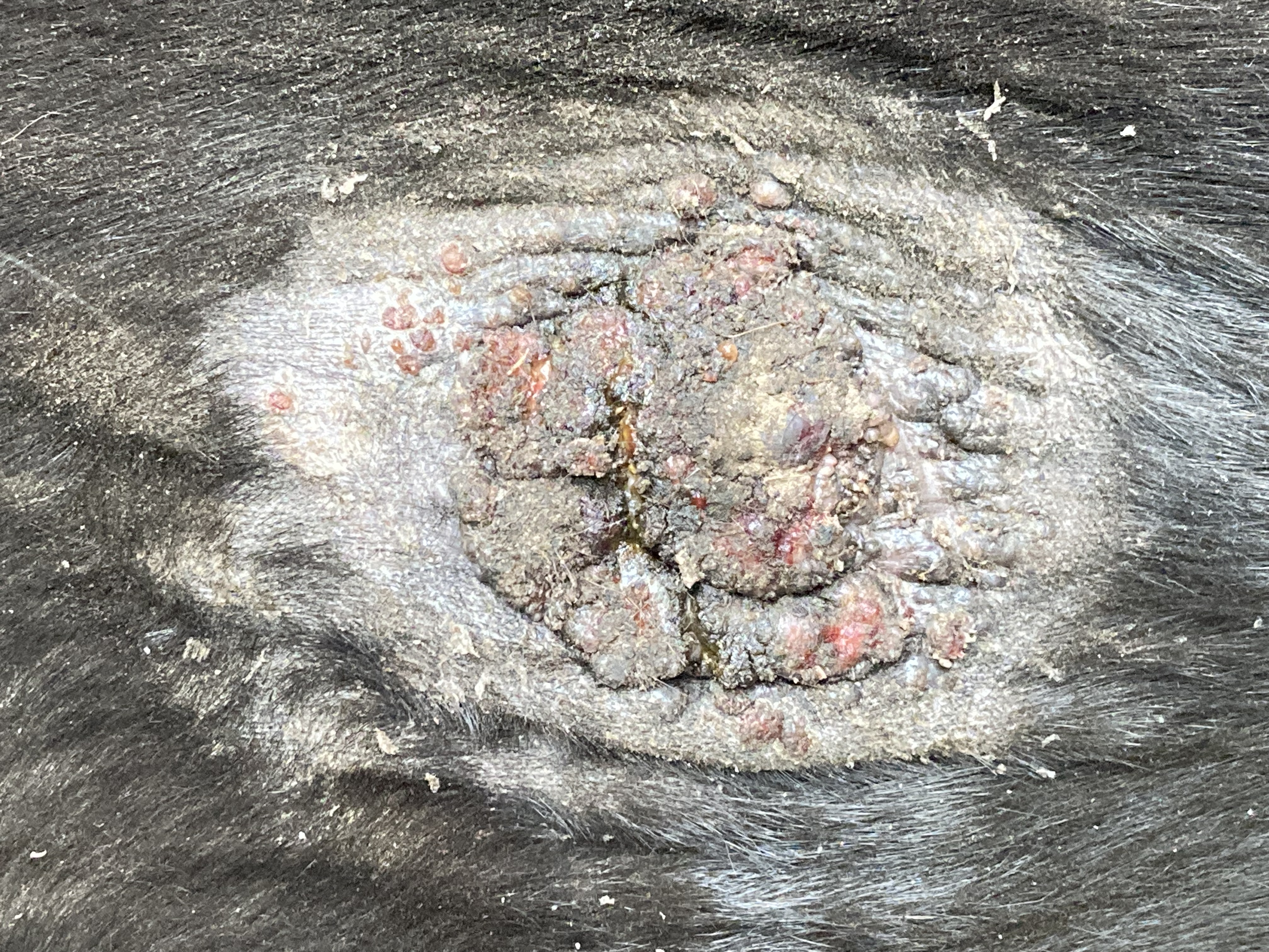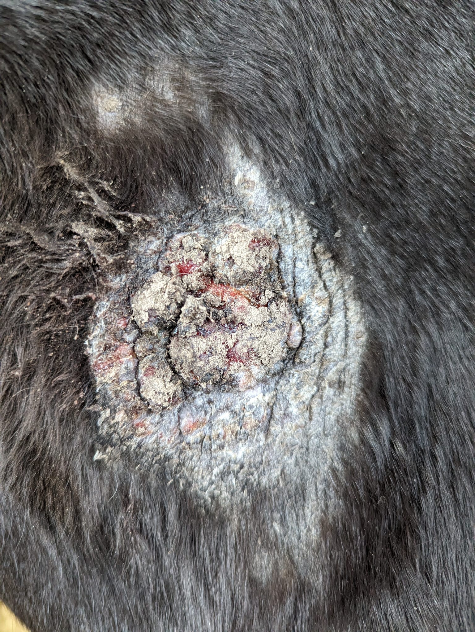 . Schmiere weiterhin im Wechsel mit 1:2 und 1:5. Anbei ein Bild von heute. Glaub durch das Kratzen verteilt sie die Salbe auf die umliegende Haut.