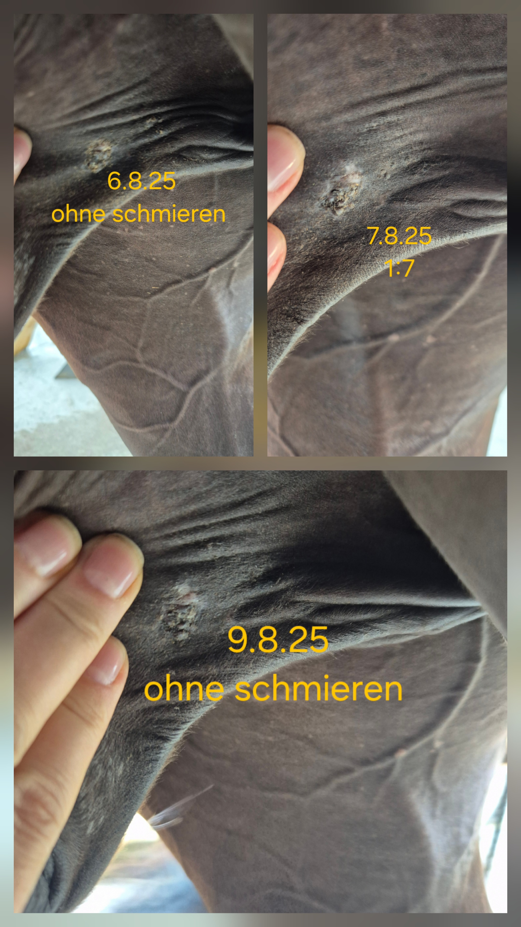 Es gibt jetzt 2 Möglichkeiten: entweder, Du machst mal ne Woche Pause und schmierst nur jeden 3. Tag 1:5, die restliche Zeit nix und zeigst es dann her. Oder Du haust gleich nochmal drauf mit 1:1 oder 1:0,5 (fast pur) und erzeugst nochmal ne richtige Kruste. Am Schlauch wäre meine Tendenz zu mehr verdünnen, an der Brust musst Du das entscheiden, da Du eher einschätzen kannst, was von beidem zutrifft. Musst Du nach Gefühl machen. Bei einer Woche machst Du egal wie Du Dich entscheidest, nix kaputt. Also hör auf den Bauch und was er sagt, wird gemacht.