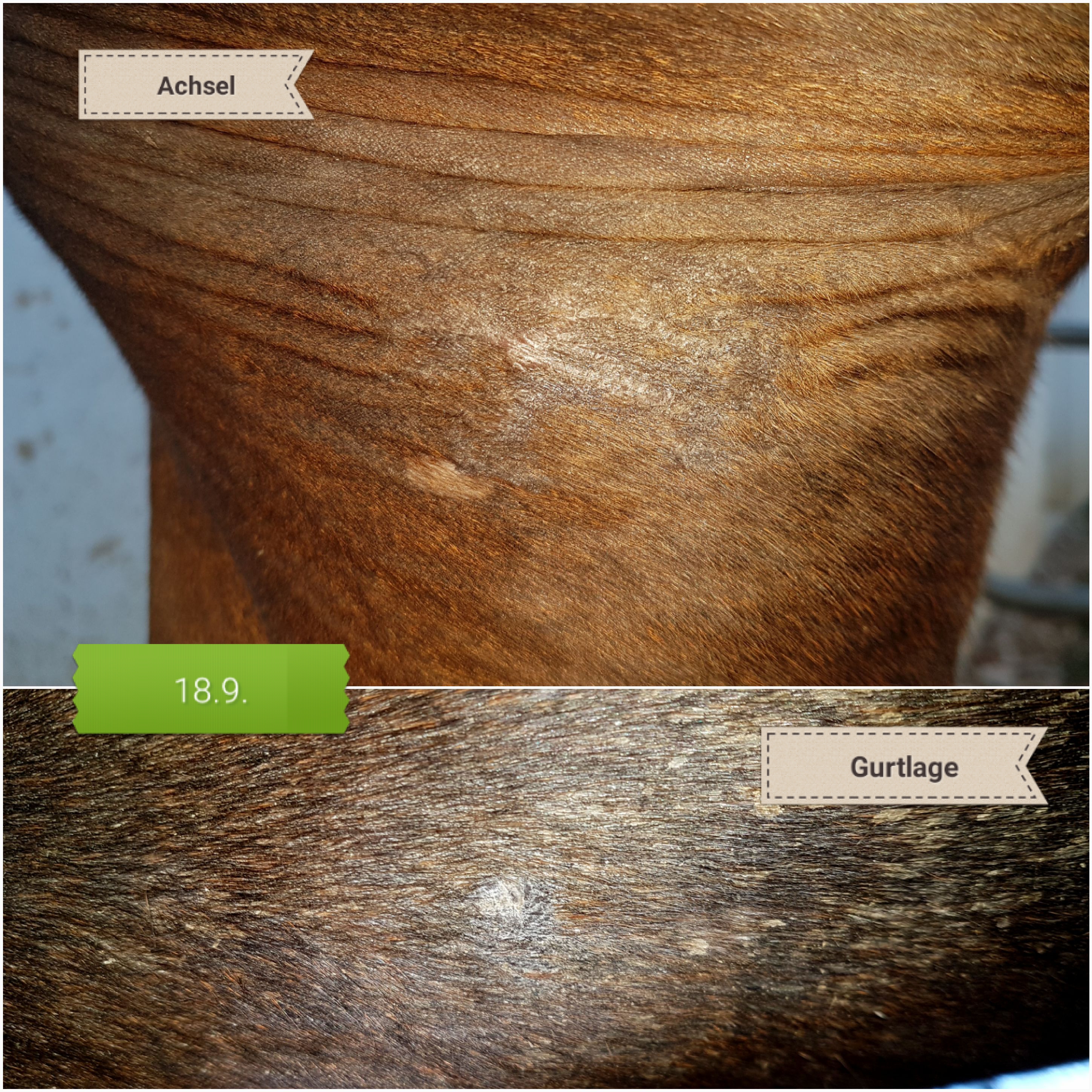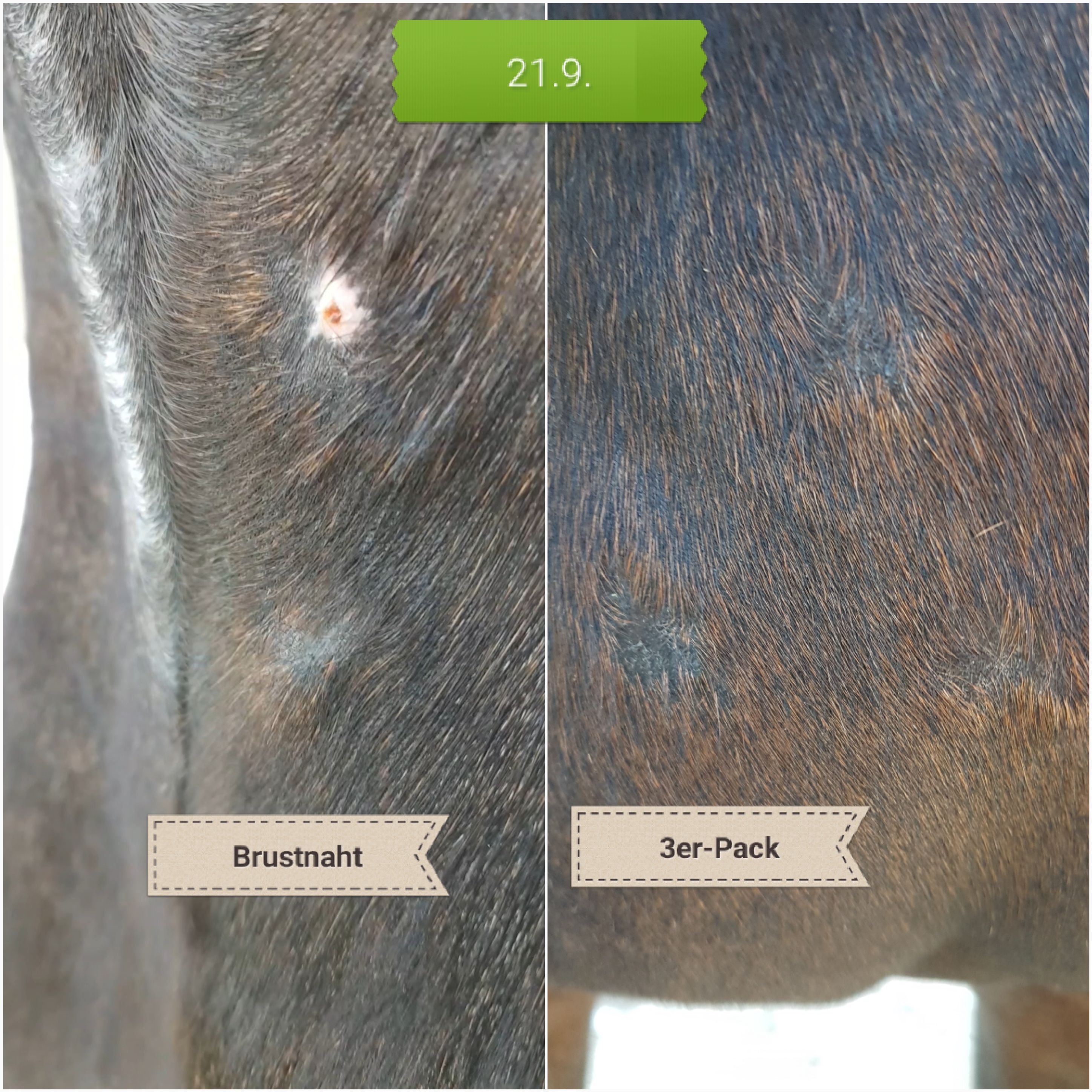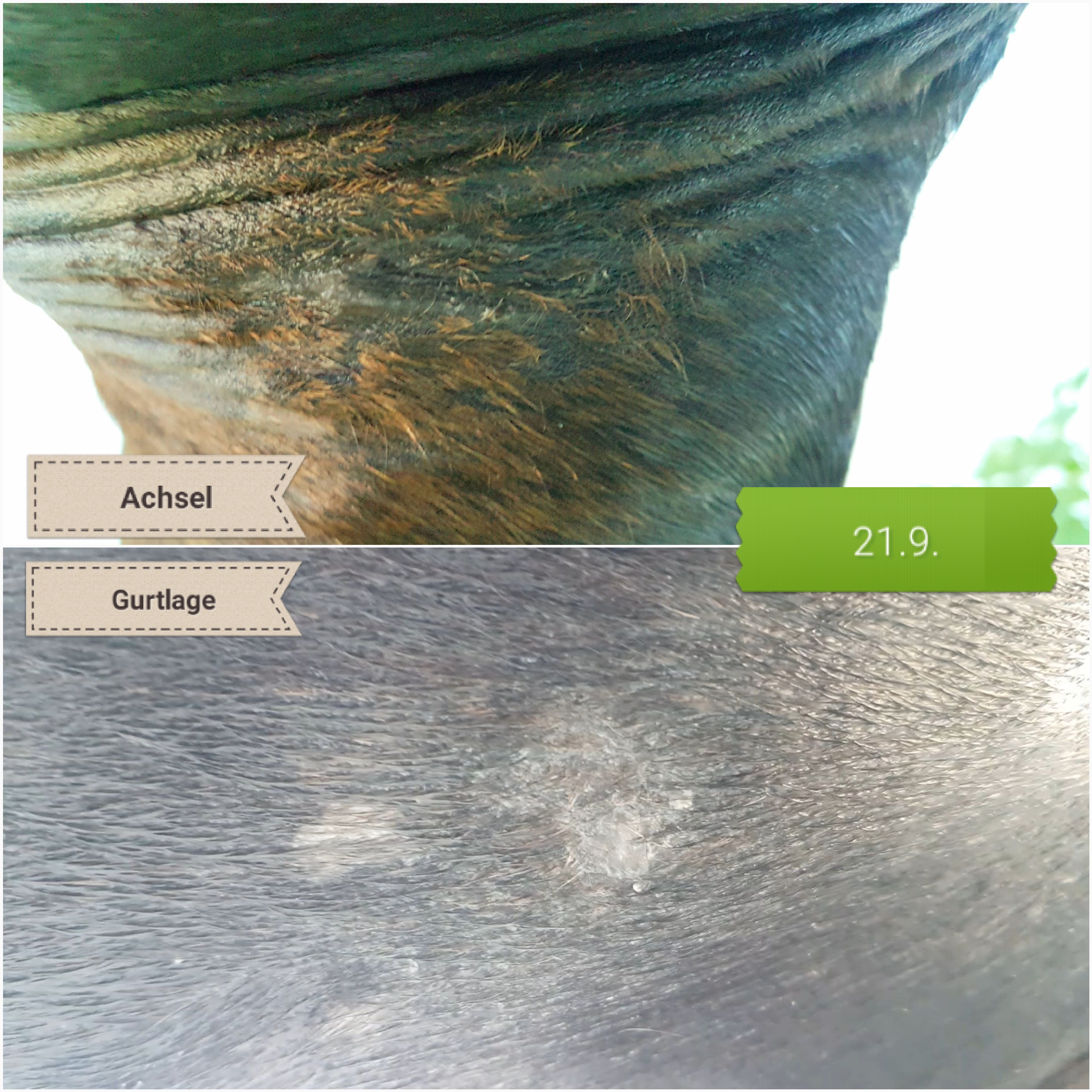 In der Achsel sprießt es schon munter. Hier fühlt es sich noch nicht 100%ig weich an, aber das könnte auch etwas narbig sein. Dito in der Gurtlage. Viel ist da nicht mehr, aber ob die vordere Ecke noch Sarkoid ist oder einfach noch etwas Ruhe braucht? Keine Ahnung. Wird sich zeigen.