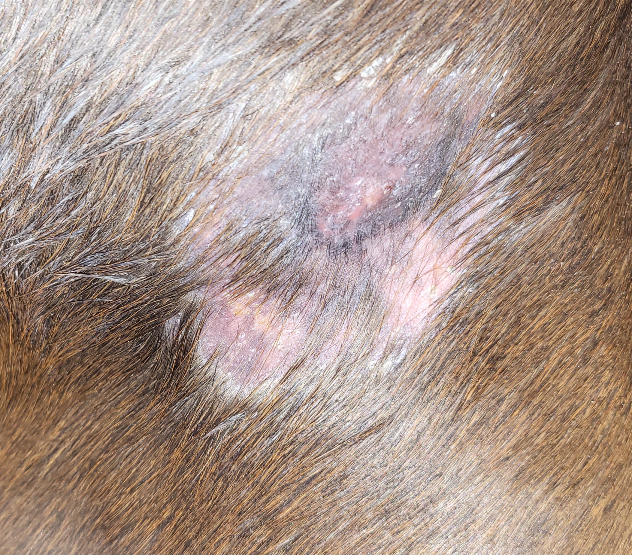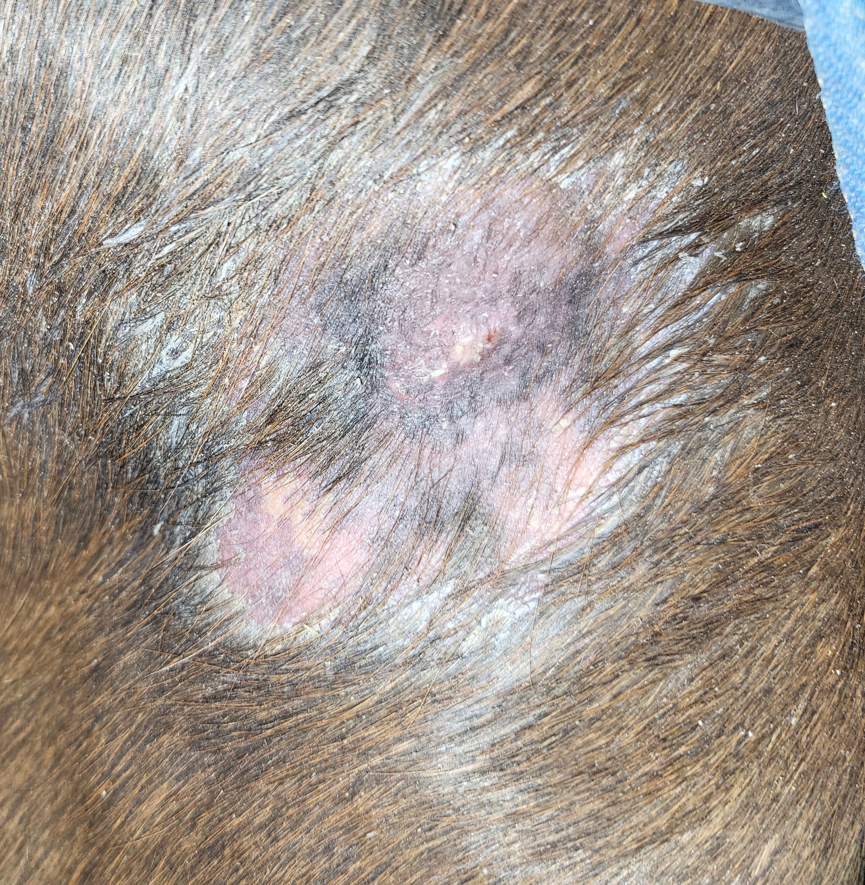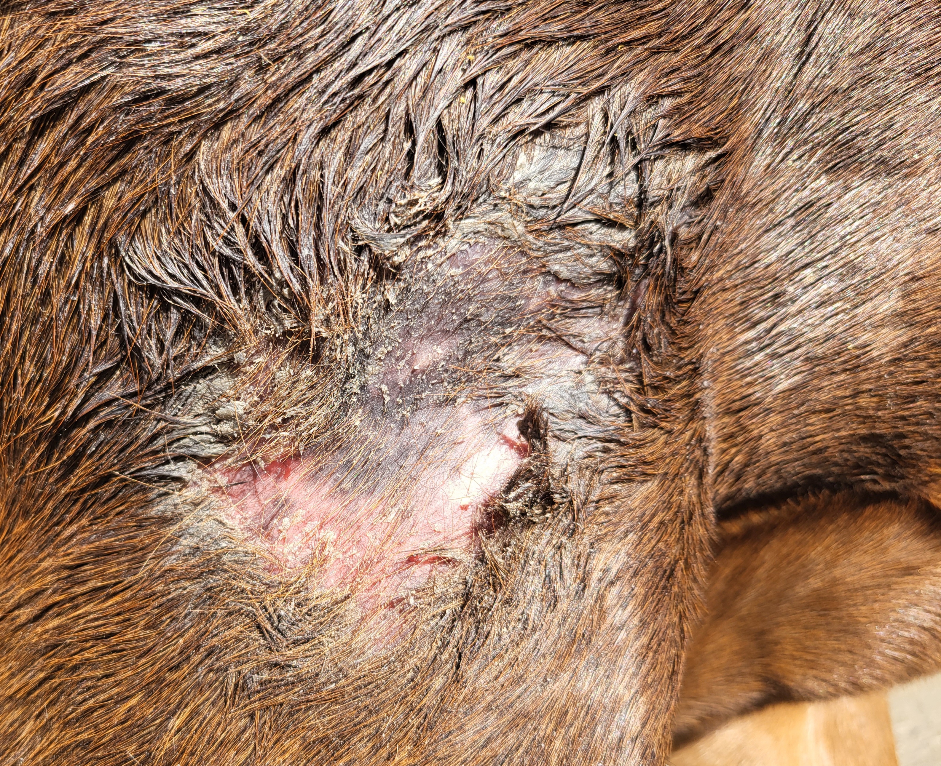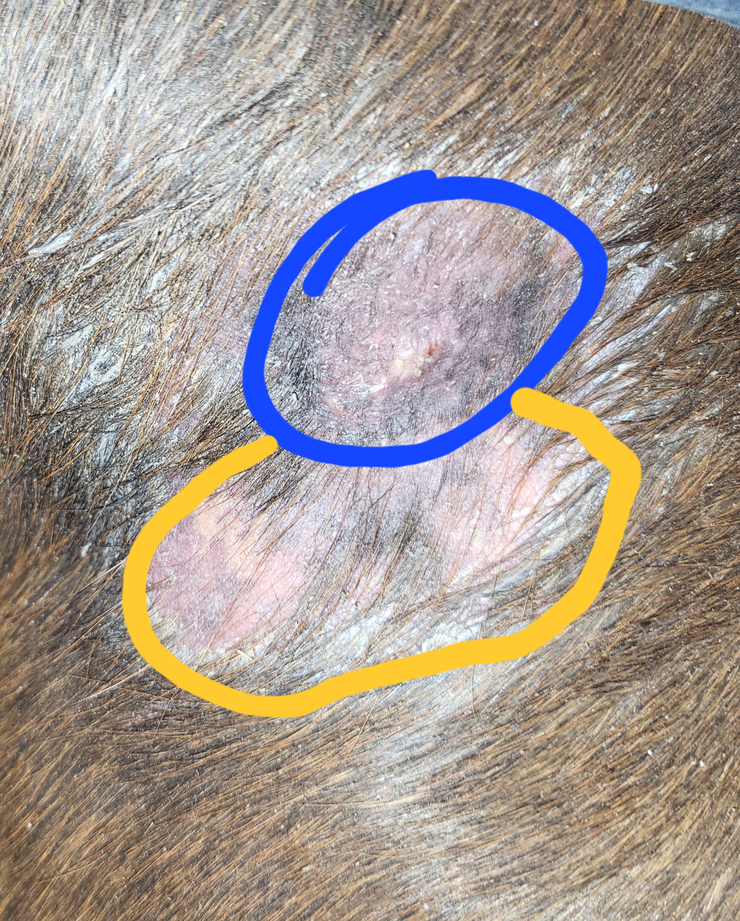 Ansonsten sieht alles wirklich gut aus. In der Mitte von dem blauen Kringel, sieht es so aus, als ob noch was "hochstehen" würde. Das könnte noch ein Rest sein und das würde ich auch noch weiter 1x pro Woche tupfen. Kannst den Rest drumrum ja mit Vaseline abdecken, dass sich die Creme nicht verteilt.