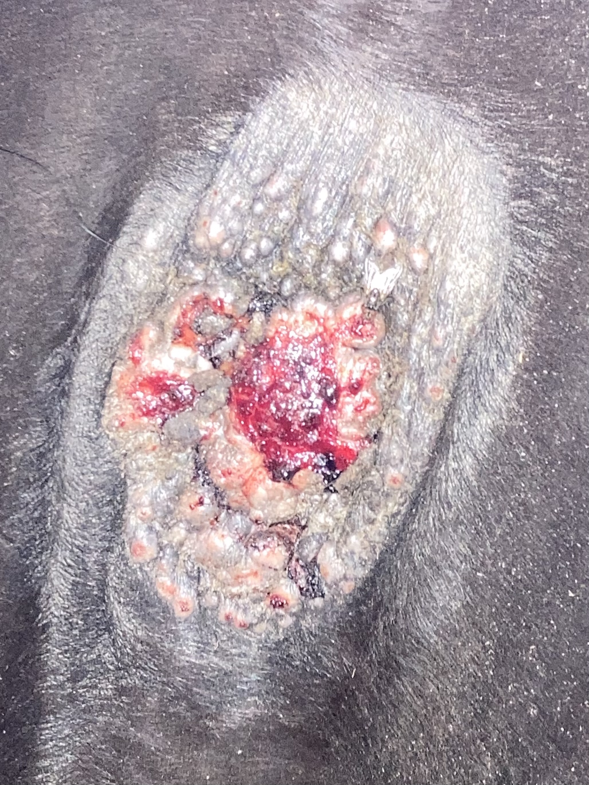 Ihr Lieben. Nun war ich sehr mutig und habe heute Mittag ganz dünn 1:2 auf die gesamte Fläche aufgetragen und nun schaut es so aus. Denke sie hat wieder gekratzt. Aber ich glaube auch, dass die kleinen Hubbels auch Sarkoide sind.