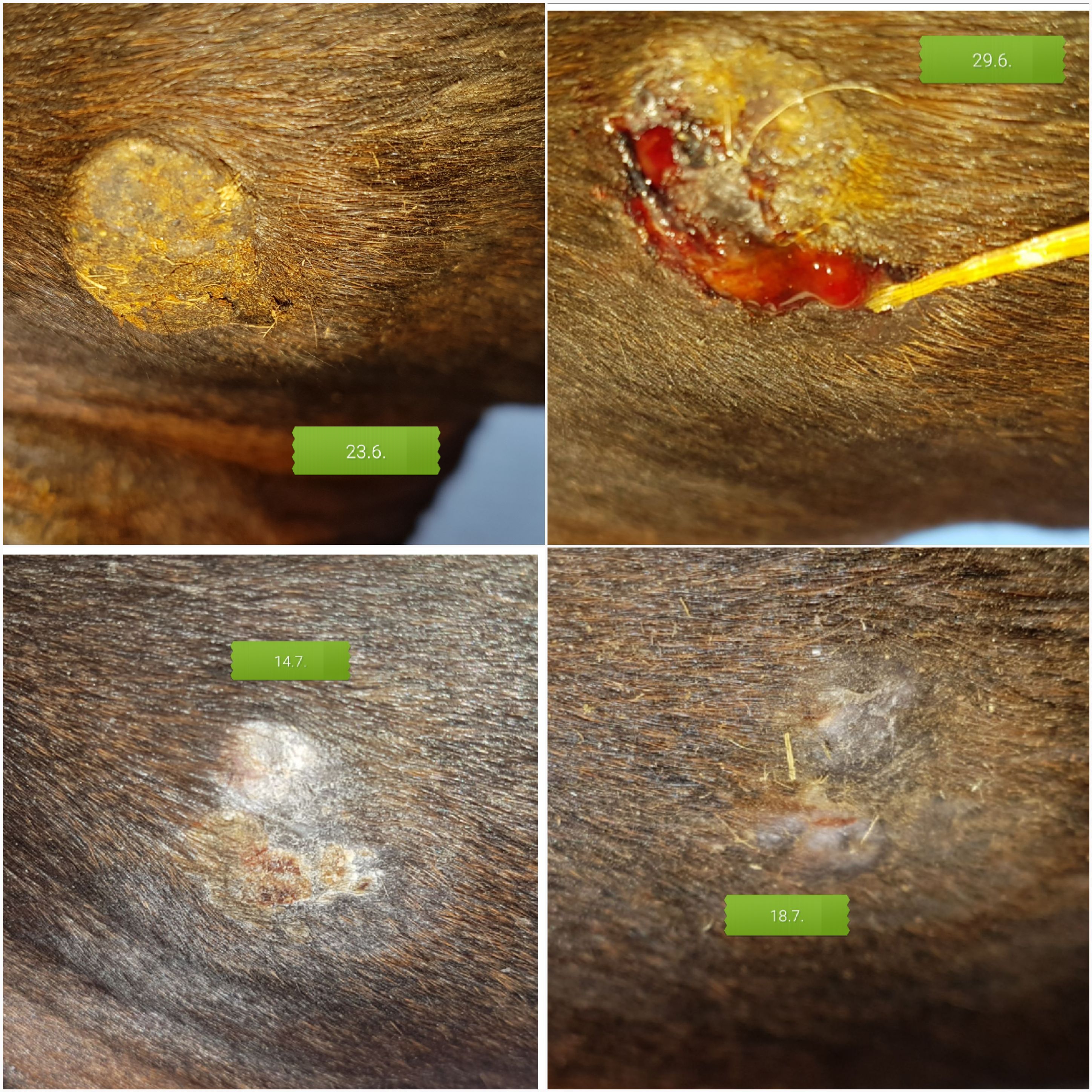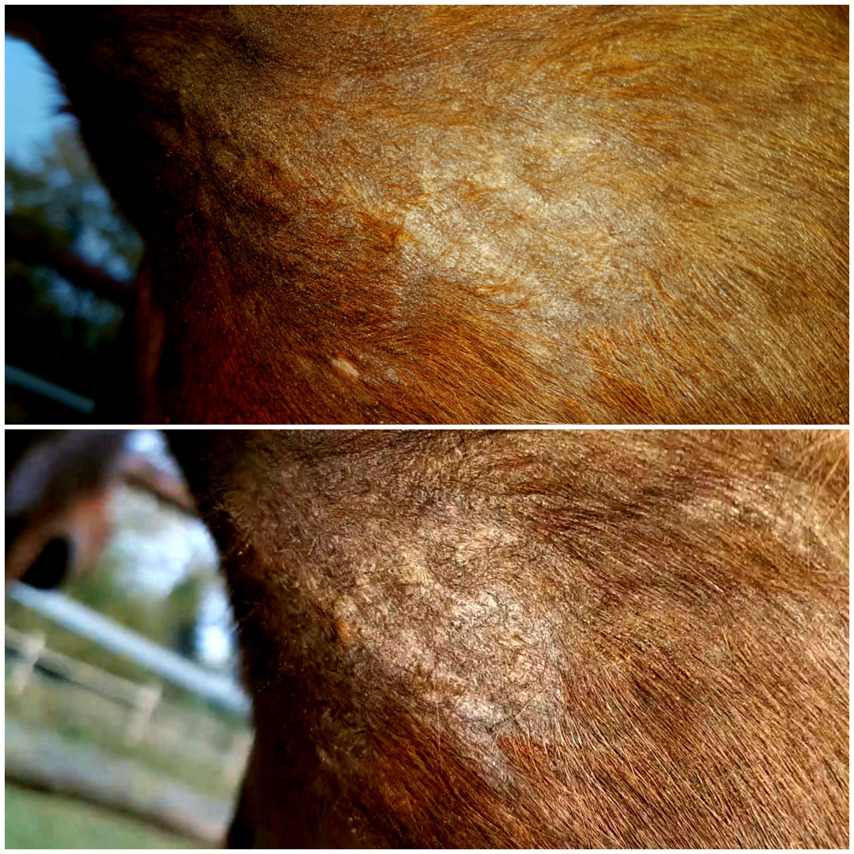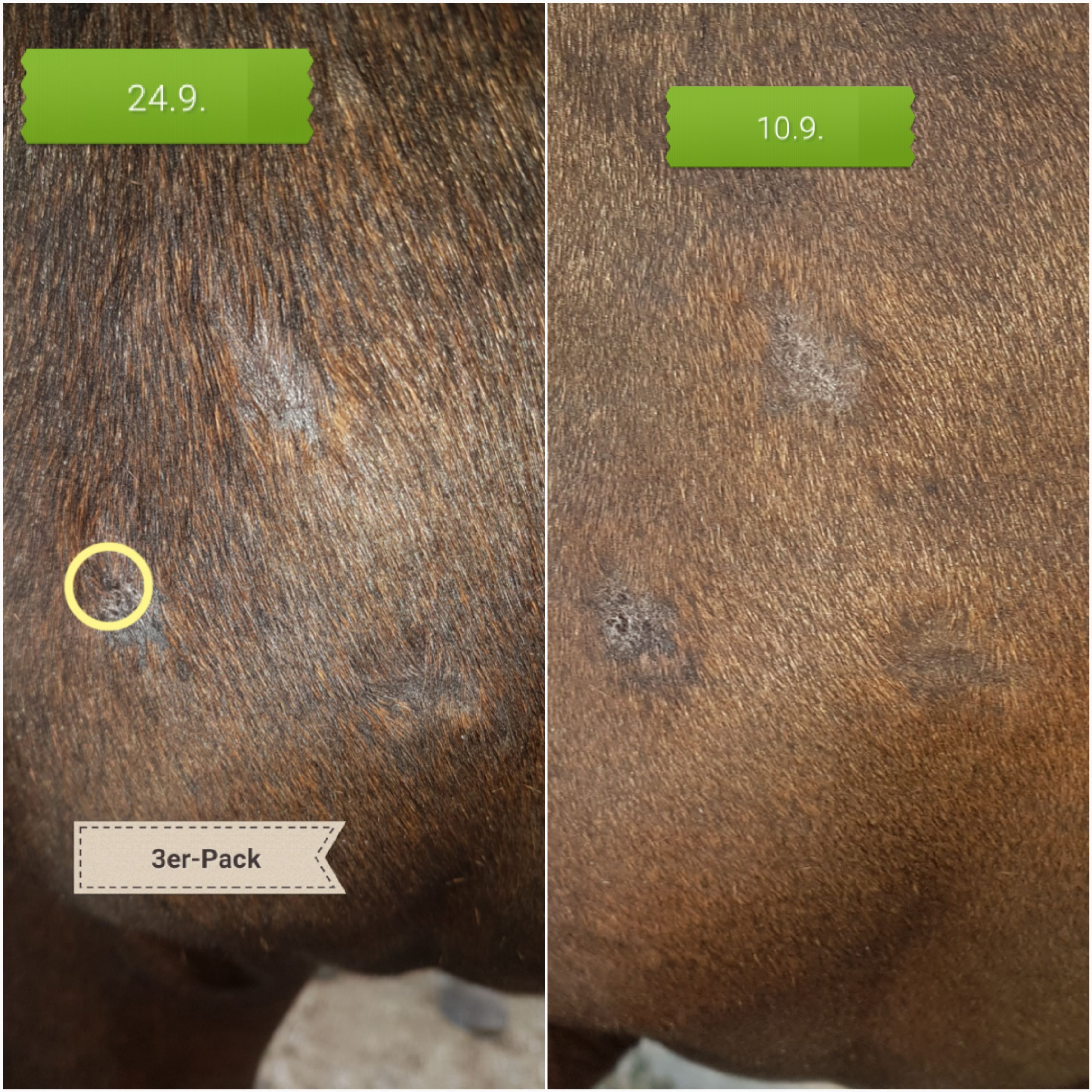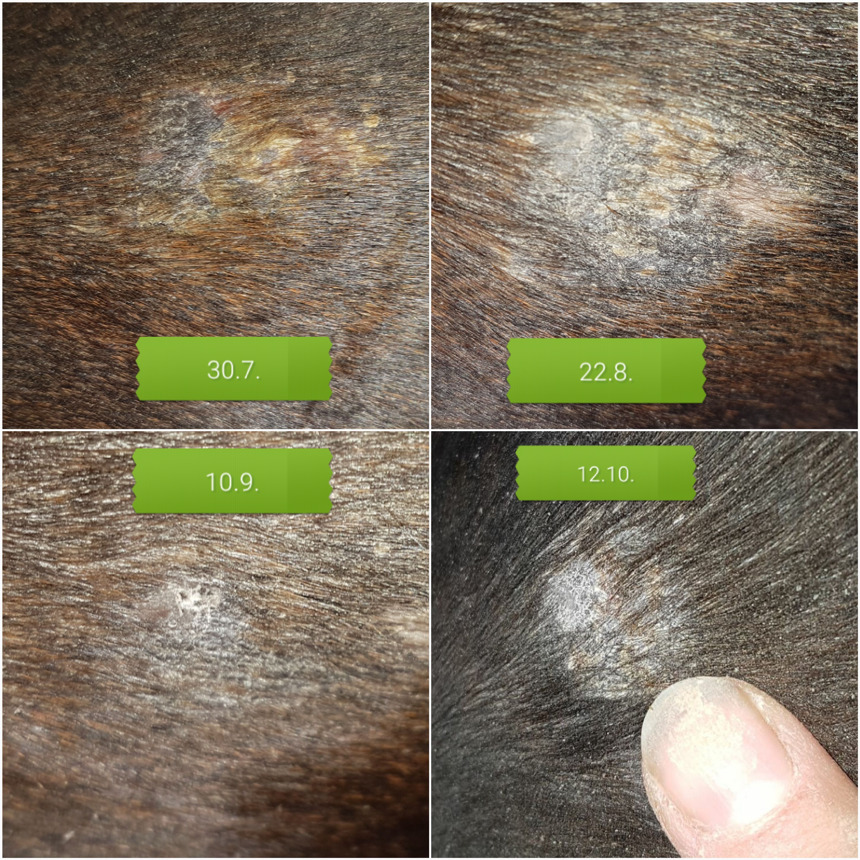 Und hier nochmal für alle Mitleser eine Bilderfolge der Gurtlage. Was meint Ihr? Am 18.7. sah es schon so gut wie erledigt aus. Nachdem die Ecke sich dann aber als hartnäckig gezeigt hat, habe ich nochmal ne pure Behandlung gestartet, als dann aber wieder großflächig alles haarlos war, bin ich auf verdünnt/Wundbehandlung umgestiegen bis ca. 10.9. und dann doch nochmal auf pur, weil die Ecke blieb. Jetzt bin ich ratlos, weil es am 18.7. im Nachhinein betrachtet eigentlich am Besten ausgesehen hat. Was sagt Ihr?