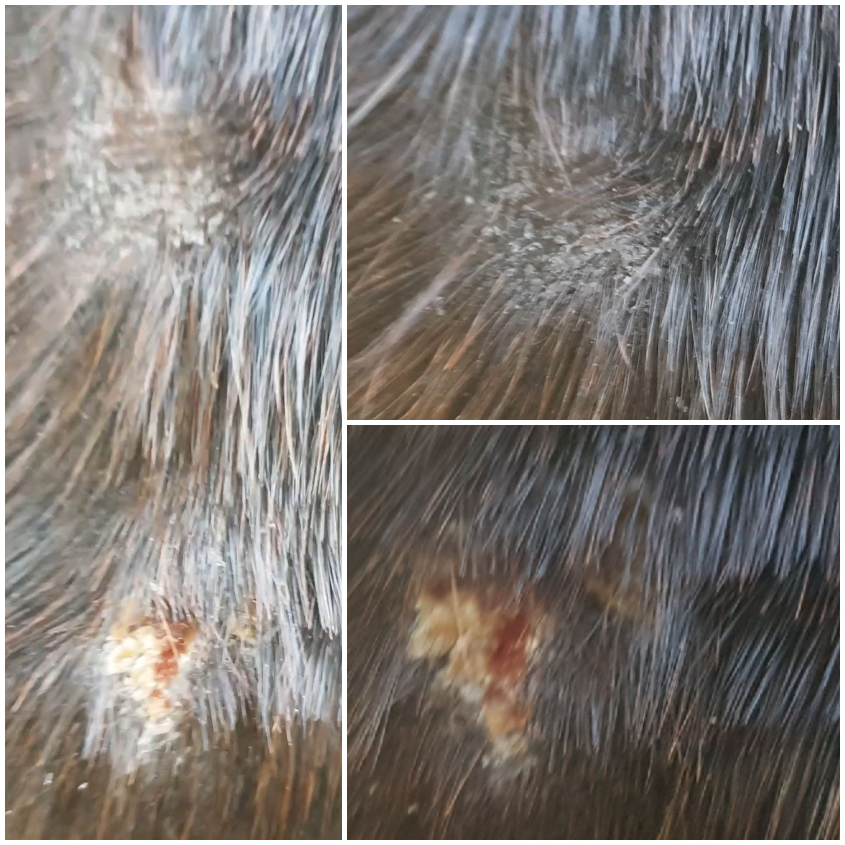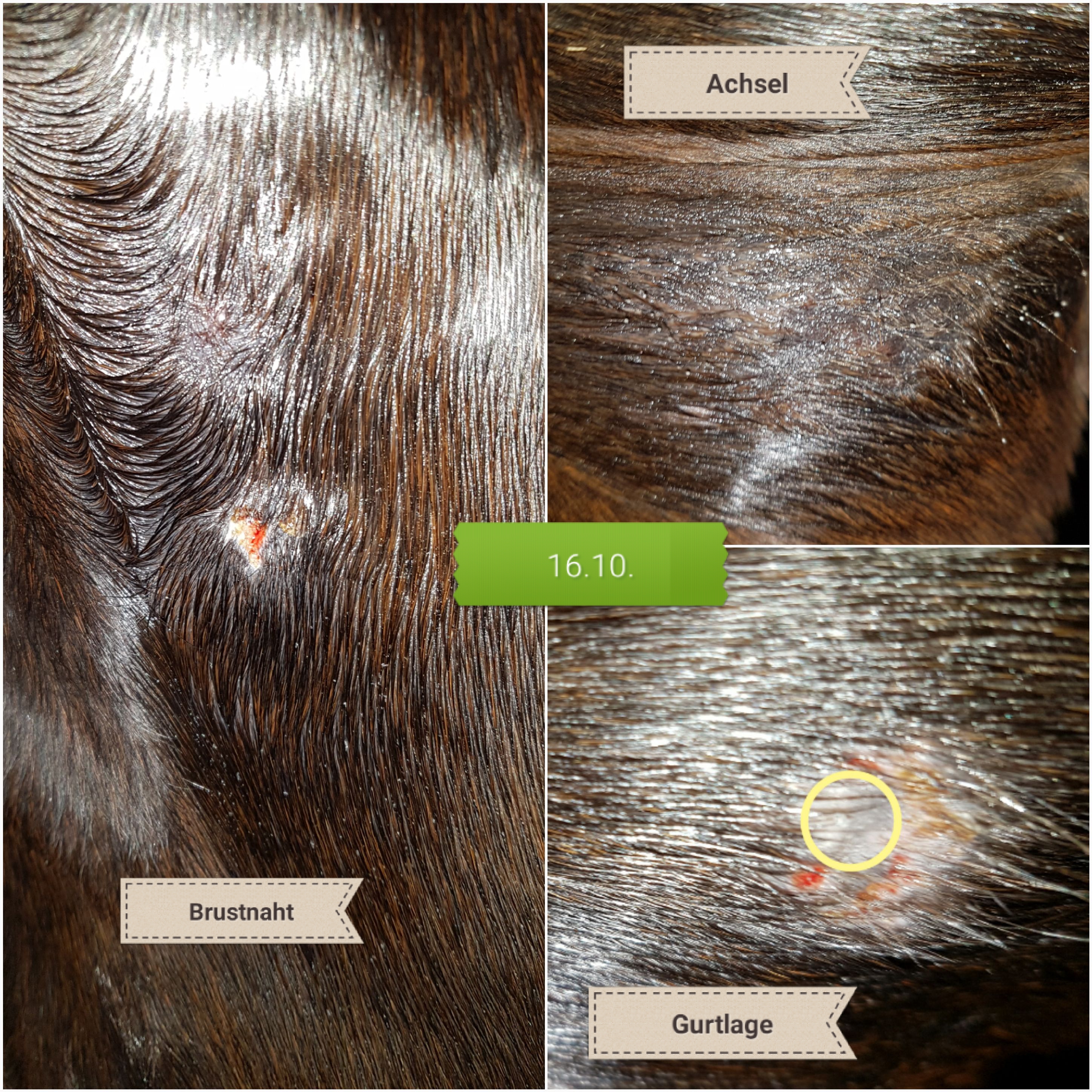 Heutige Bilder. Habe überall die Krusten runtergewaschen. An der Gurtlage waren überall dort Krusten, wo eigentlich gar kein Sarkoid ist. Die eigentlich verdächtige Stelle (gelb eingekreist) hat nicht gekrustet. Ich geh inzwischen tatsächlich eher davon aus, dass es Narbengewebe ist. An der Brust hat sie noch Krusten/blutige Stellen, aber 15 cm drüber hat sie nochmal eine haarlos geschubberte Stelle, so dass ich auch hier denke, dass das die nervigen Kriebelmücken sind, die das Schubbern auslösen. Die Achsel sah vorgestern auch "verdächtig" rauh aus, aber nach einem Vollbad in Fliegenspray sieht heute alles ganz gut aus.