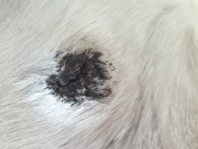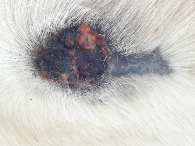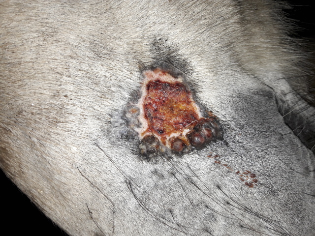 Von dem am Bauch habe ich keine Fotos. Da stand heute die Kruste schön hoch, dass ich darunter gleich schmieren konnte. Das an der Leiste ist total verkrustet. Da komme ich im Moment nicht zwischen :applaus: