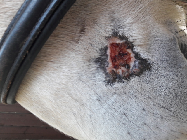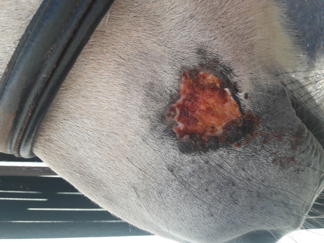 Heute sah das Sarkoid an der Nase wieder richtig super aus. Habe leider kein Foto gemacht. Es wirkte insgesamt etwas kleiner. Wir hatten anschließend einen schönen Herbstausritt! Als ich dann später mit meinem zweiten fertig war, kam Lopi nochmal zu mir - frisch gescheuert!! 4h nach dem Eincremen. Man! :fooli096: