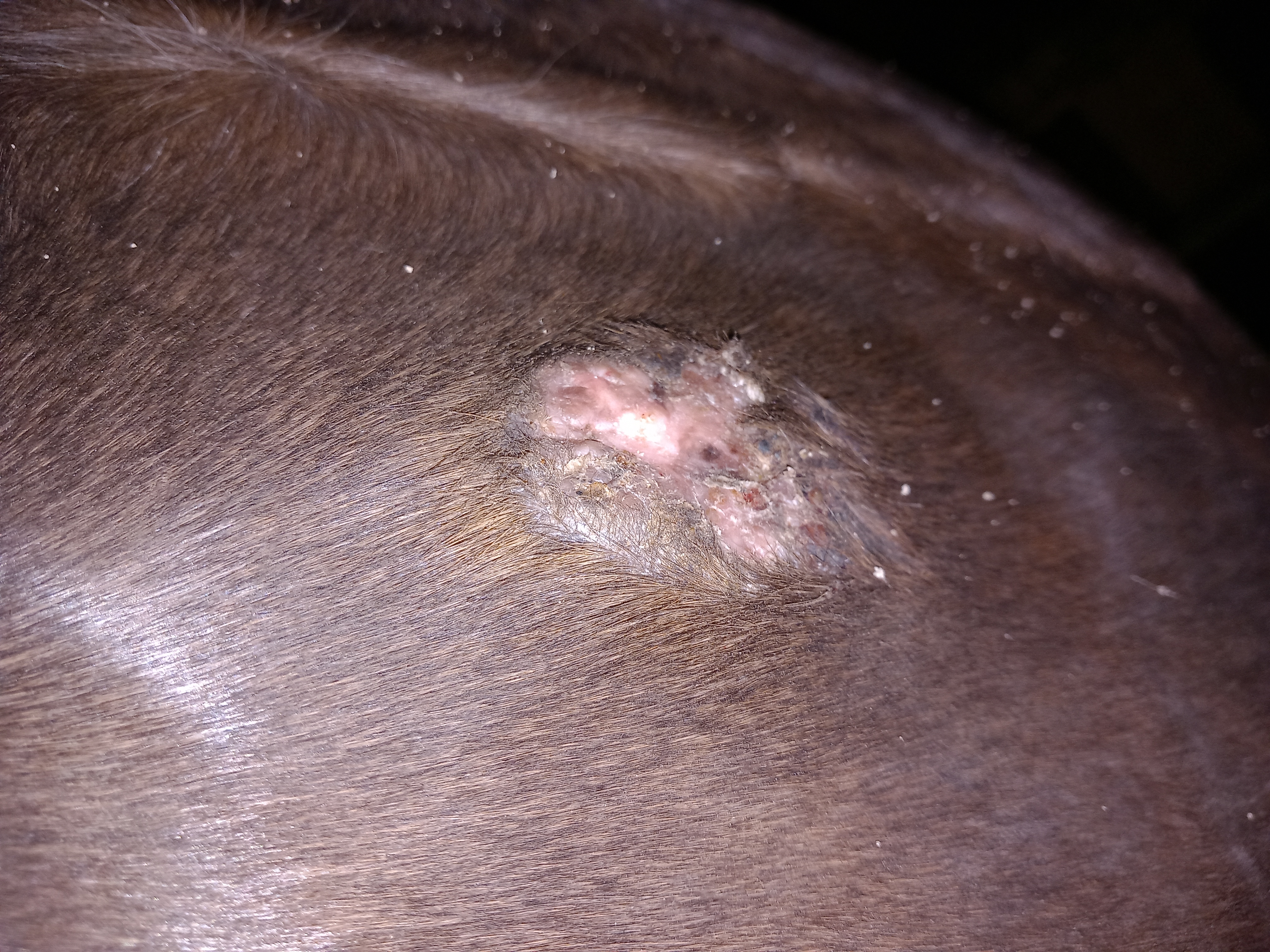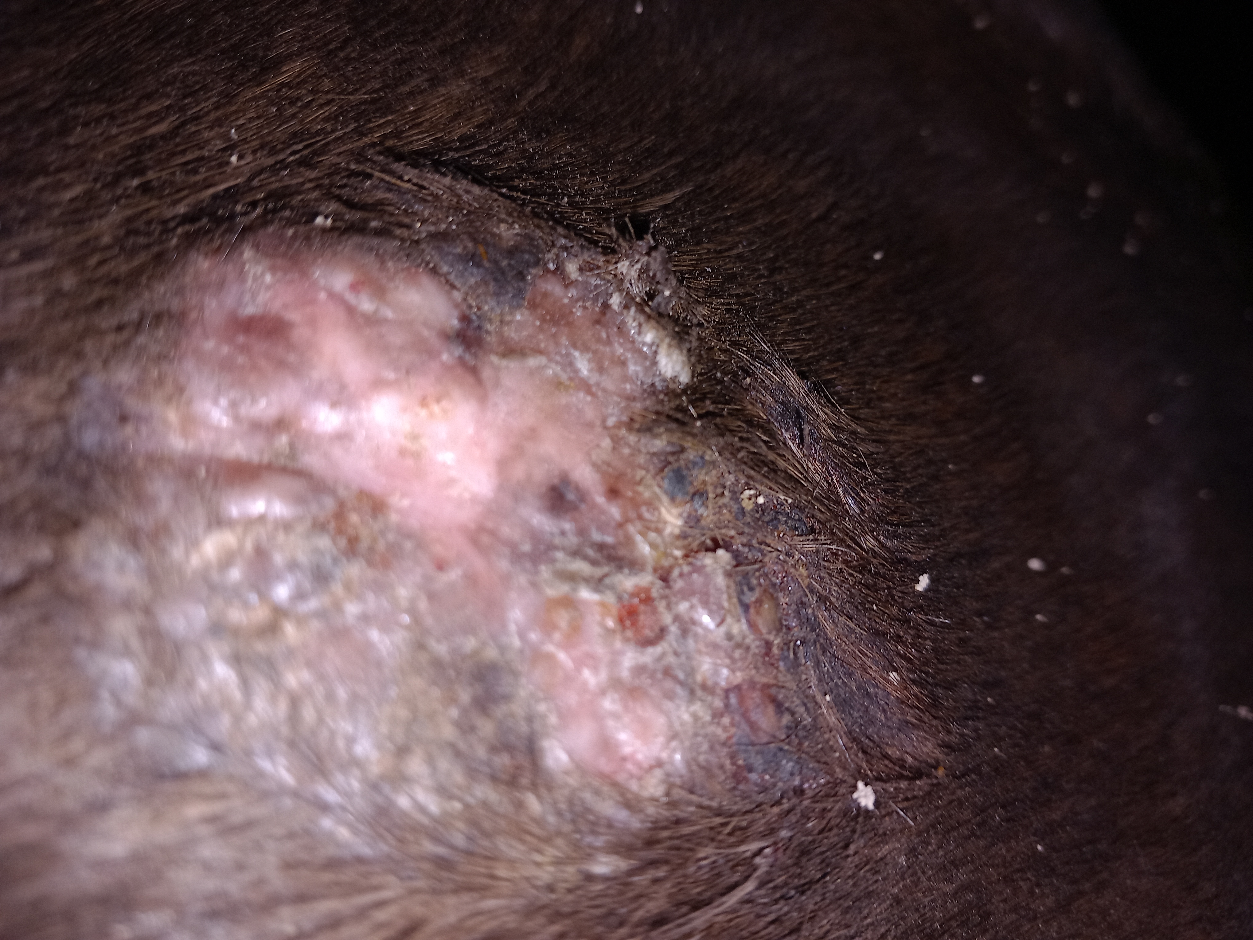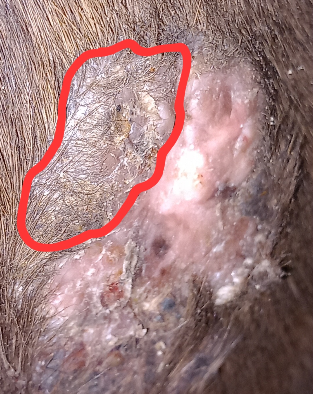 Die eingekreiste Stelle ist sehr erhaben und wirkt fast wie Leder. Es sind einzelne Haare darauf und ich bin mir unsicher, ob ich die mit einschmieren soll? Ich könnte nochmal später versuchen ein besseres Bild zu machen.