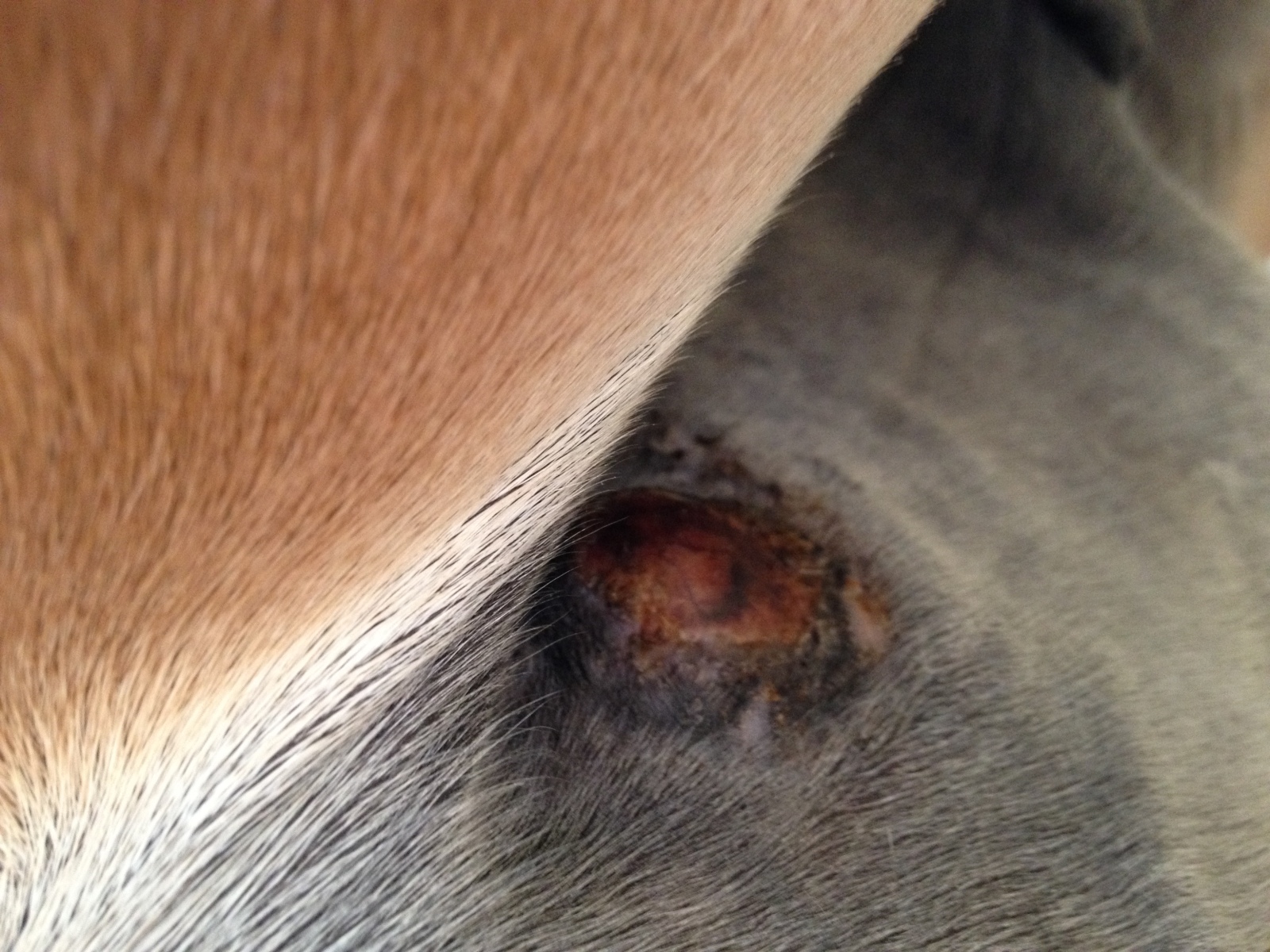 Das Knubbel-Sarkoid (Sarkoid 2=Bild 2) ist jetzt offen, die obere Hautschicht hat sich gelöst und es macht auch keinen Anschein das sich da wieder neue Haut bildet.
