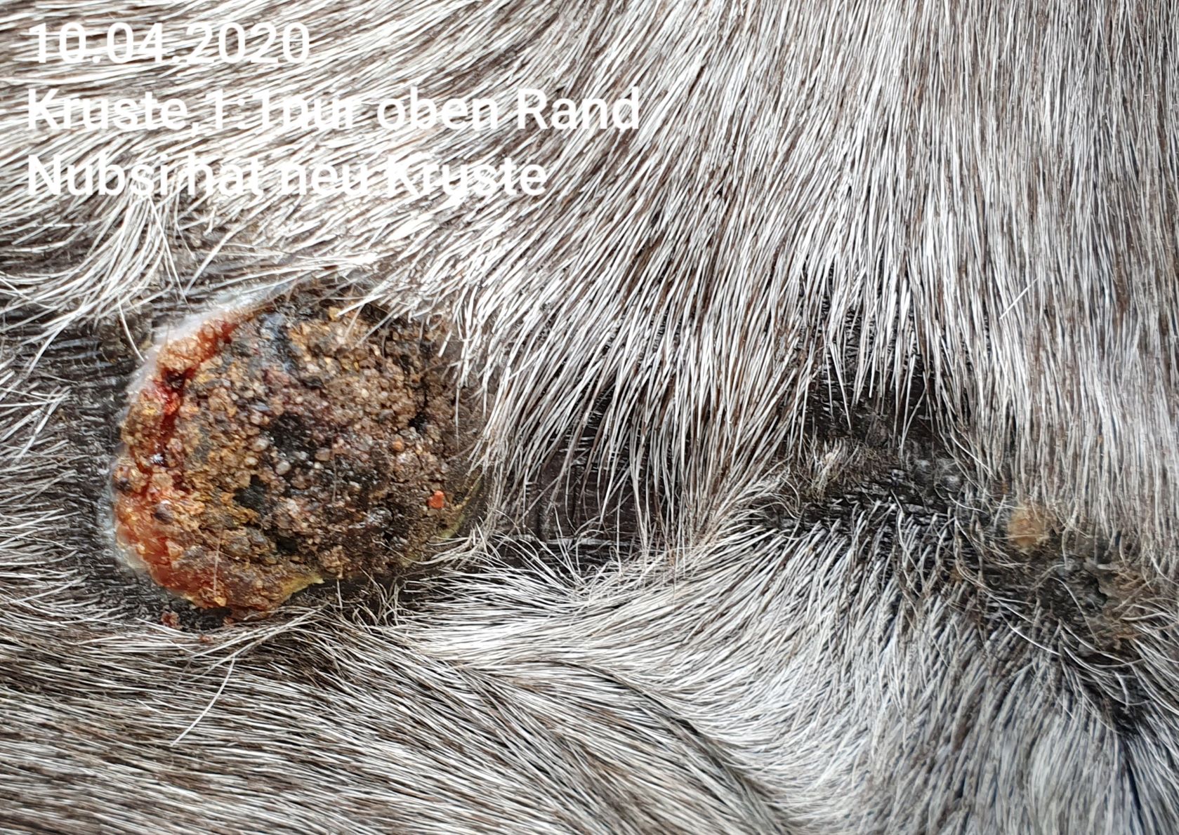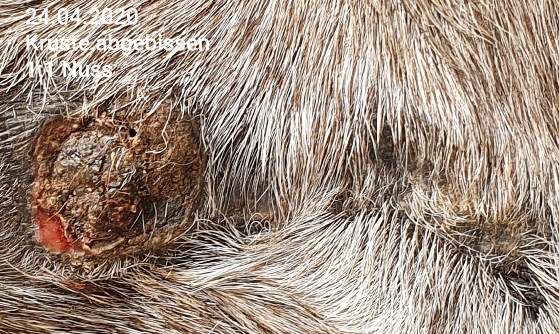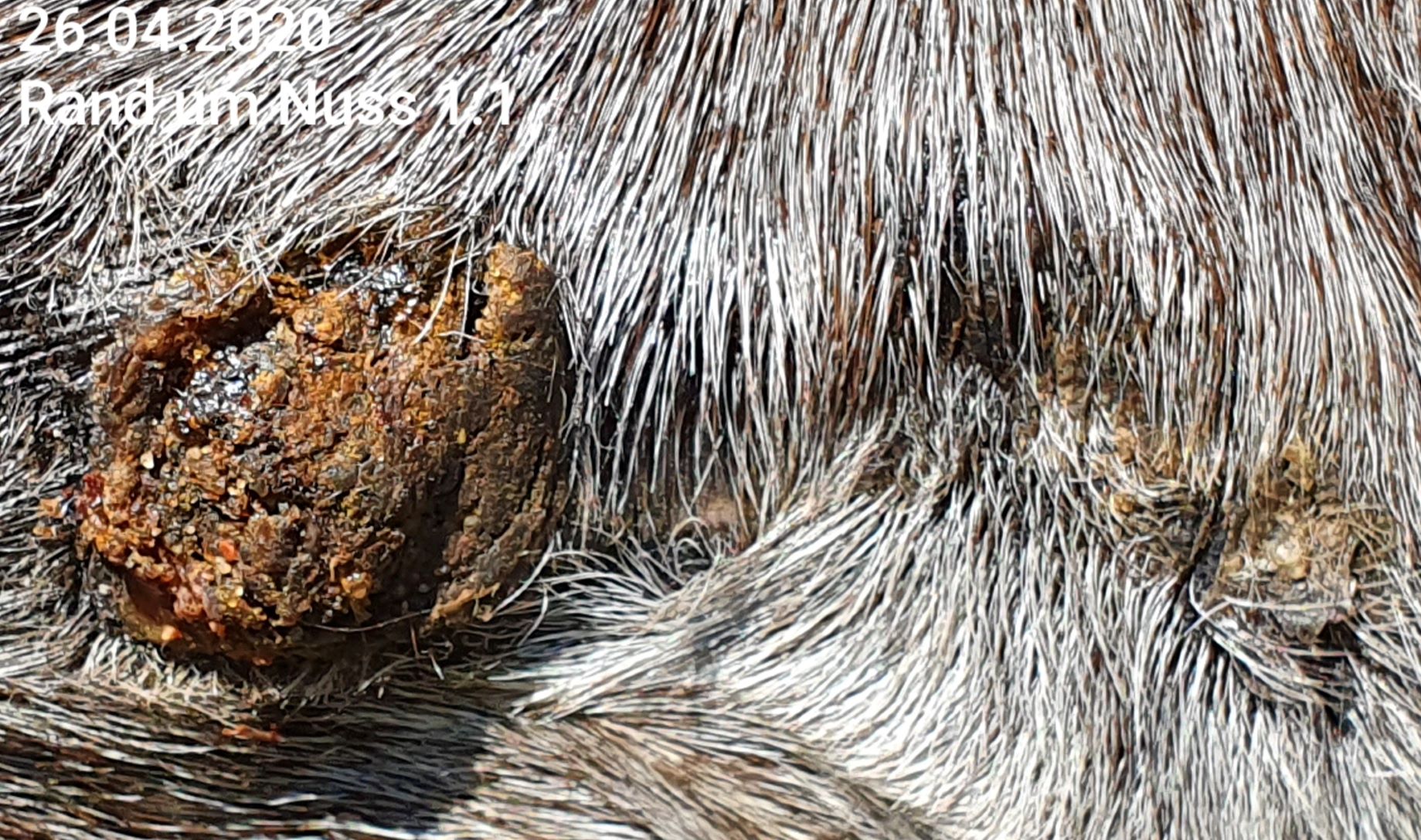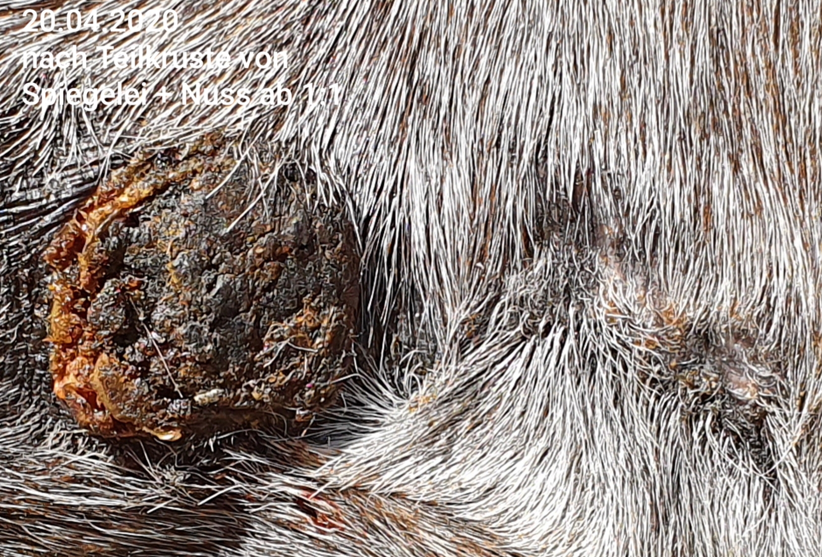 Wir haben das erste Mal seit ca. 6 Tagen auf Nuss eine durchgehende, sehr harte Kruste. Das Spiegelei ist ebenfalls mit verkrustet, jedoch hat die Kruste hier eine andere Konsistenz, ist grizzeliger, bröckelig, und immer wieder mit einem leichten Riss versehen. Da Nuss sich nicht wirklich regt, bekommt Nuss von mir 1x tgl. CompX pur ab, der Spiegeleibereich mit Rissen 1:3.