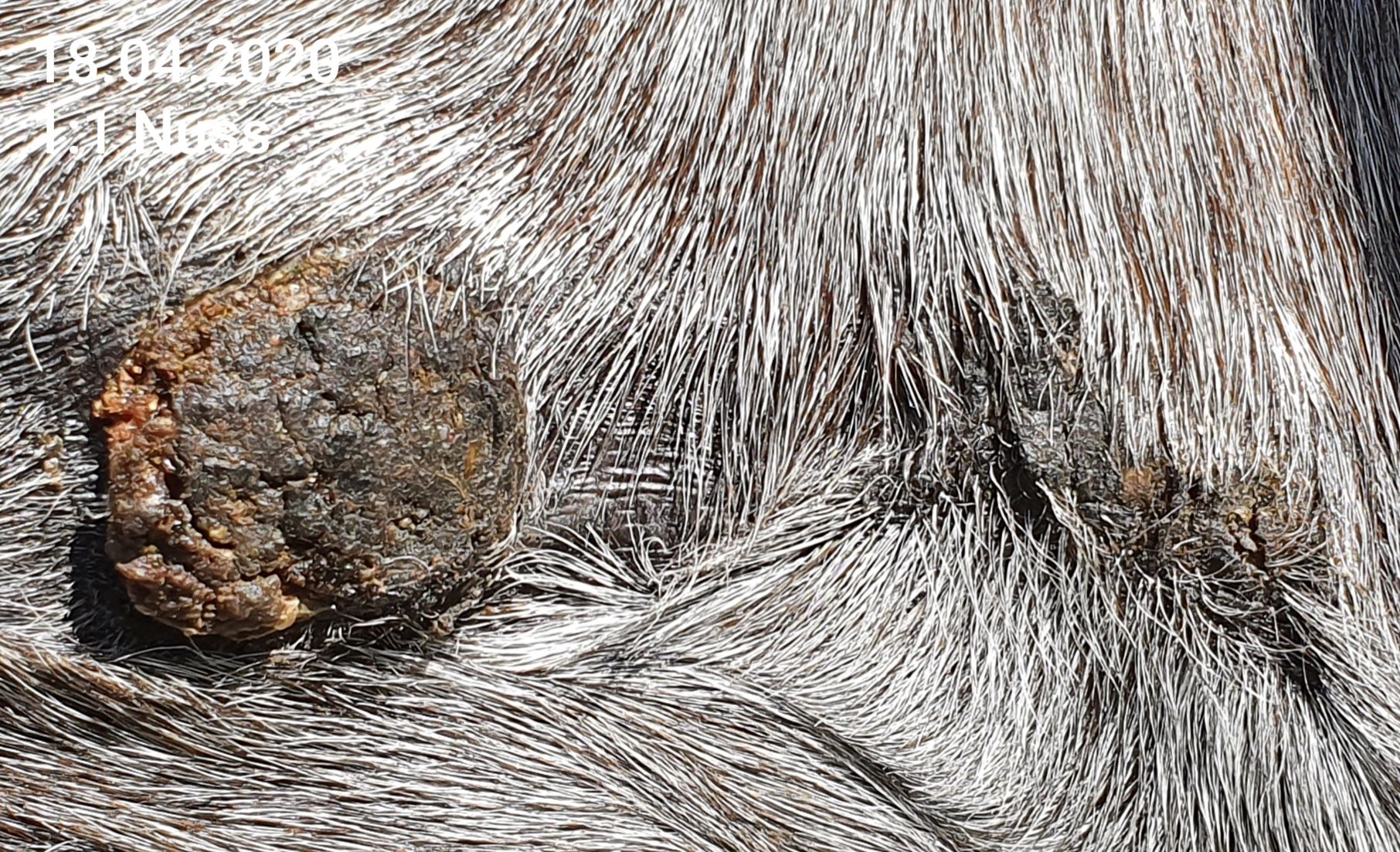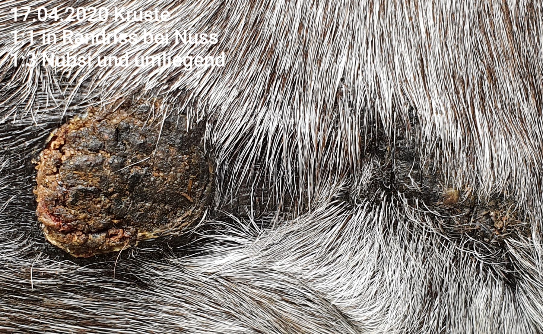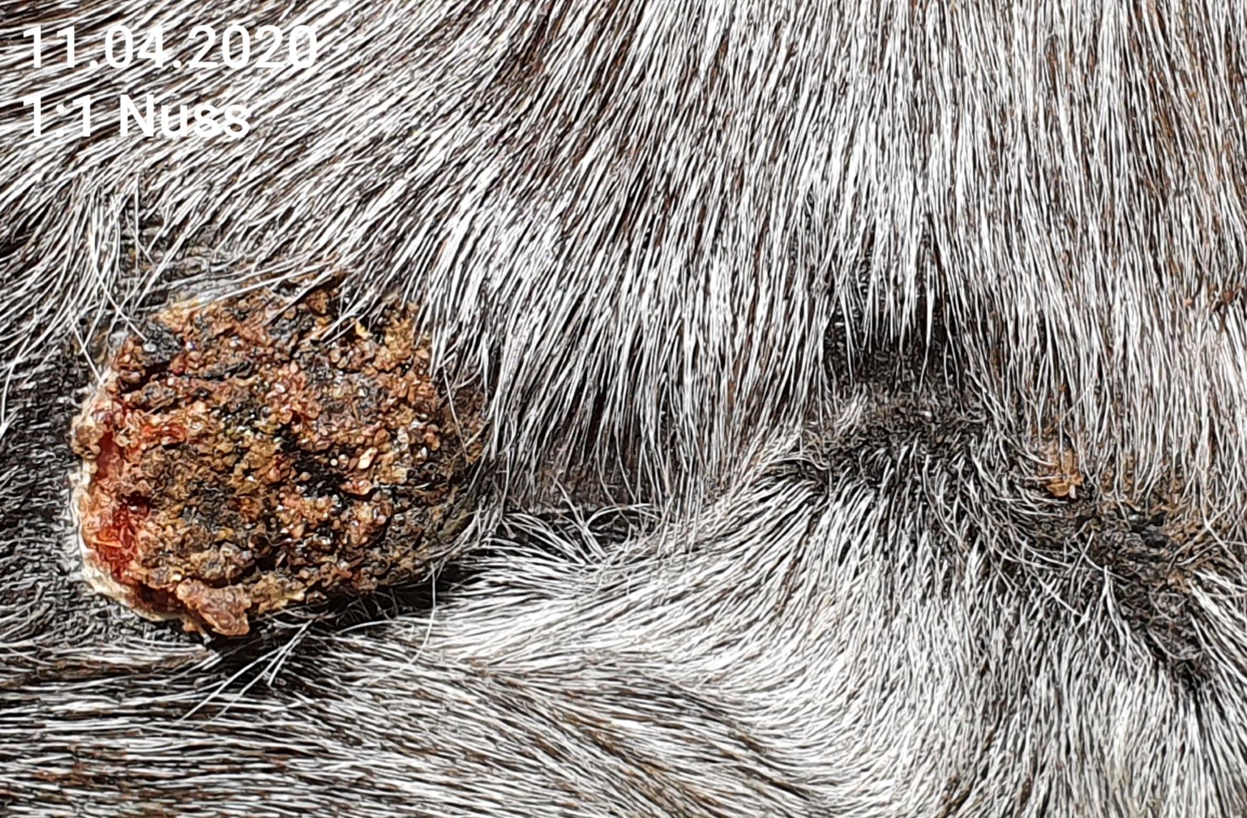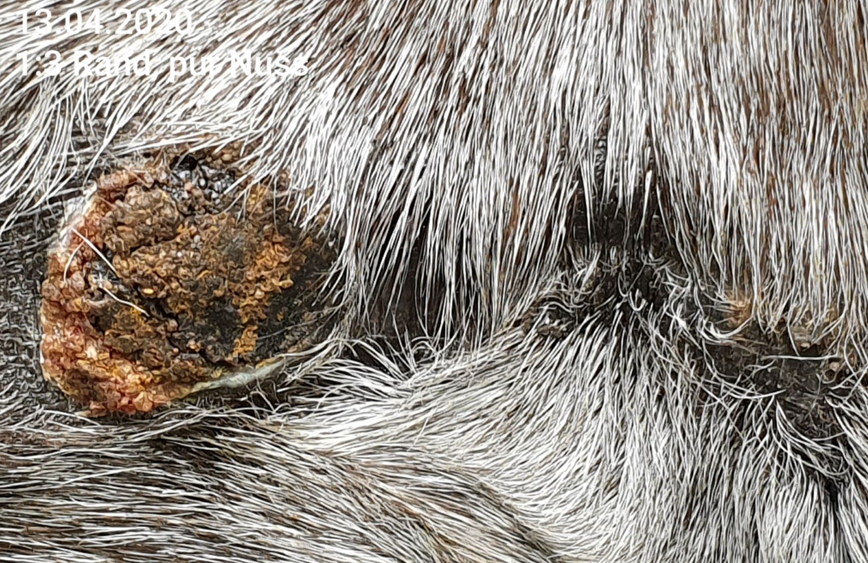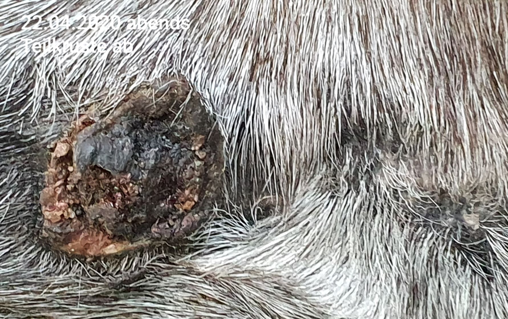 Wir haben das erste Mal seit ca. 6 Tagen auf Nuss eine durchgehende, sehr harte Kruste. Das Spiegelei ist ebenfalls mit verkrustet, jedoch hat die Kruste hier eine andere Konsistenz, ist grizzeliger, bröckelig, und immer wieder mit einem leichten Riss versehen. Da Nuss sich nicht wirklich regt, bekommt Nuss von mir 1x tgl. CompX pur ab, der Spiegeleibereich mit Rissen 1:3.