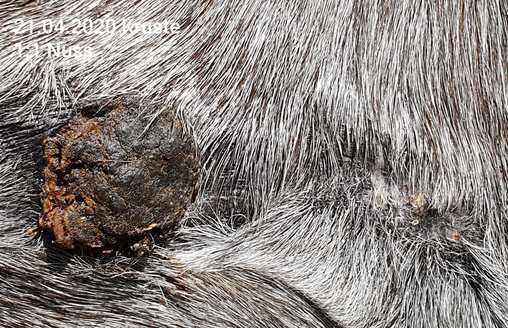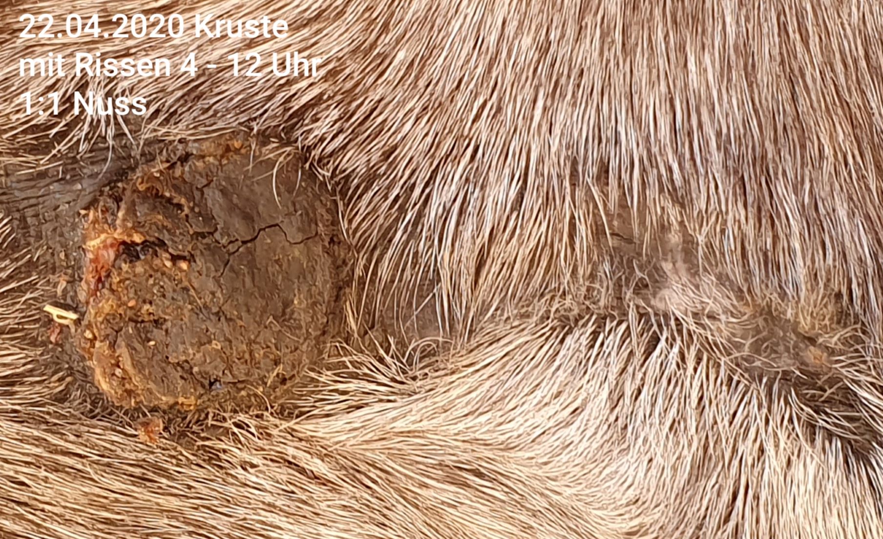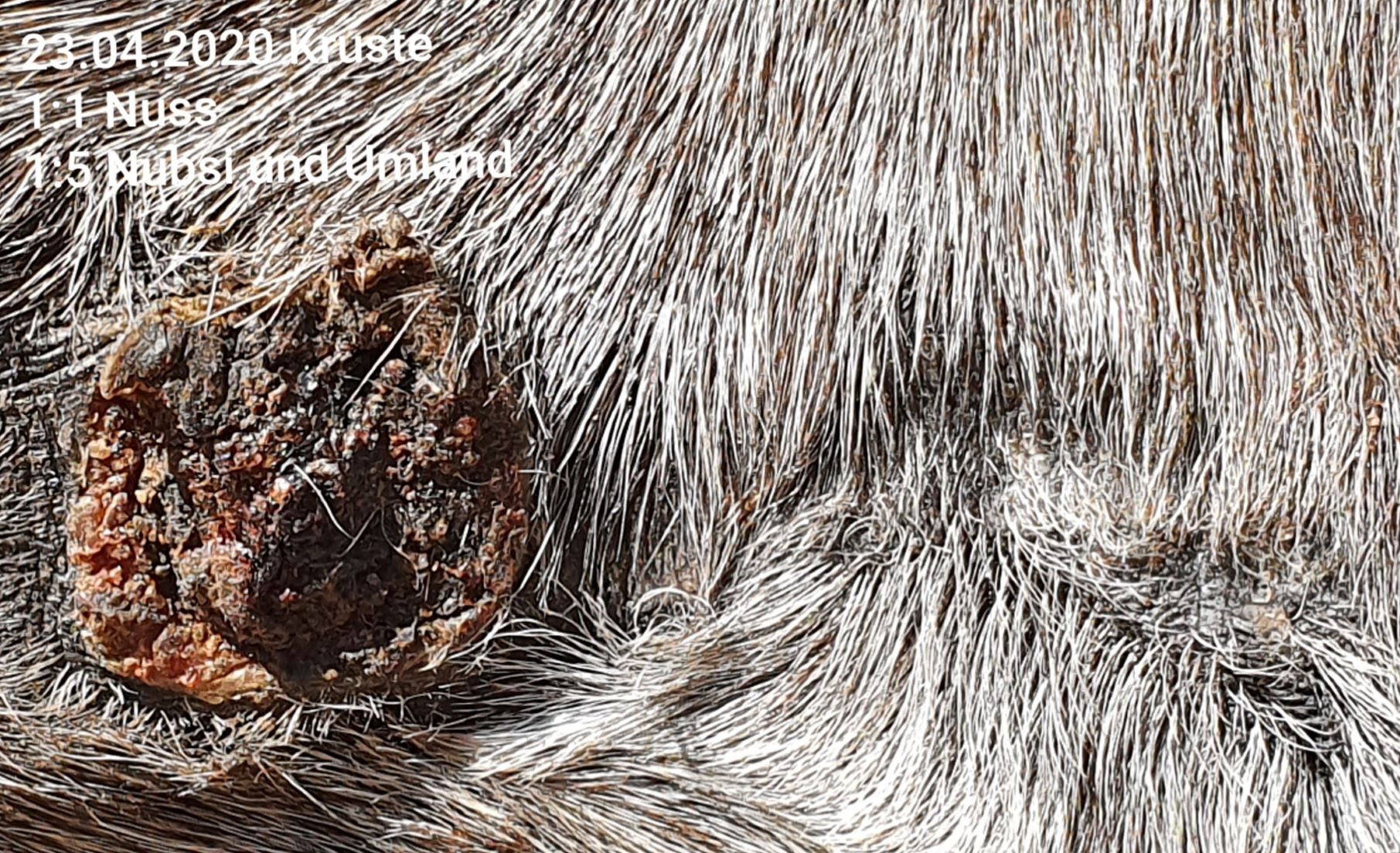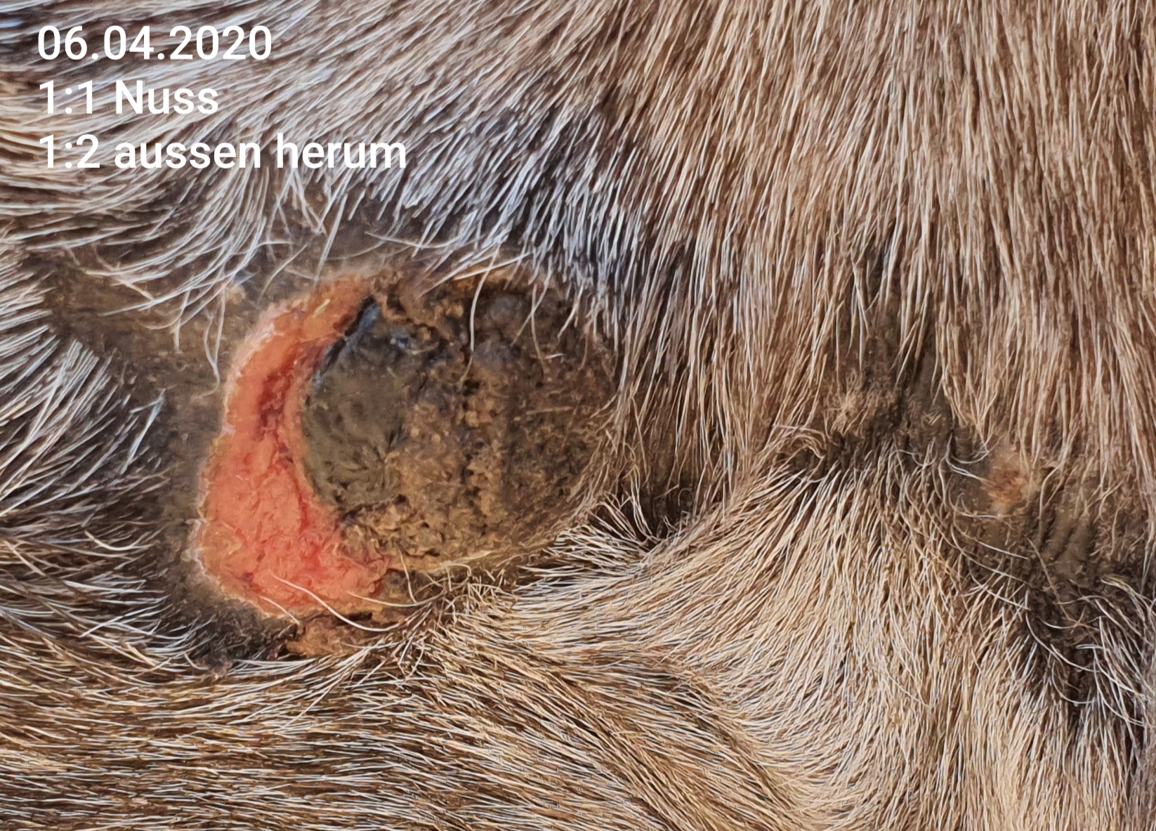 Ich hatte die Jungs ein paar Tage getrennt, da der Kleine leicht gelahmt hat. Wahrscheinlich hat auch die Ruhe vom Hengstchen-Kamikaze-Spiel dazu beigetragen, dass es nicht mehr eingerissen ist. Gestern haben wir die beiden wieder zusammengelassen und abends war wieder ein kleiner Riss von ca. 6 bis 11 Uhr zwischen Nuss und Spiegelei da. Zusätzlich war ein kleines Stück der Kruste auch von Nuss auf ca. 8 Uhr weg. Darunter blutig...also Schmierfinger doch ausgepackt und ganz flink 1:1 in Riss und auf kleine blutige Stelle aufgetragen. (Ich kriege die blöde Nuss