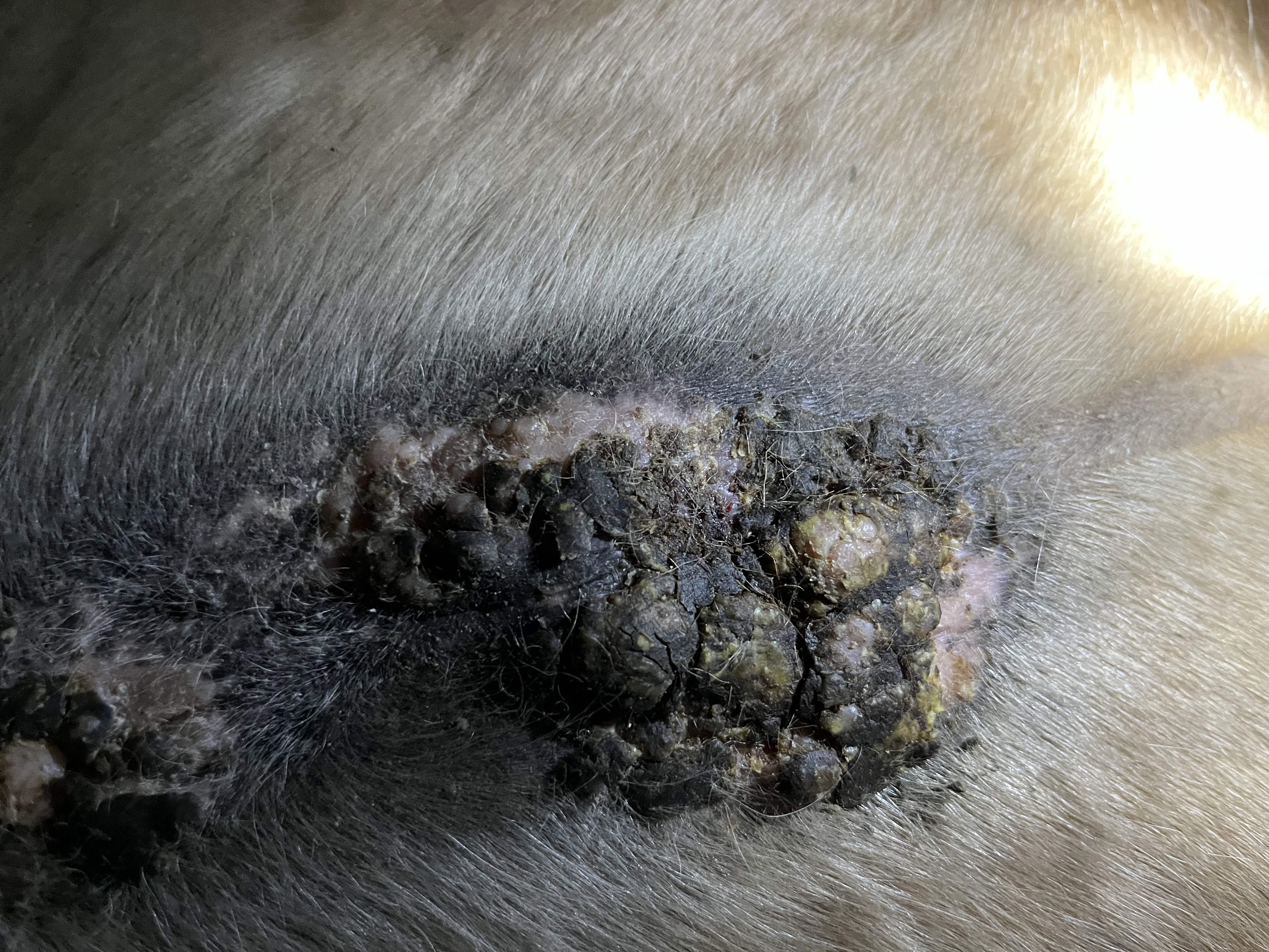 Am Zipfel also da wo der „Blumenkohl“ nicht ist, haben sich Krusten gelöst. Es kommen 2 Bilder: 1 gestern Morgen, 2. heute Morgen.