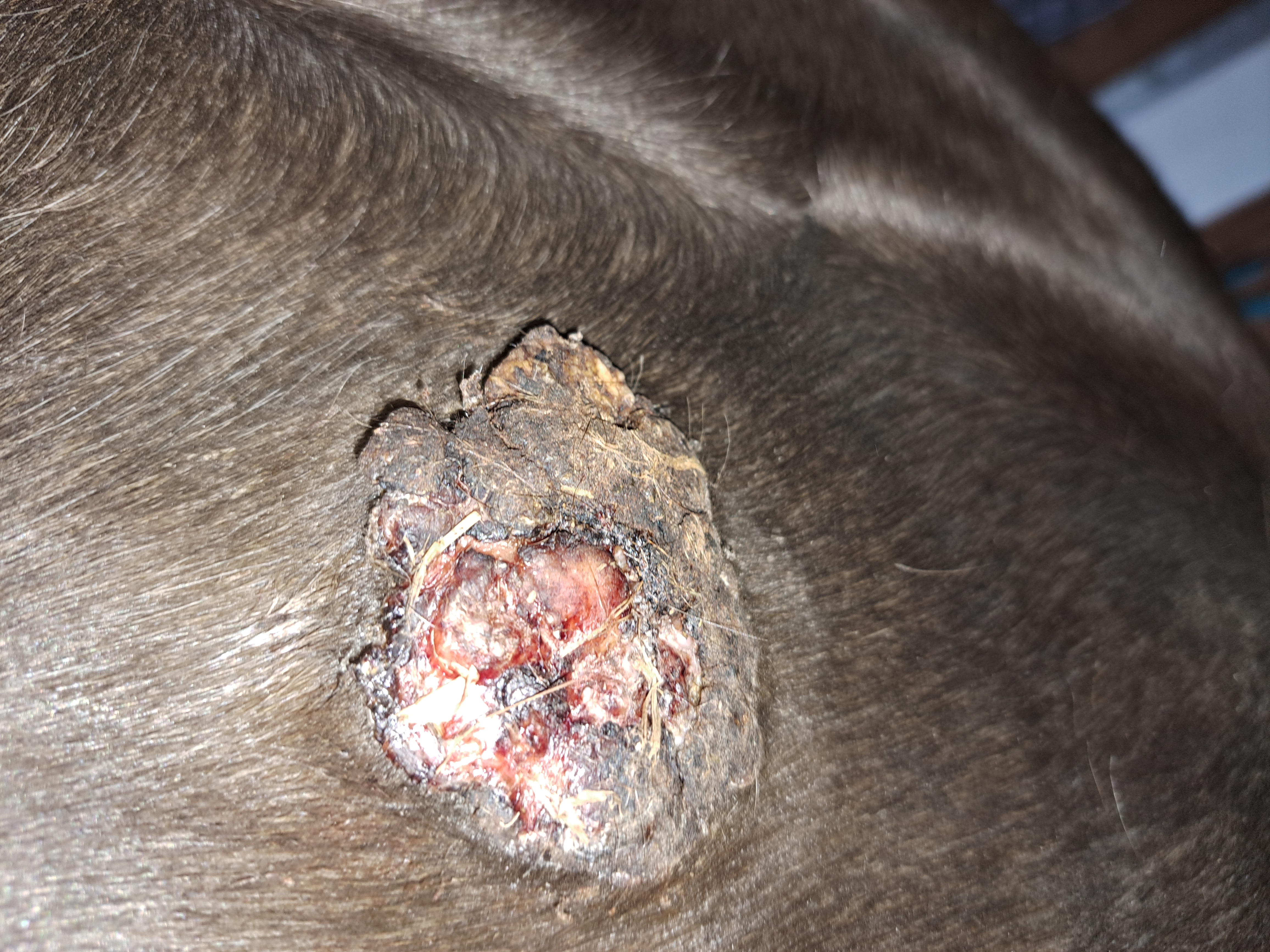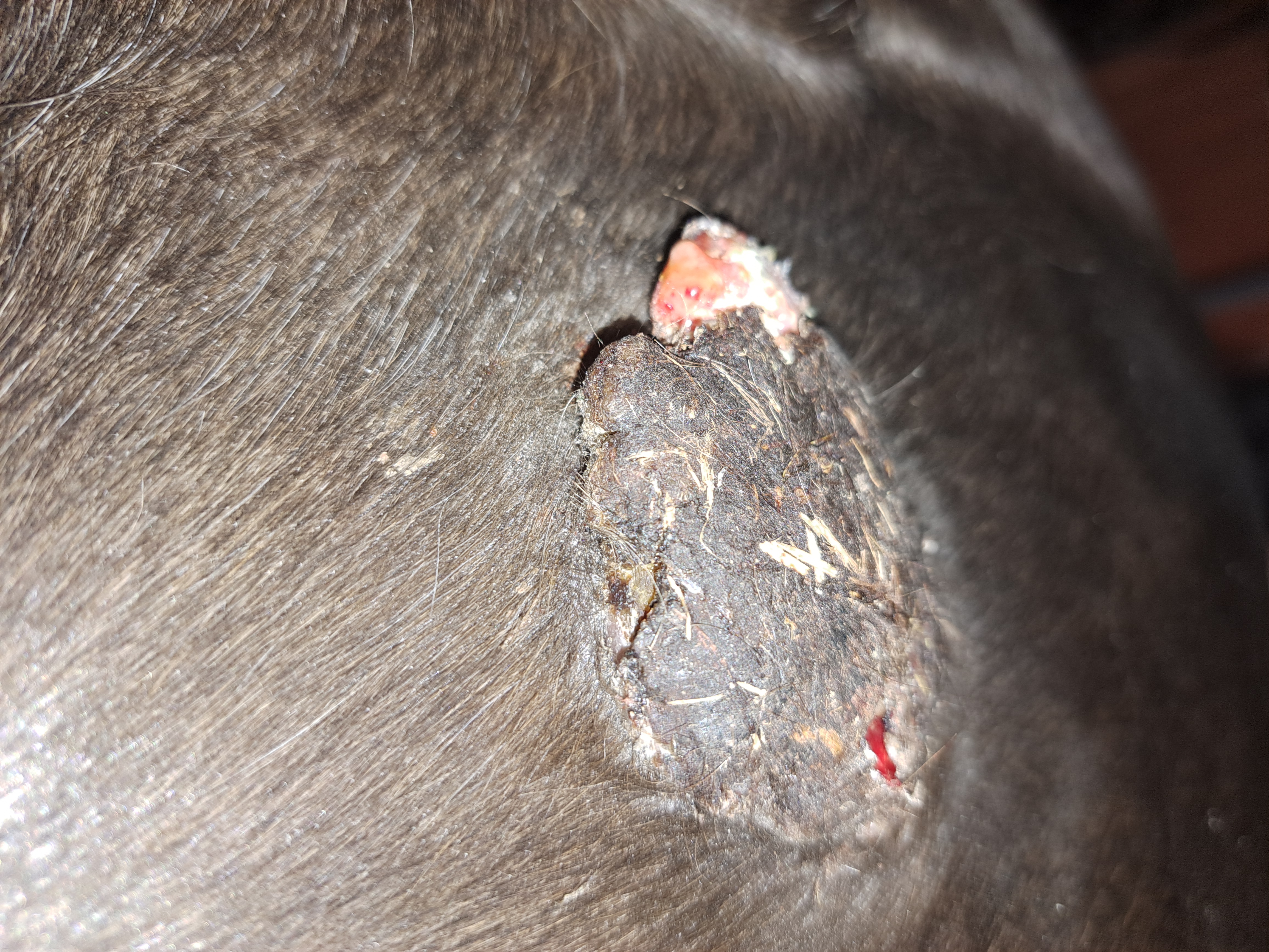 Hallo, heute ist der erste salbenfreie Tag. Das Sarkoid hat an Volumen deutlich abgenommen. Gestern abend war das Salbeauftragen schon nicht mehr einfach...es scheint ihr unangenehm zu sein. Auch das Heu kann ich nicht entfernen, versuche es aber natürlich weiterhin, da sie mit dem Hinterbein ziemlich flott ist.