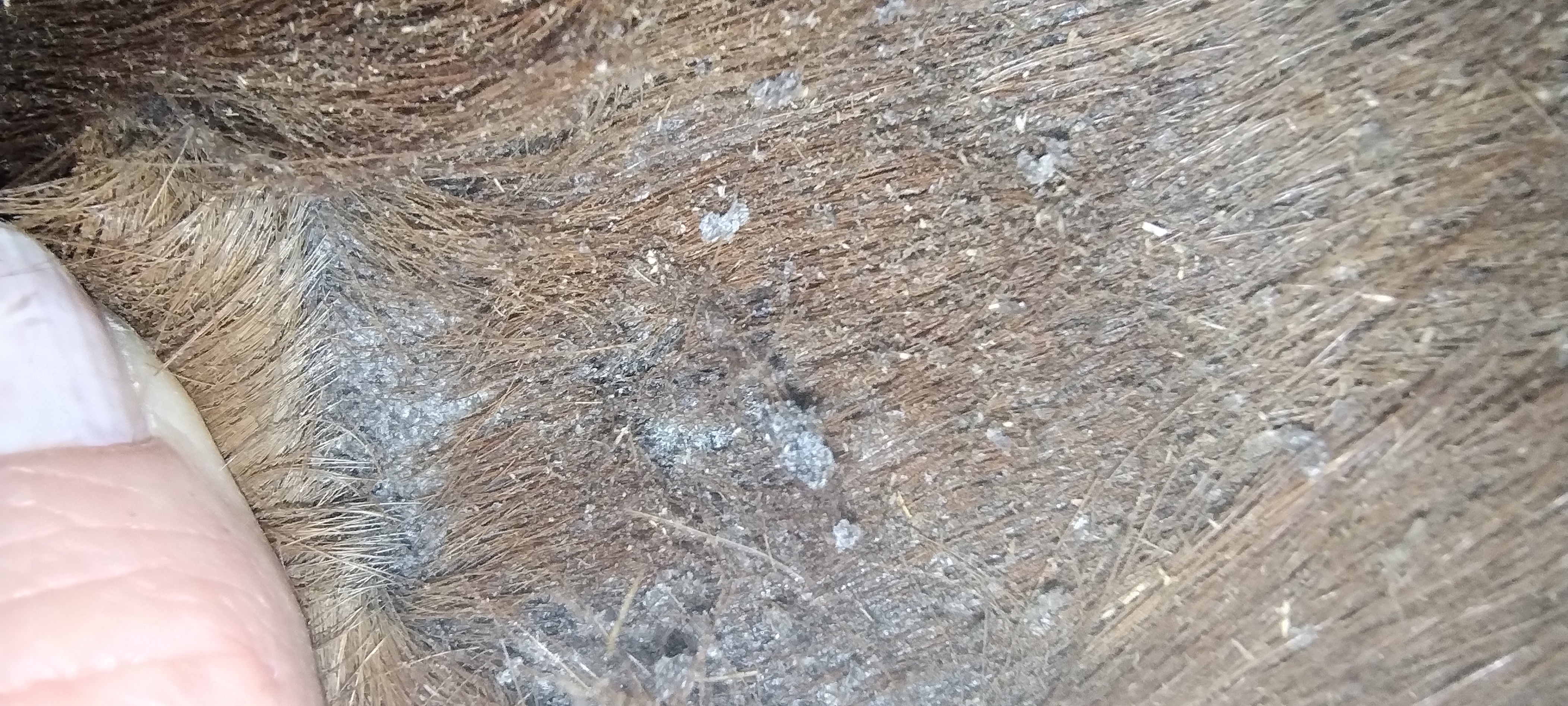 Dienstag Mittwoch Die Flanke sieht momentan so aus: Es ist einiges von der schwarzen Kruste abgebröselt, was darunter ist, lässt sich aber schwer erkennen. Da unterhalb bereits einige Haare ausgehen, schmiere ich direkt dort dick Heilsalbe. Seit letzten Freitag habe ich auf 1:3 gewechselt und tupfe etwas dicker.
