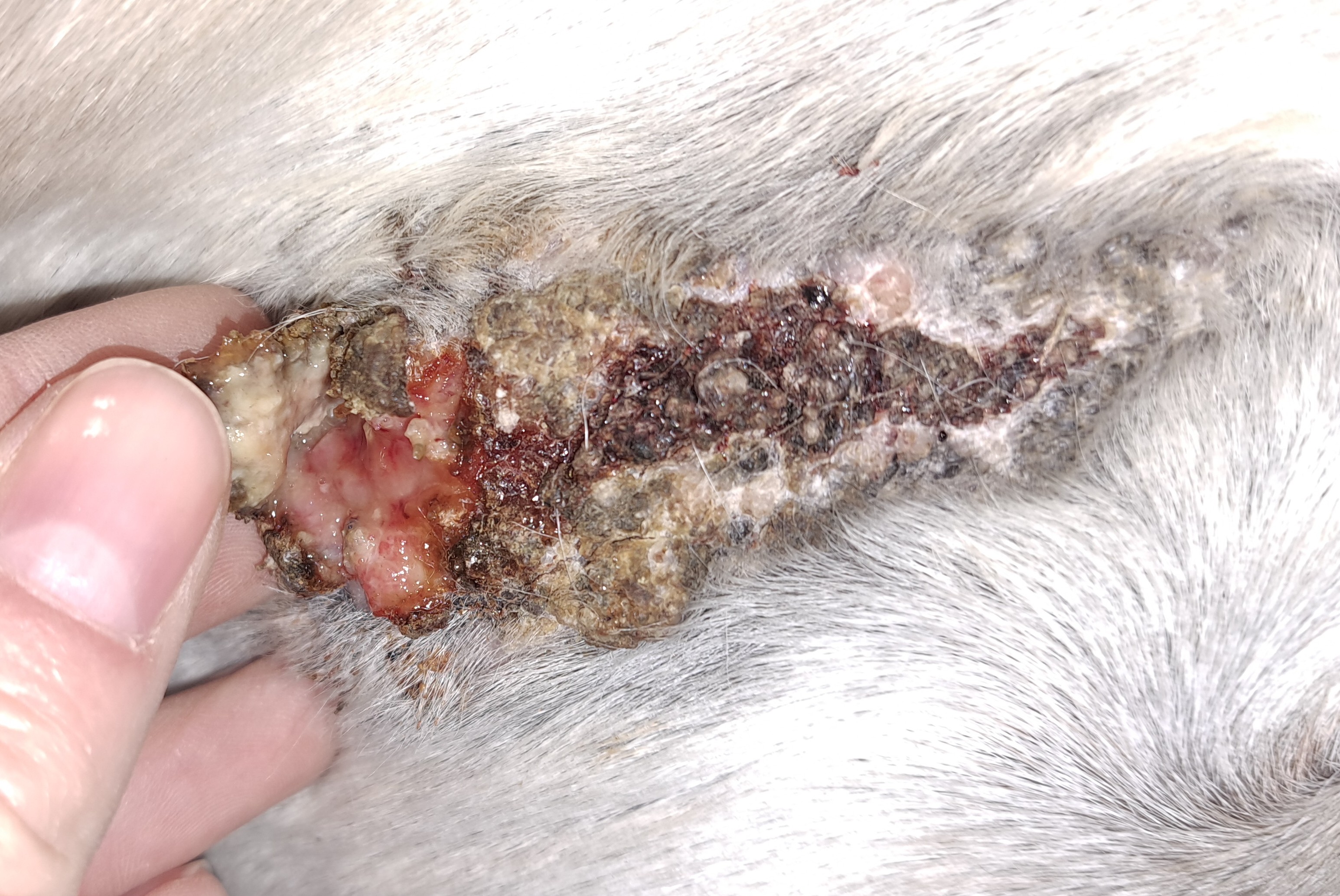 Ich sag mal, was ich sehe: die Brust heilt ab, die linke Seite heilt ab und der im Bild rechte Teil des Sarkoids heilt ab. Wieso sollte links mega-krasses Wachstum stattfinden? Da ist obenauf noch Kruste, richtig? Auch wenn es schwer fällt, würde ich erst sehen wollen, was unter der Kruste zum Vorschein kommt.