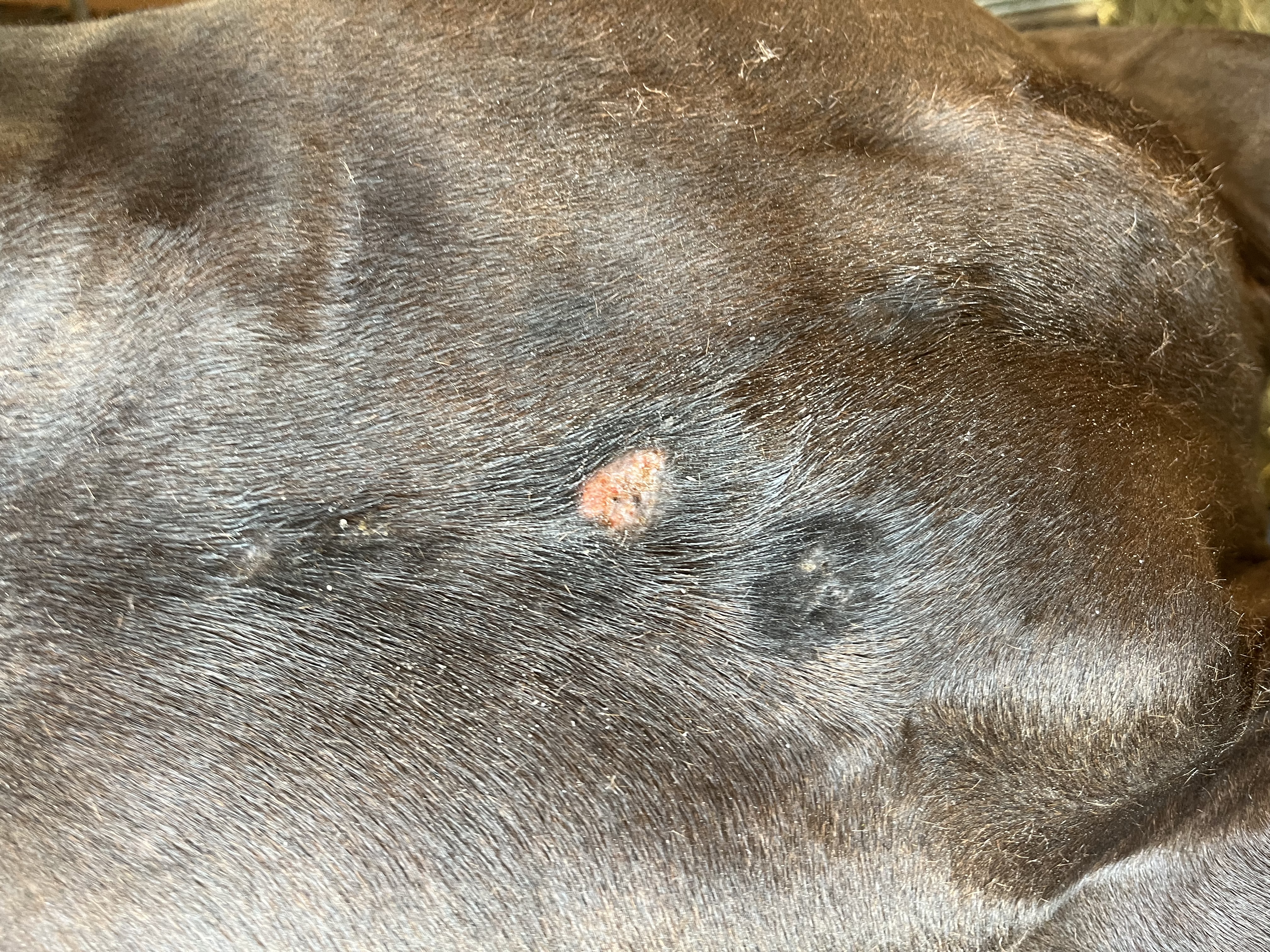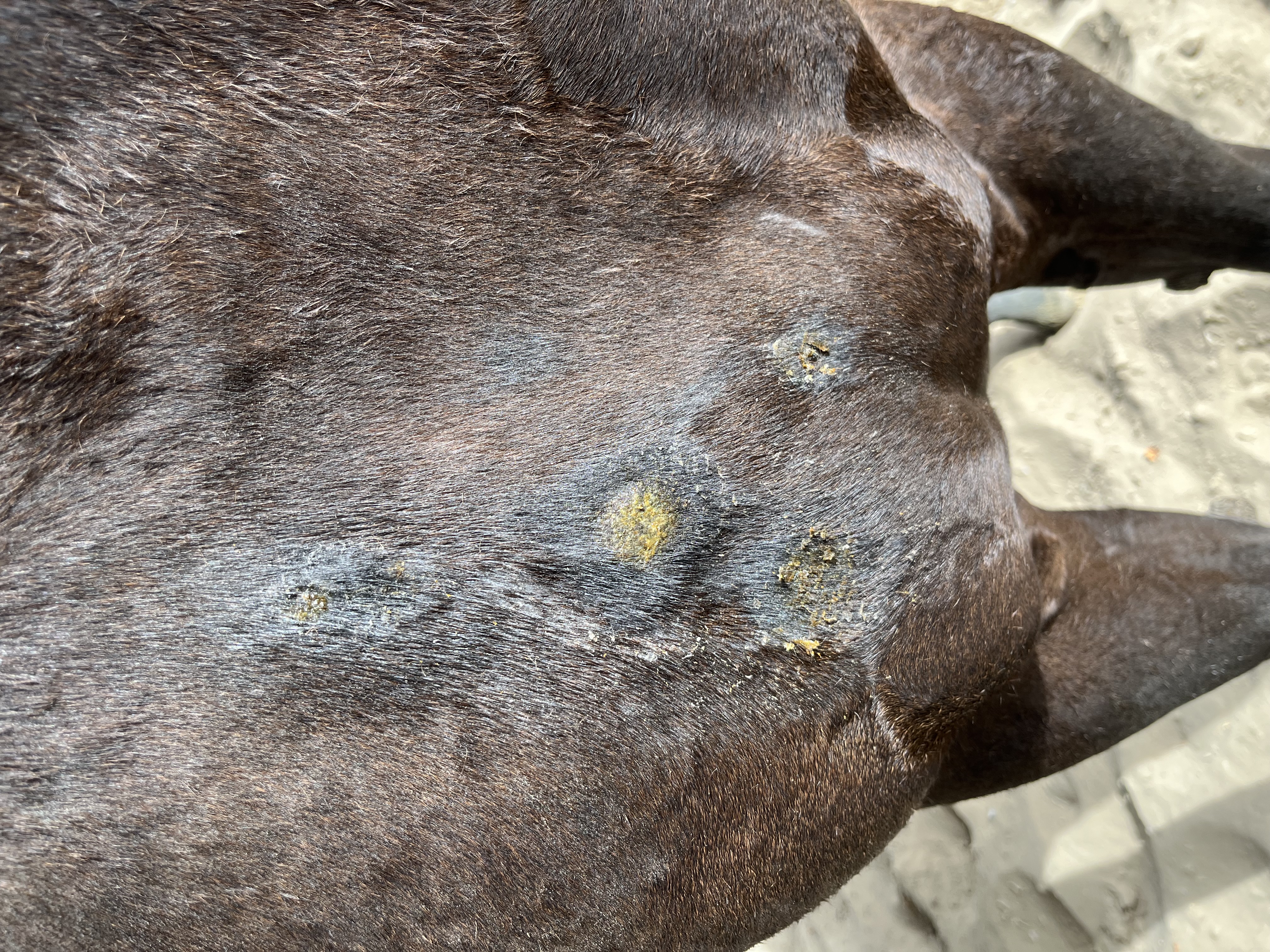 an der Brust sieht es recht krustig aus, da würde ich erst mal noch mit Vaseline drauf gehen und schauen, was drunter zum Vorschein kommt.