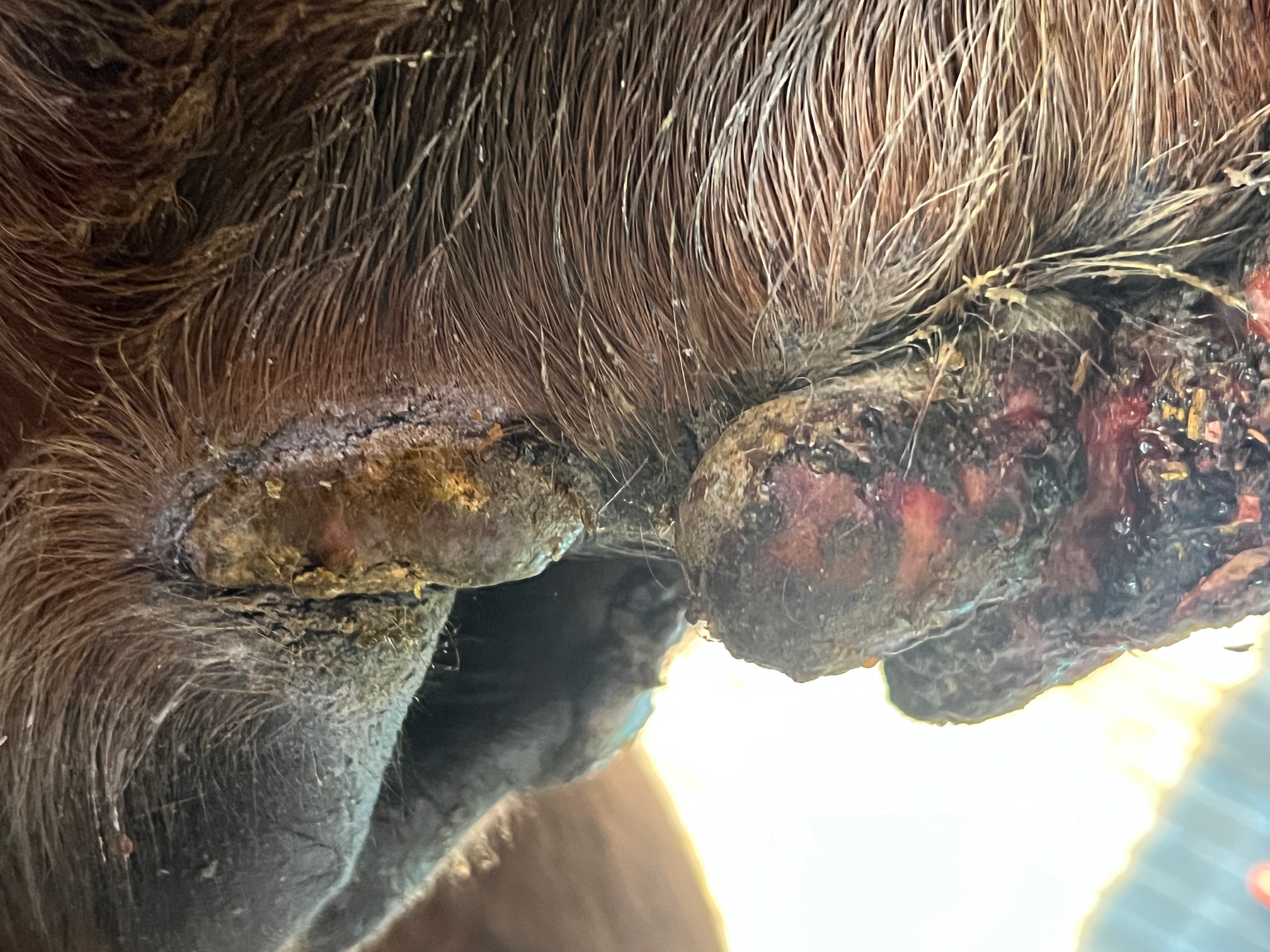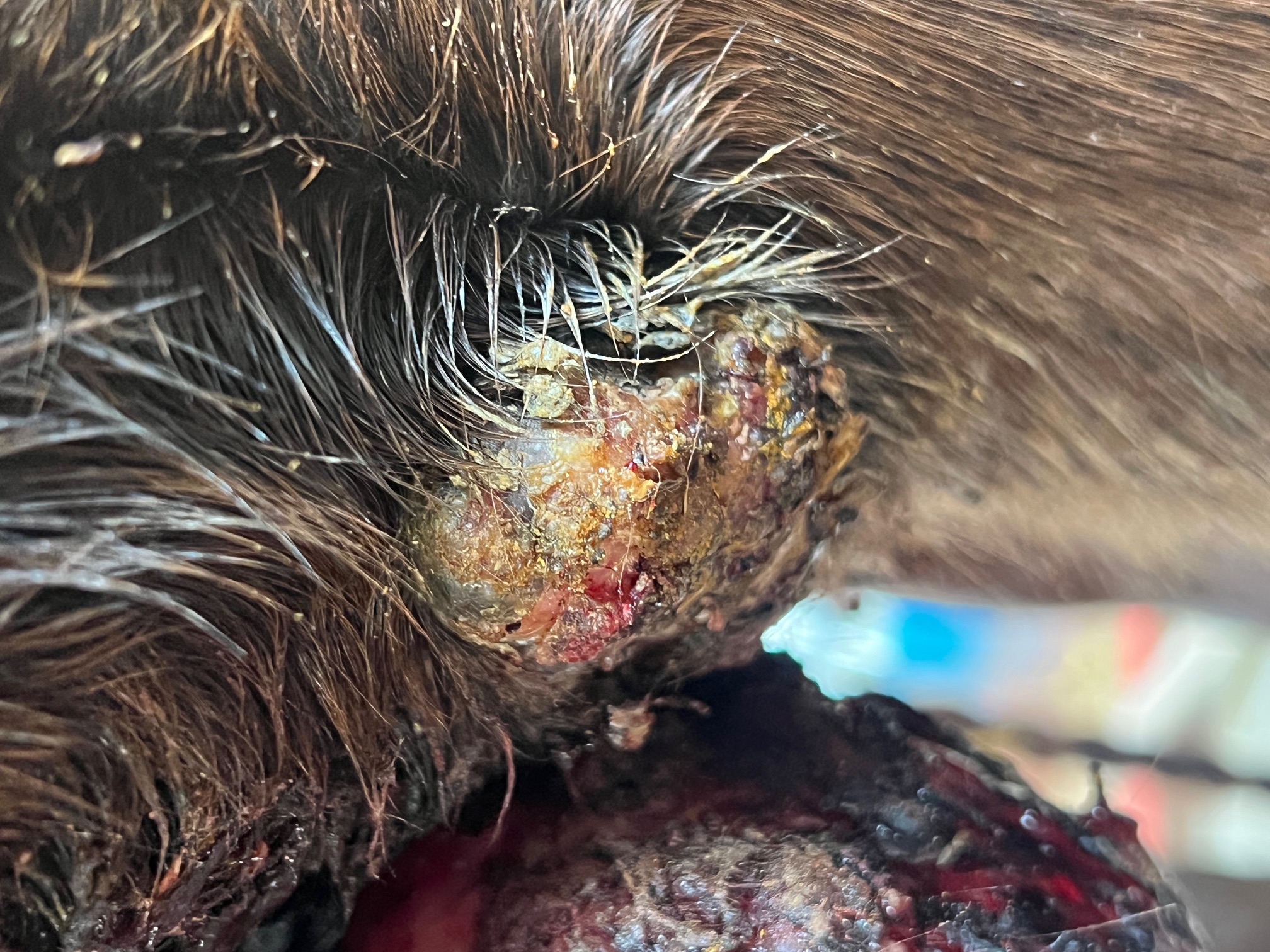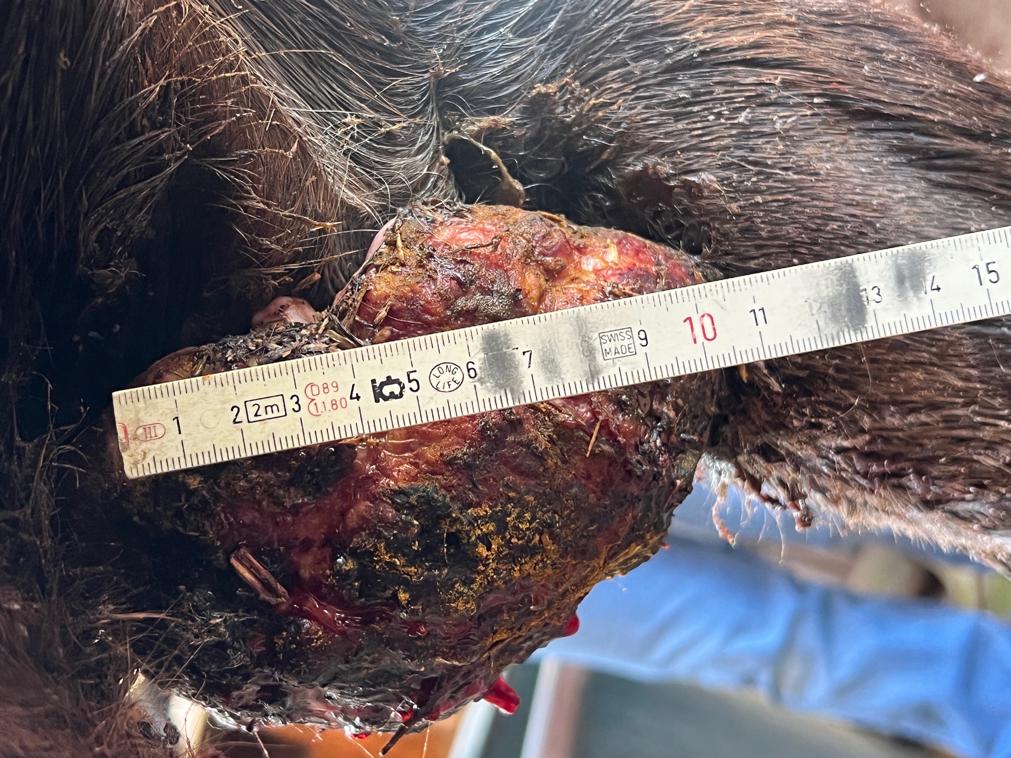 Schmiert wie schon gesagt die Ansätze mit ein. Vielleicht wird es da dann irgendwann „abgeschnitten“ oder es verändert sich so, dass der Tierarzt das nochmal überdenken kann.