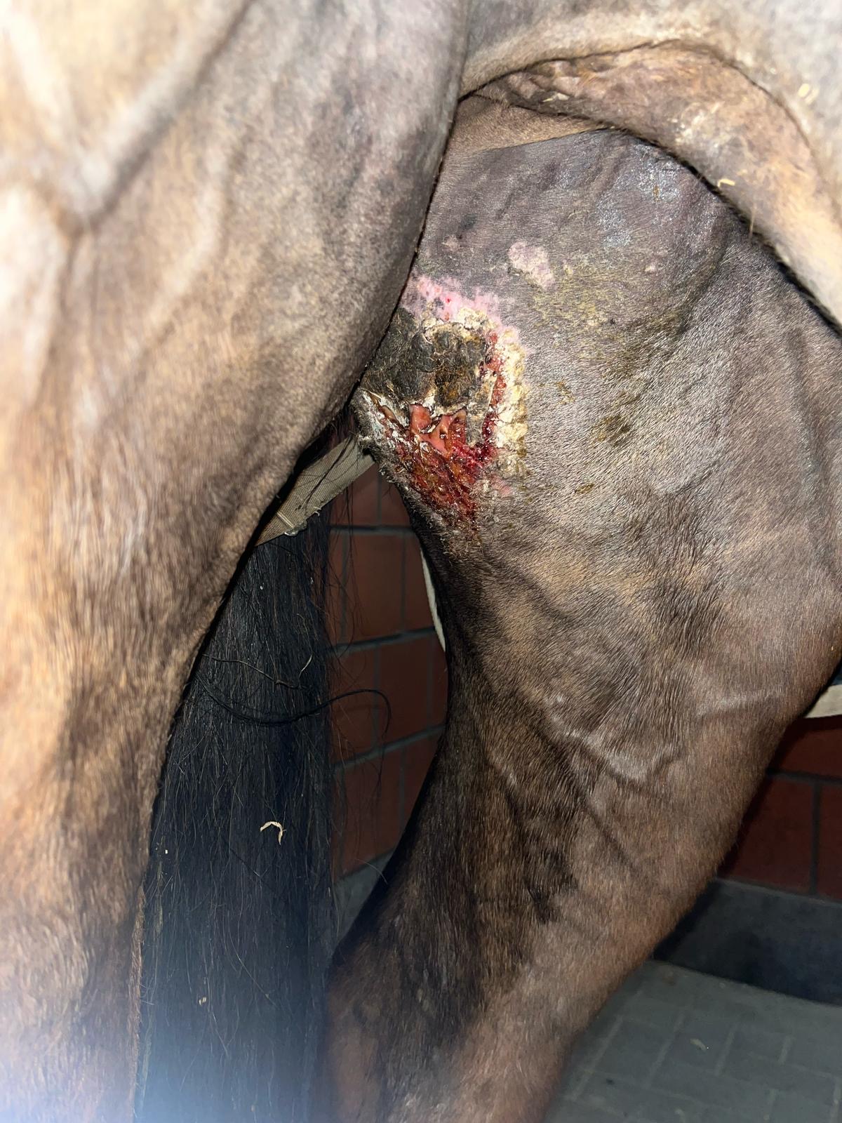 die untere Kruste hat sich heute Morgen gelöst, als er sich in der Halle ausgetobt hat. Ich konnte sie dann heute Mittag vorsichtig abschneiden – zum Glück sieht die Haut darunter richtig gut aus.