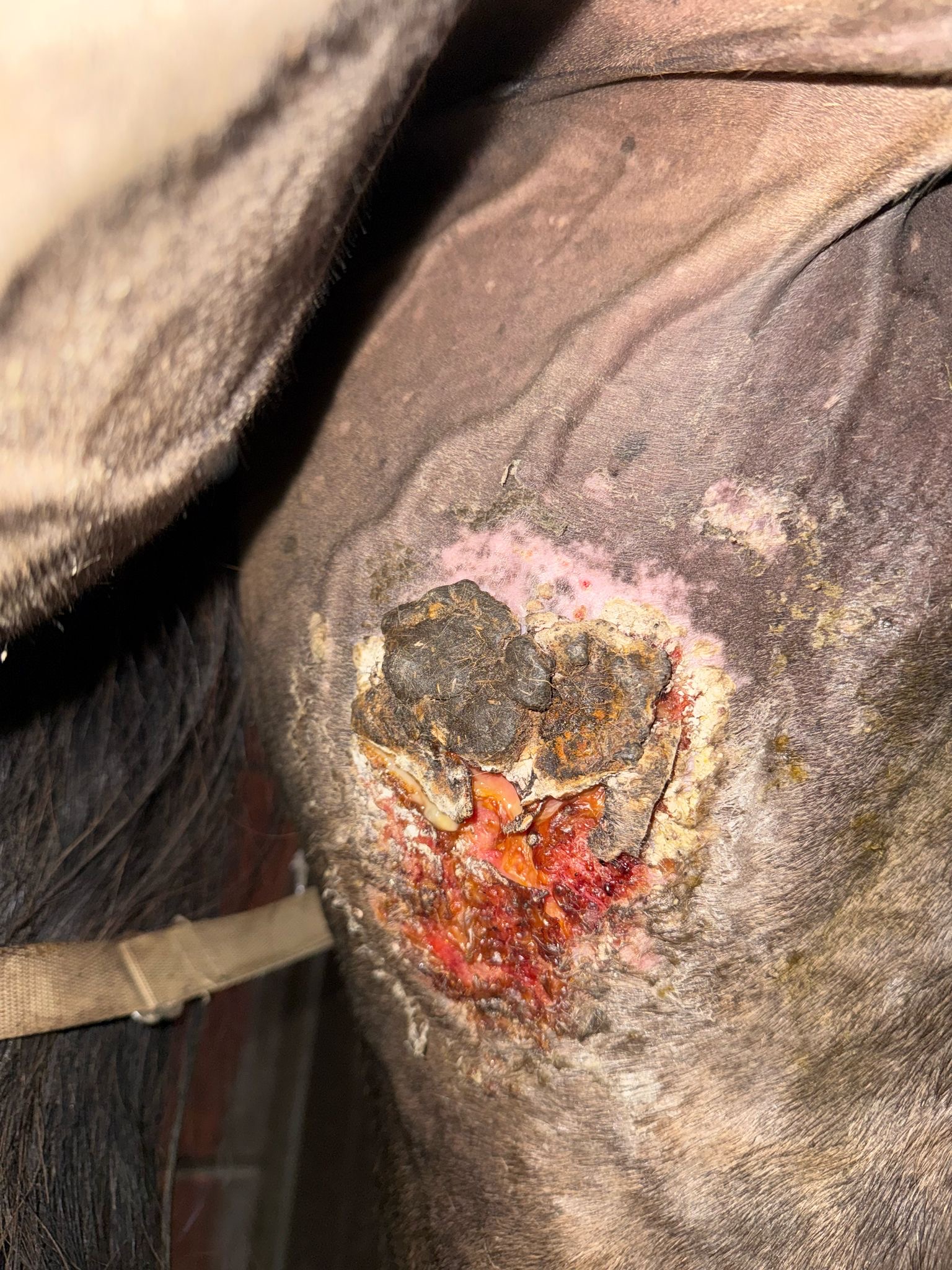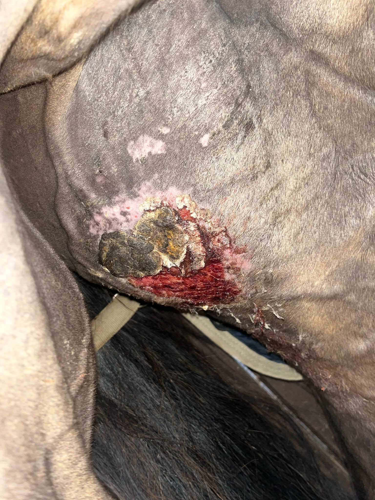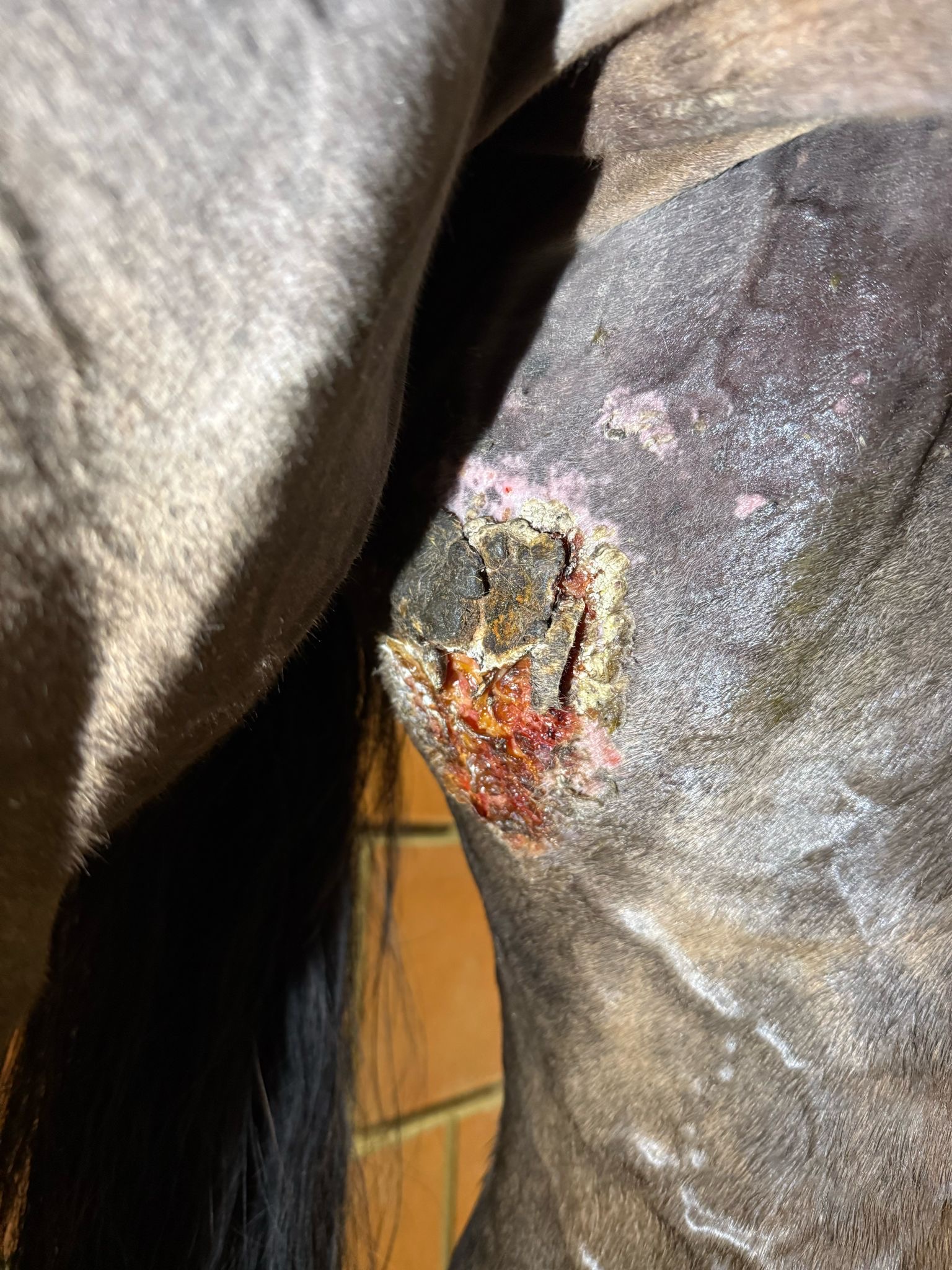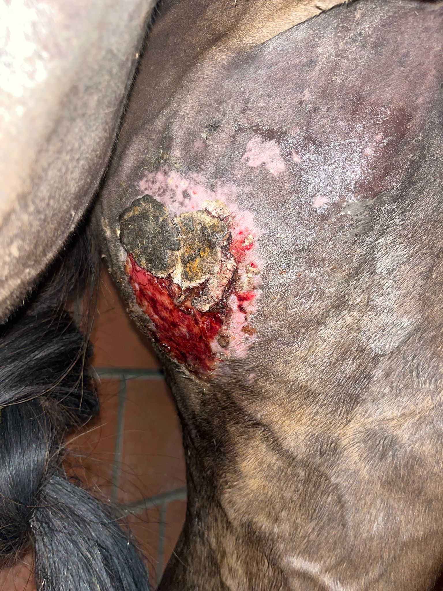 Die betroffene Stelle wird durch Bewegung natürlich stark gedehnt, wodurch sich immer wieder leicht Wundflüssigkeit bildet. Ich habe außerdem den Eindruck, dass das Hauptsarkoid im oberen Bereich noch nicht vollständig zurückgegangen ist. Aktuell löst sich die Kruste auch noch nicht.