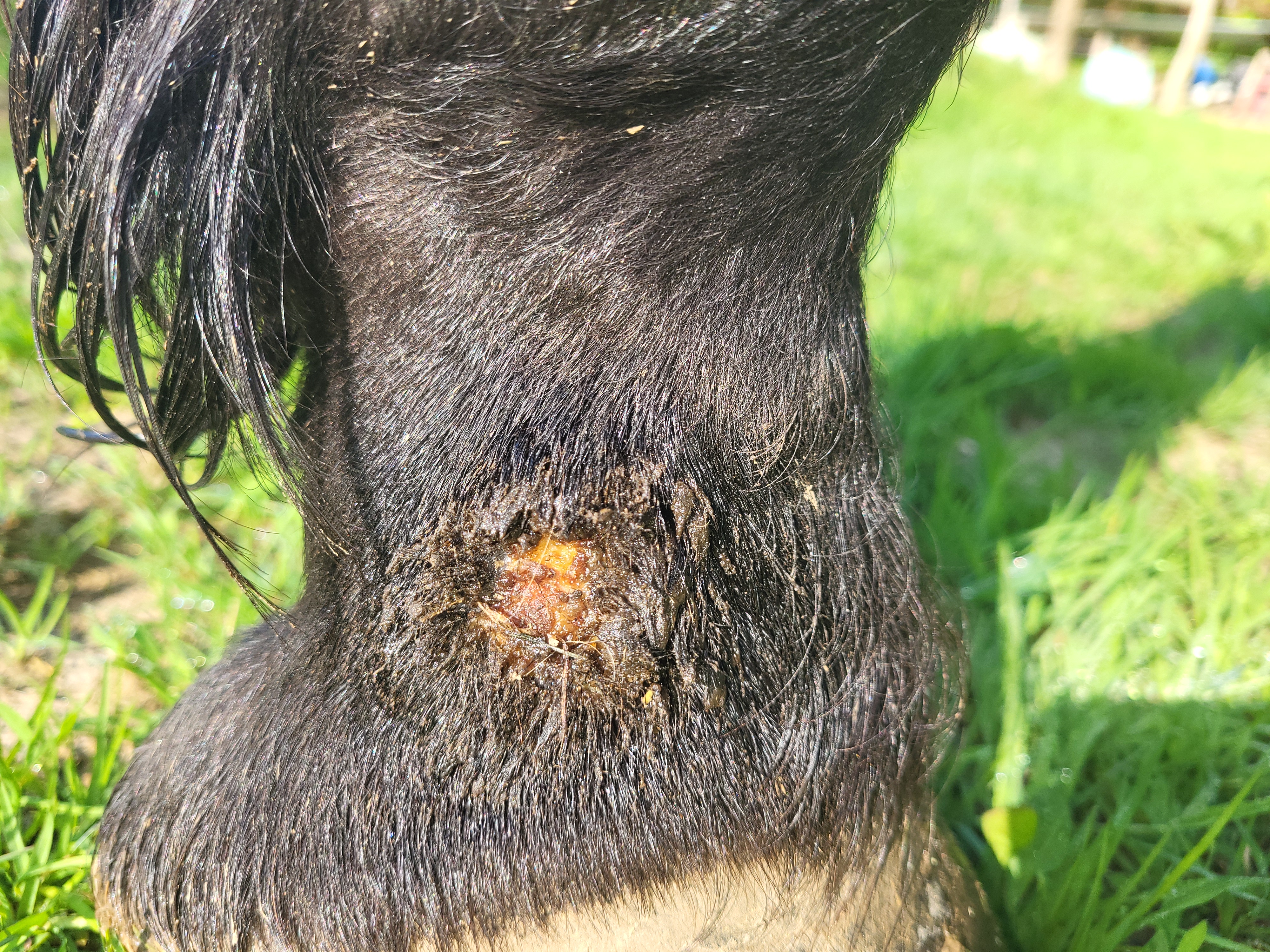 Über die Ostertage habe ich eine Schmierpause eingelegt, da seine Fessel dick geschwollen war. War glaube ich ganz gut, da nun alles schön dick eingekrustet ist. Habe heute wieder geschmiert, auf die Kruste und die freie Stelle in der Mitte.