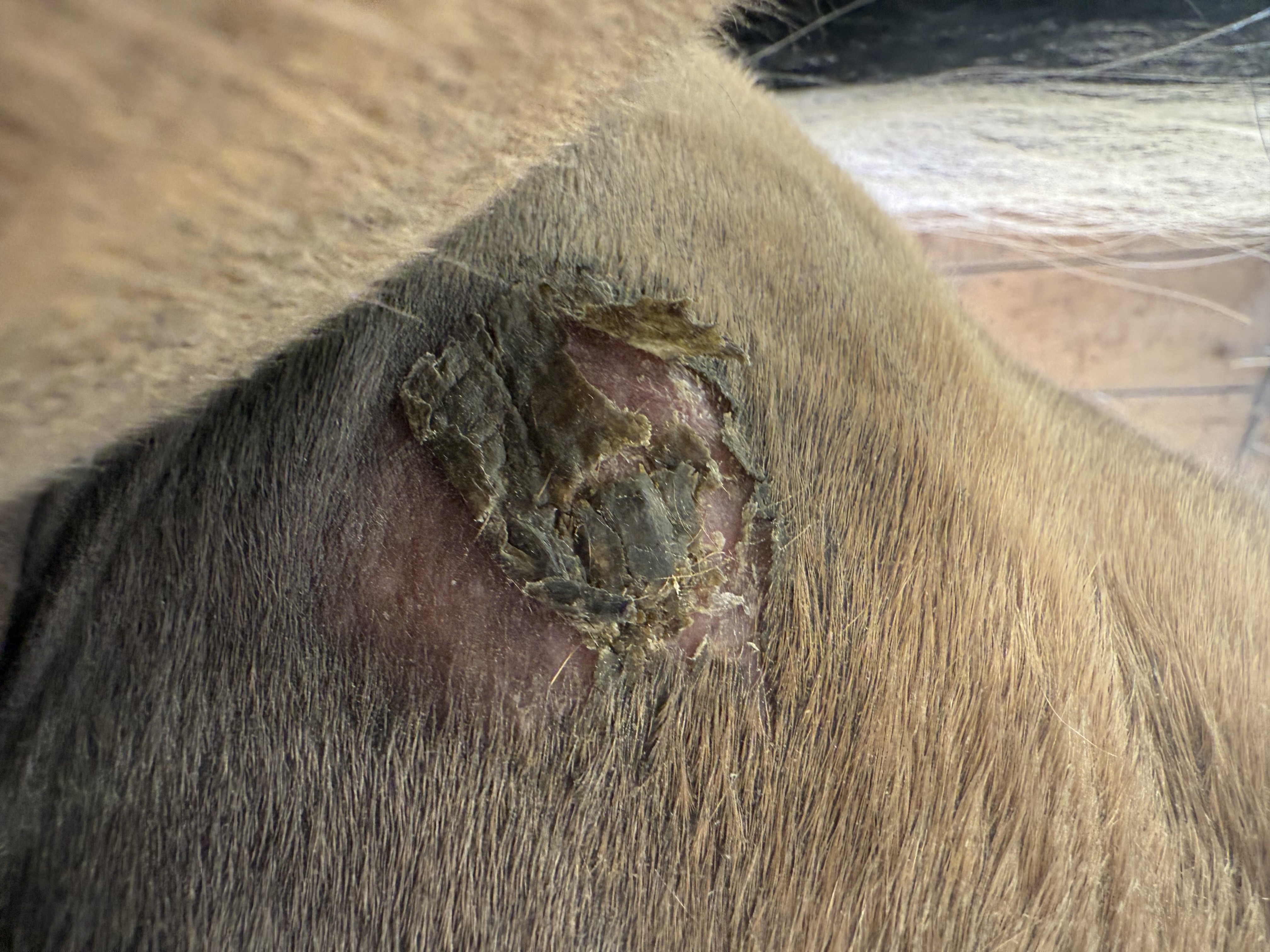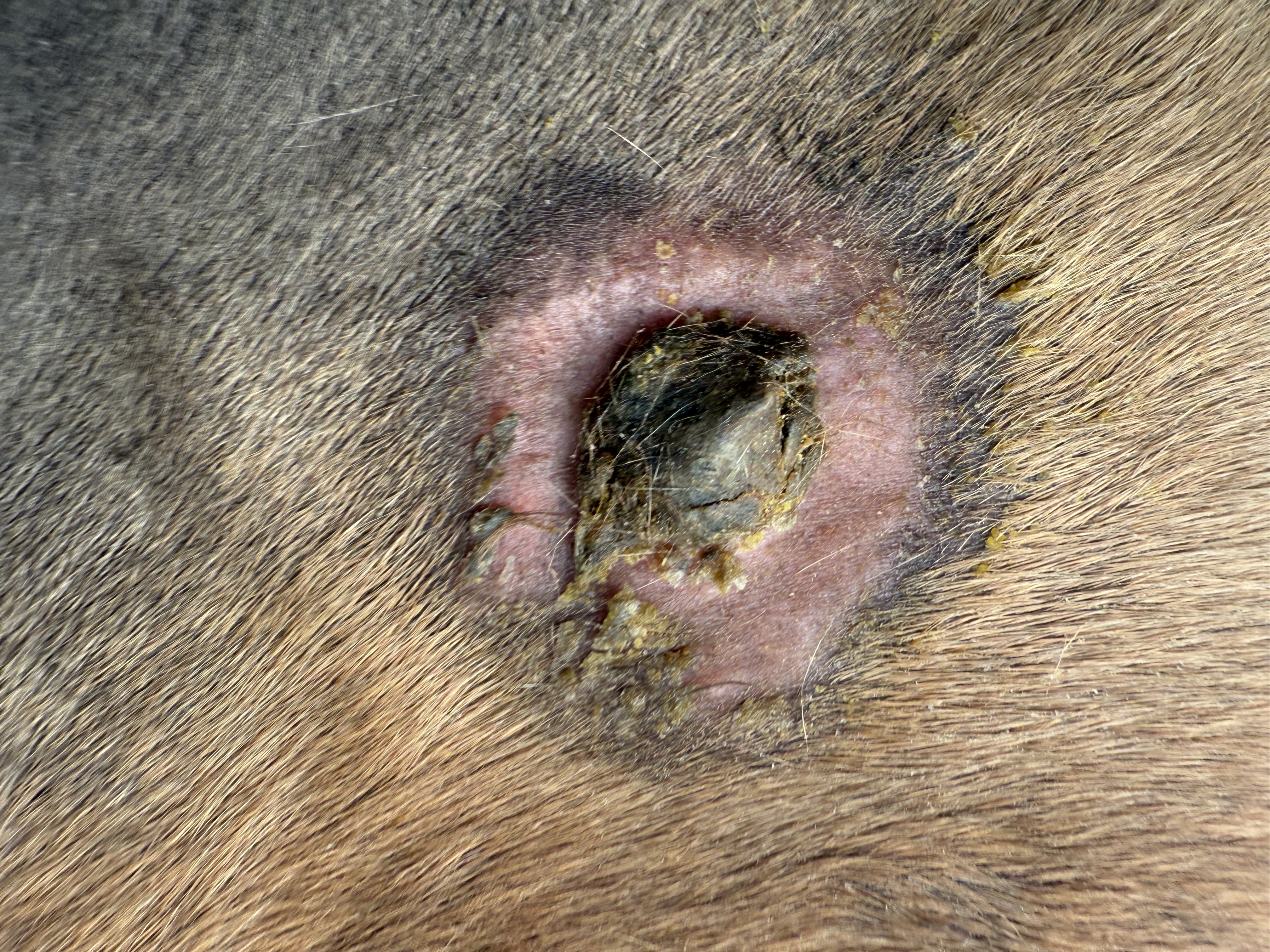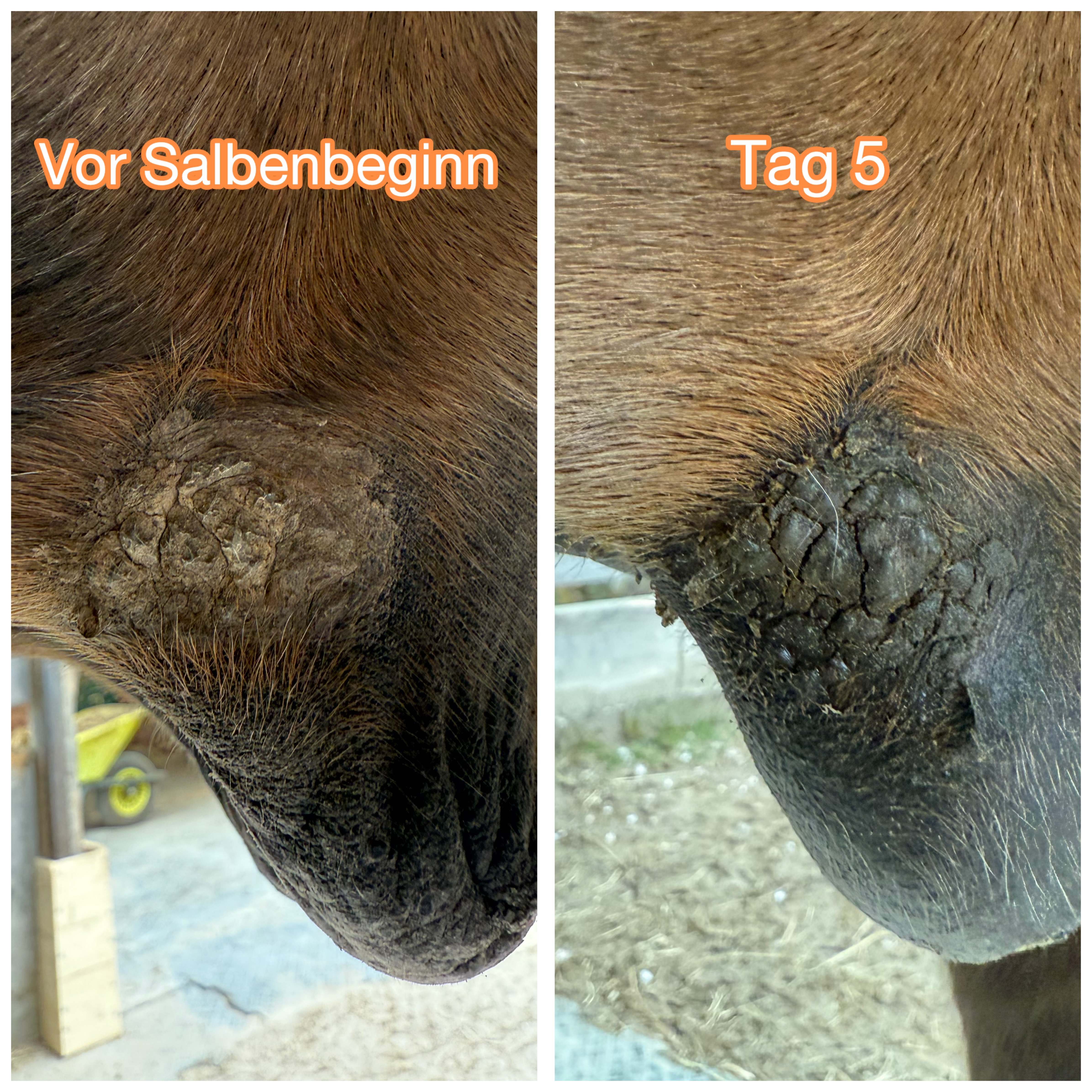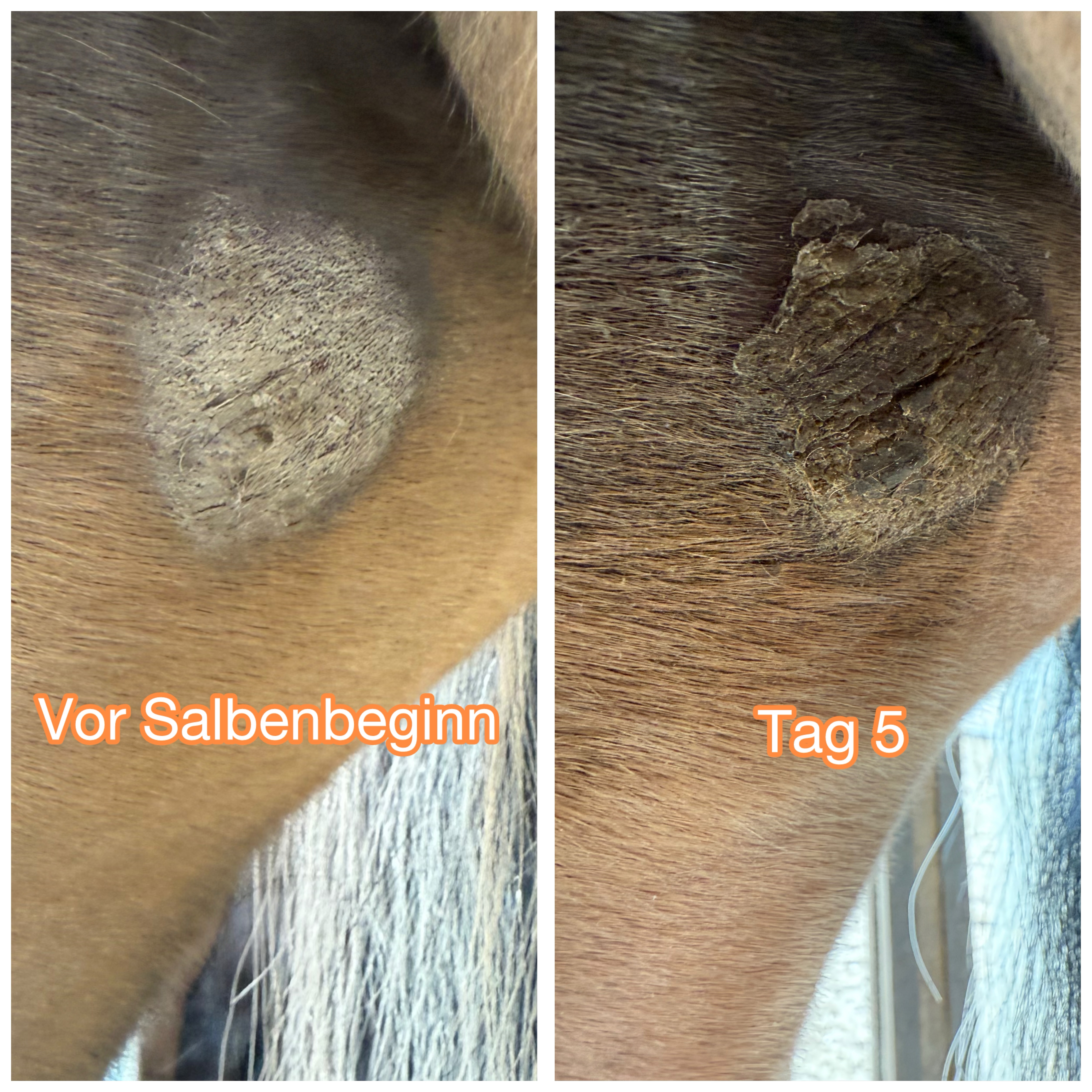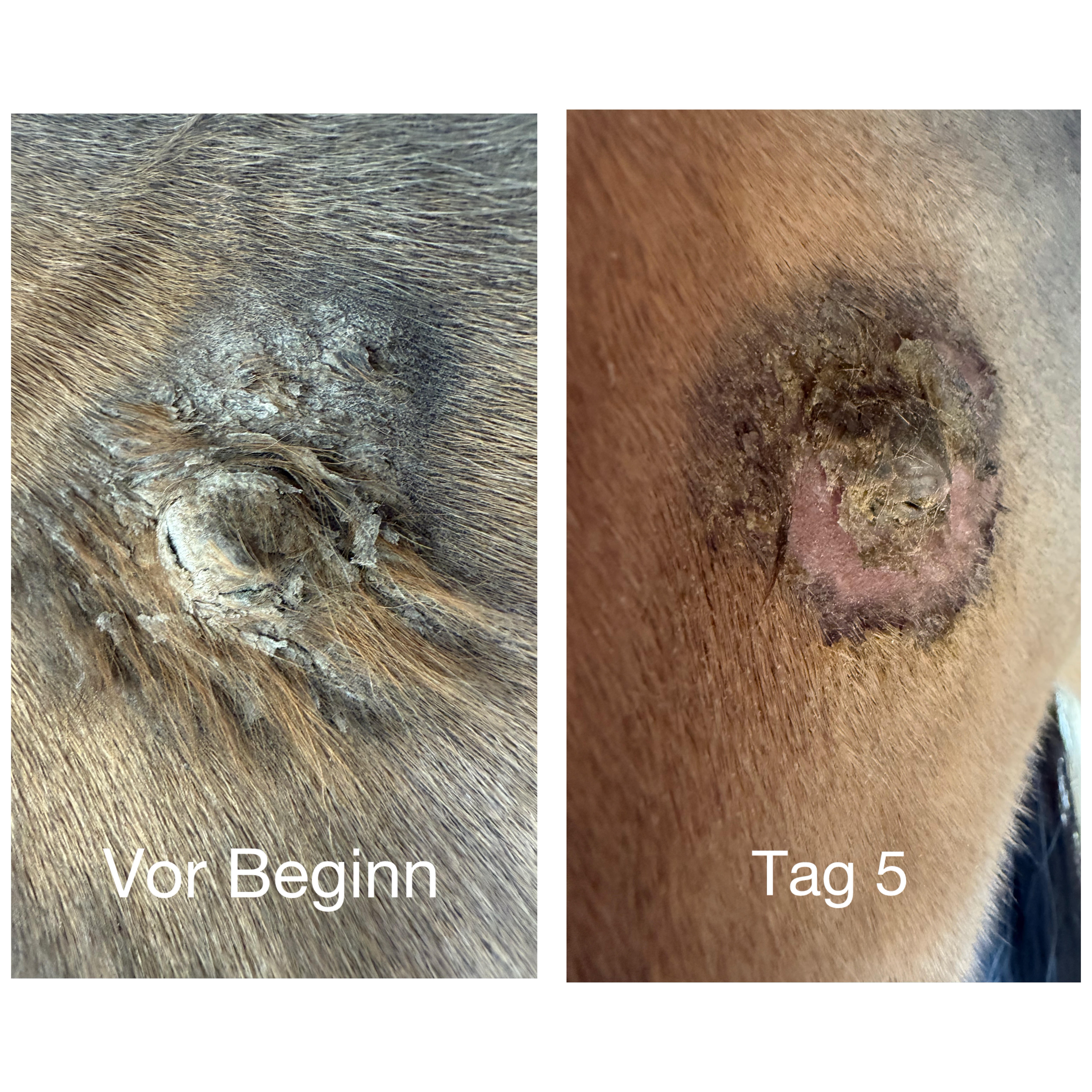 Soll ich nun bei dem dicken Sarkoid, wo sich ringsrum schon was abgelöst hat, auf die rosa Haut auch weiterschmieren? Oder nur in der Mitte auf den Binkel?