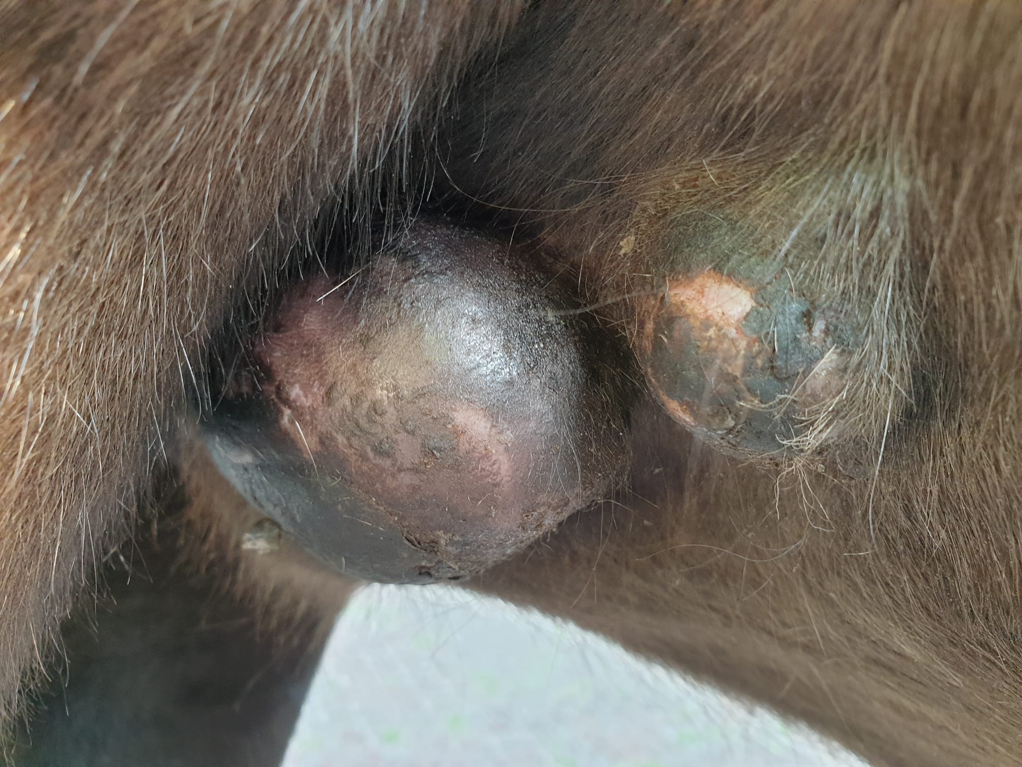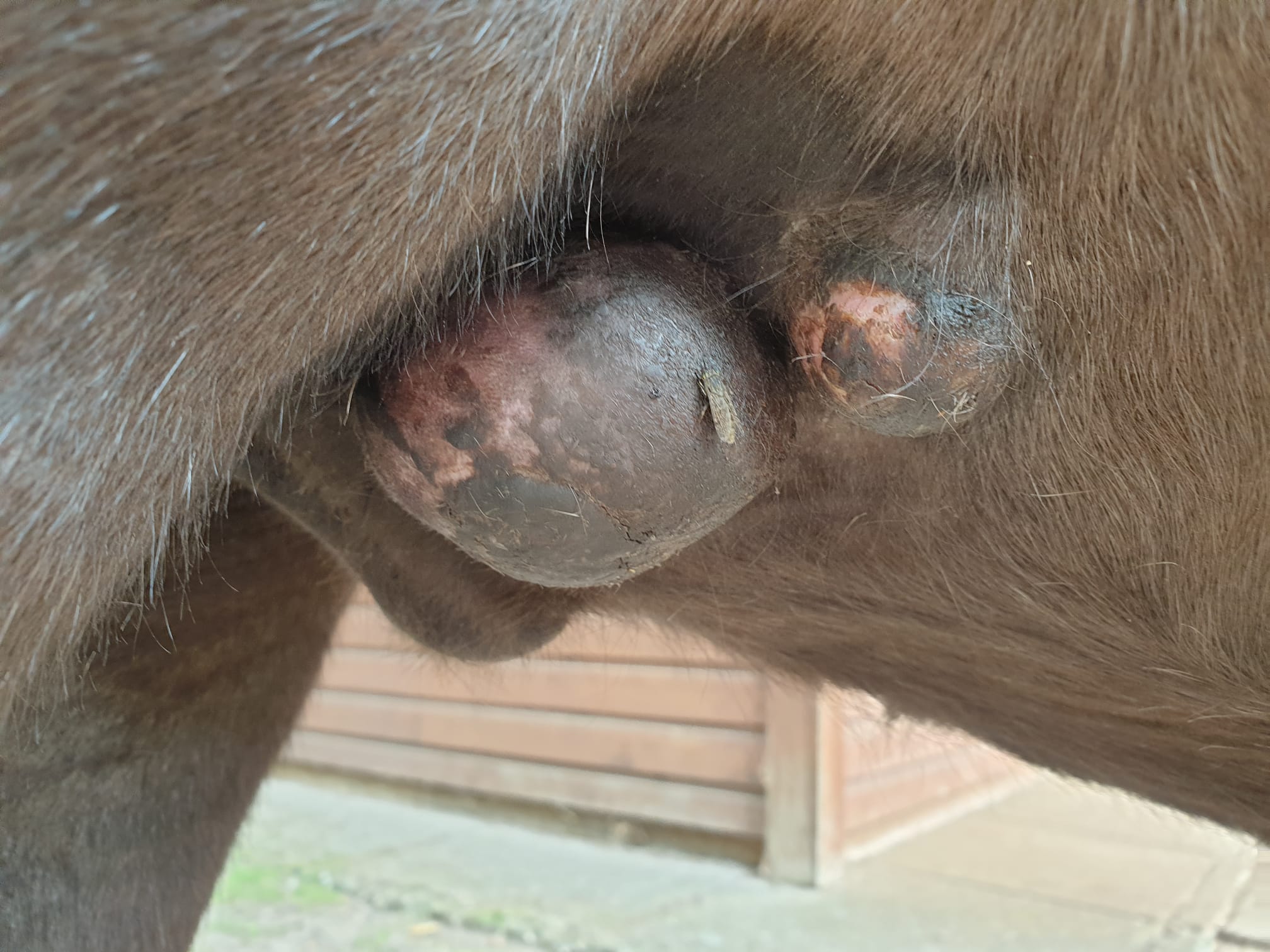 Wurde es die letzten Tage schon zunehmend schwieriger die Sarkoide an der Leiste zu versorgen hat er es heute trotz anbinden und 2 " Mann" kaum mehr das Anfassen toleriert. Mein Mann musste wirklich schnell sein.