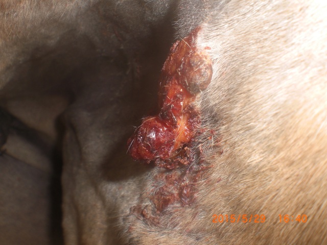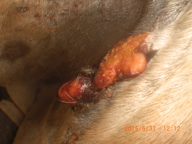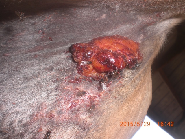 Hallo, nachdem ich nun 2 Tage Schmier-Pause eingelegt hatte, war ich heute überrascht vom Ergebnis: Die Kruste ist weg; da scheint ordentlich was abgebröckelt zu sein! Das Sarkoid ist nun dunkelrosa und "offen", dies jedoch ohne zu nässen. Unsere Pferde sind ja seit vorgestern auf der Weide untergebracht - leider sind die Sarkoide ein Fressen für die Fliegen (sieht man auch gut auf den Fotos).