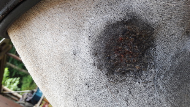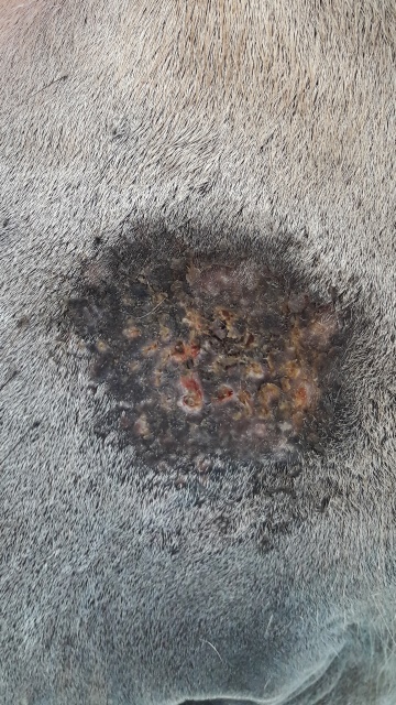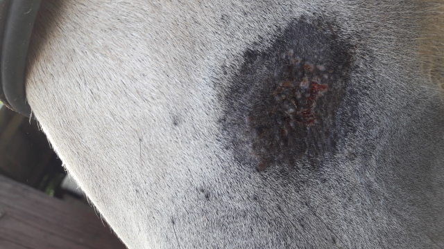 Ich muss übrigens zurück nehmen, dass es bei uns ruhiger geworden ist. Als ich heute zum Stall kam, war das Sarkoid an der Nase etwas rissig und da drunter blutig, bisschen mehr als gestern und für mich kein Foto wert. Hab geschmiert, bin geritten und nach dem reiten sah es so aus