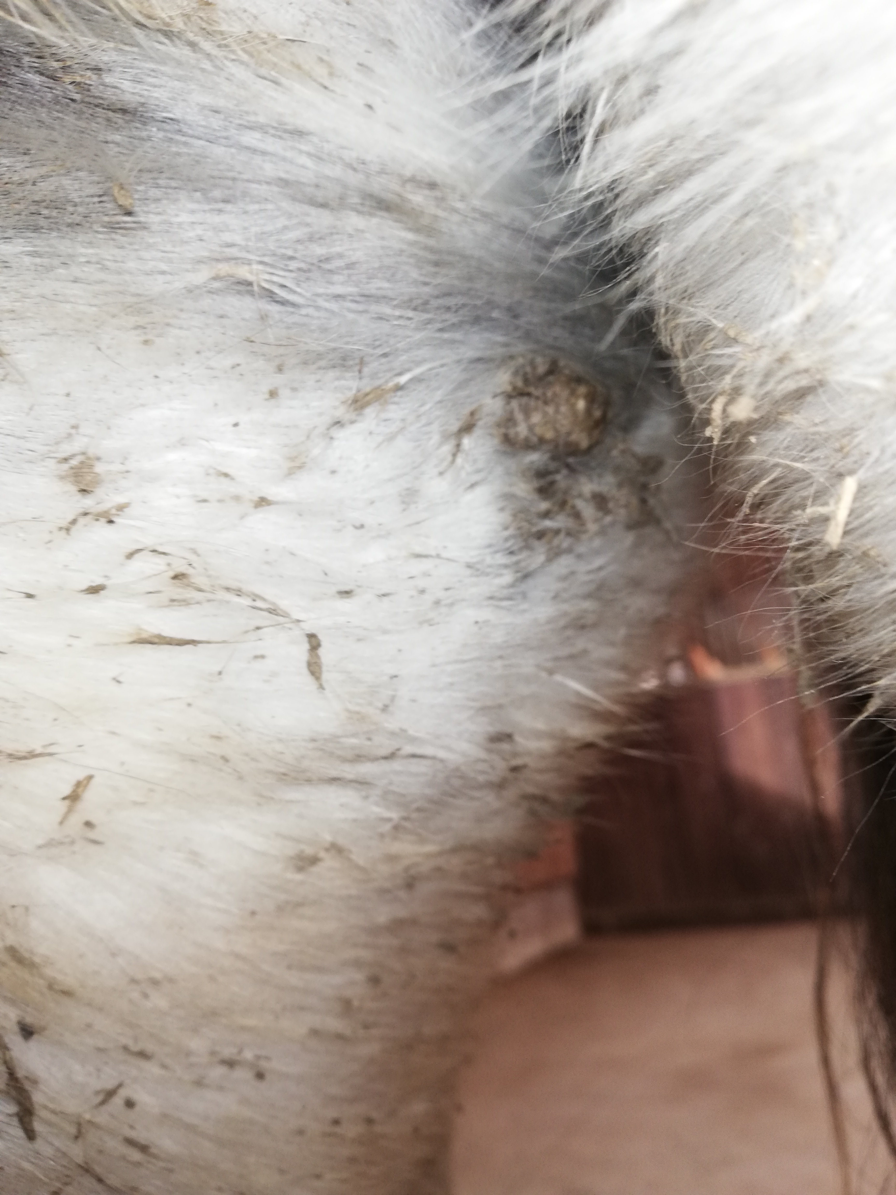 Schmierst Du den Schatten unter dem eigentlichen Sarkoid am Oberschenkel auch mit? Diese leicht schuppige, dunkle Fellfläche?