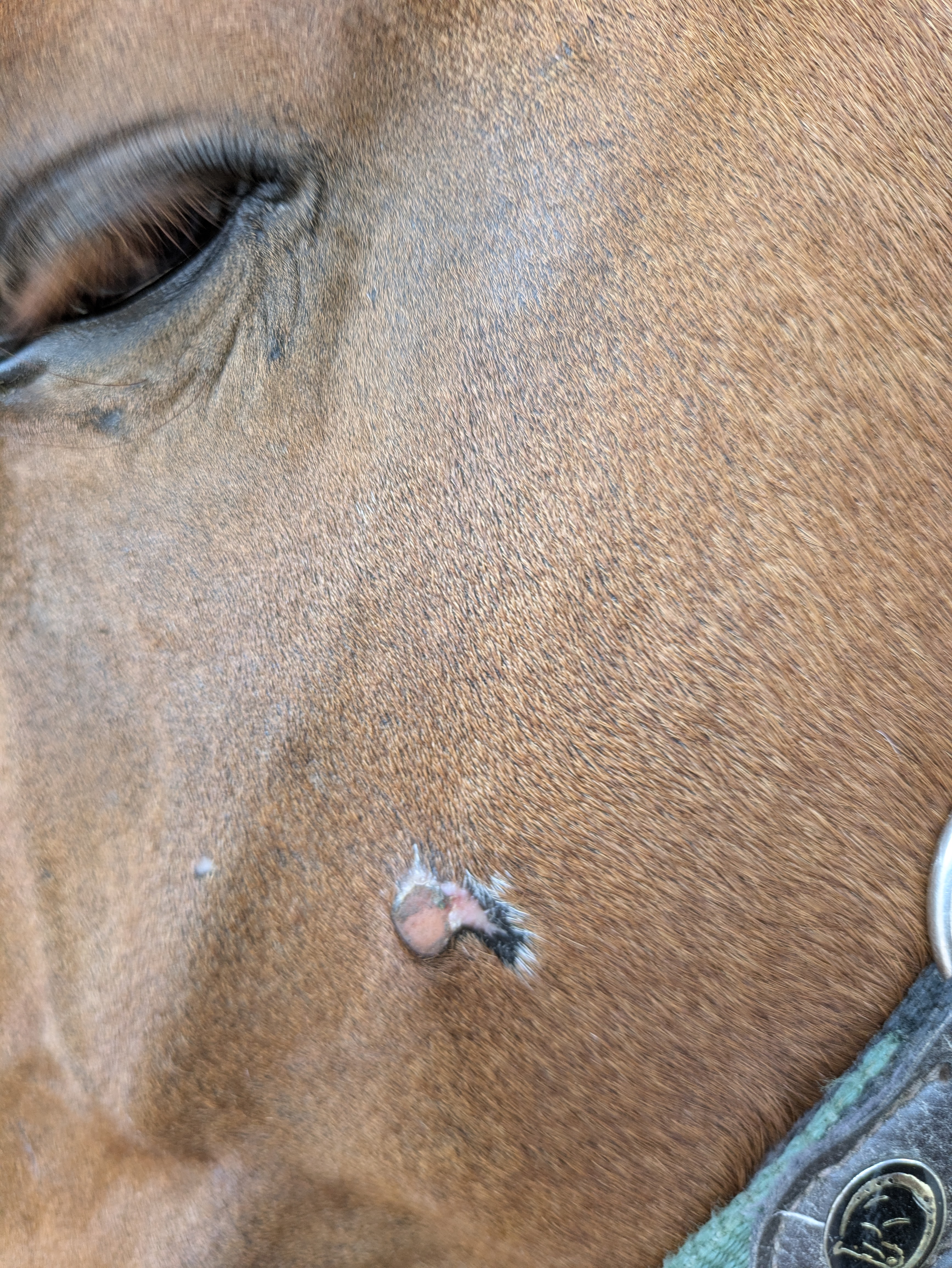 - 6-2024 habe ich das Pferd mit Sarkoiden an der Wange und Brust gekauft. Diese wurden vom Verkäufer (Züchter und Tierarzt) mit Stelfonta behandelt. Die Behandlung mit Stelfonta bzw. der Folgeprozess muss für Gavi sehr schmerzhaft gewesen sein. Noch in der Heilungsphase habe ich ihn in den Stall meiner Wahl umgestellt.