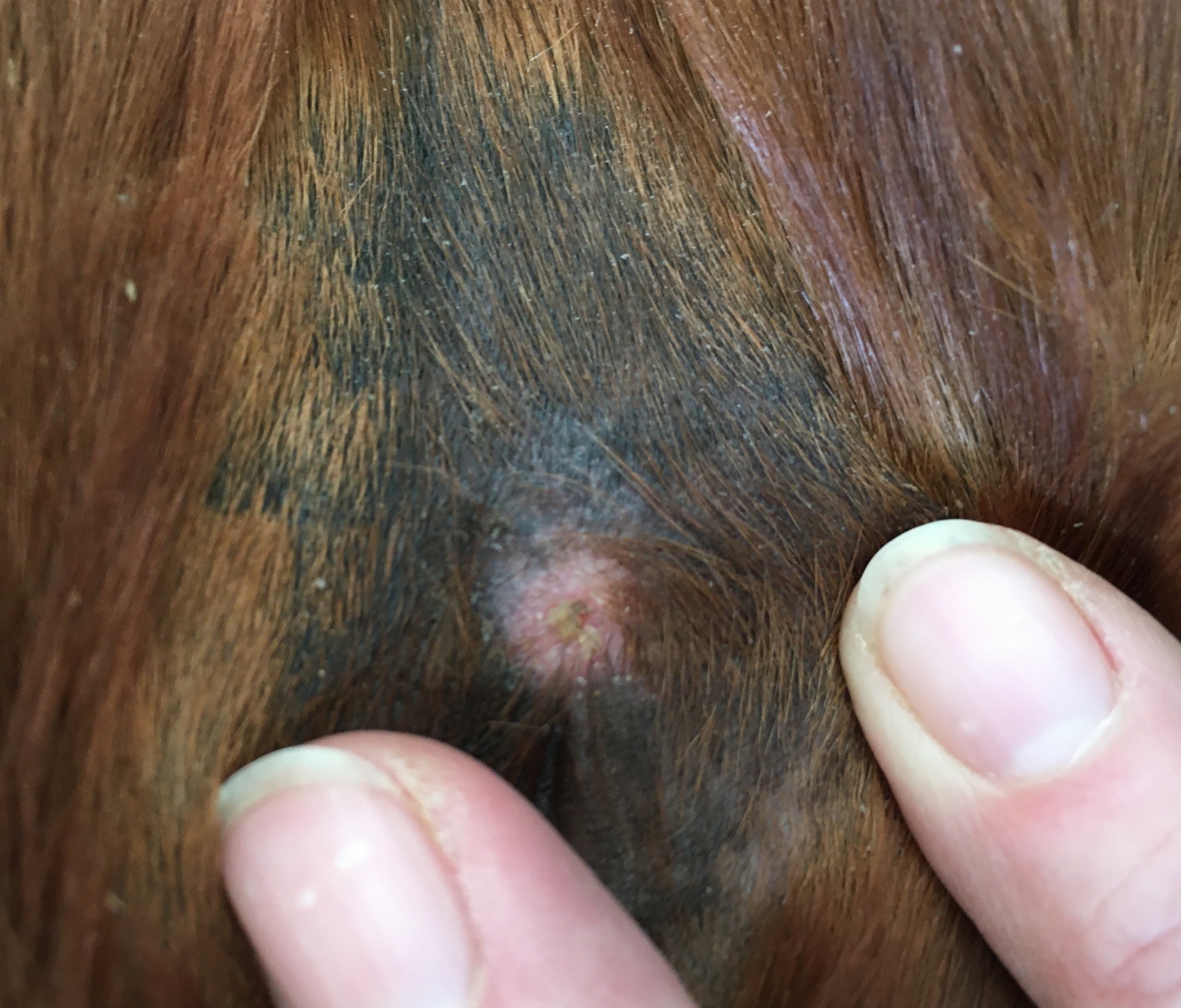 "Knopstelle" immer noch zu sehen, nicht ganz glatt, aber mindestens drumrum wachsen schon mal wieder Haare.