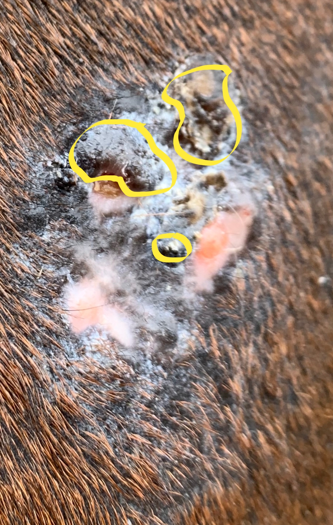 Der riesige Hügel ganz links ist gefühlt größer geworden. Sprich vielleicht doch eine Reaktion (Entzündung) auf das DERMEQUIN. Dort hat sich die Kruste auch überhaupt nicht gelöscht. Zumindest ist er dort überhaupt wund geworden.