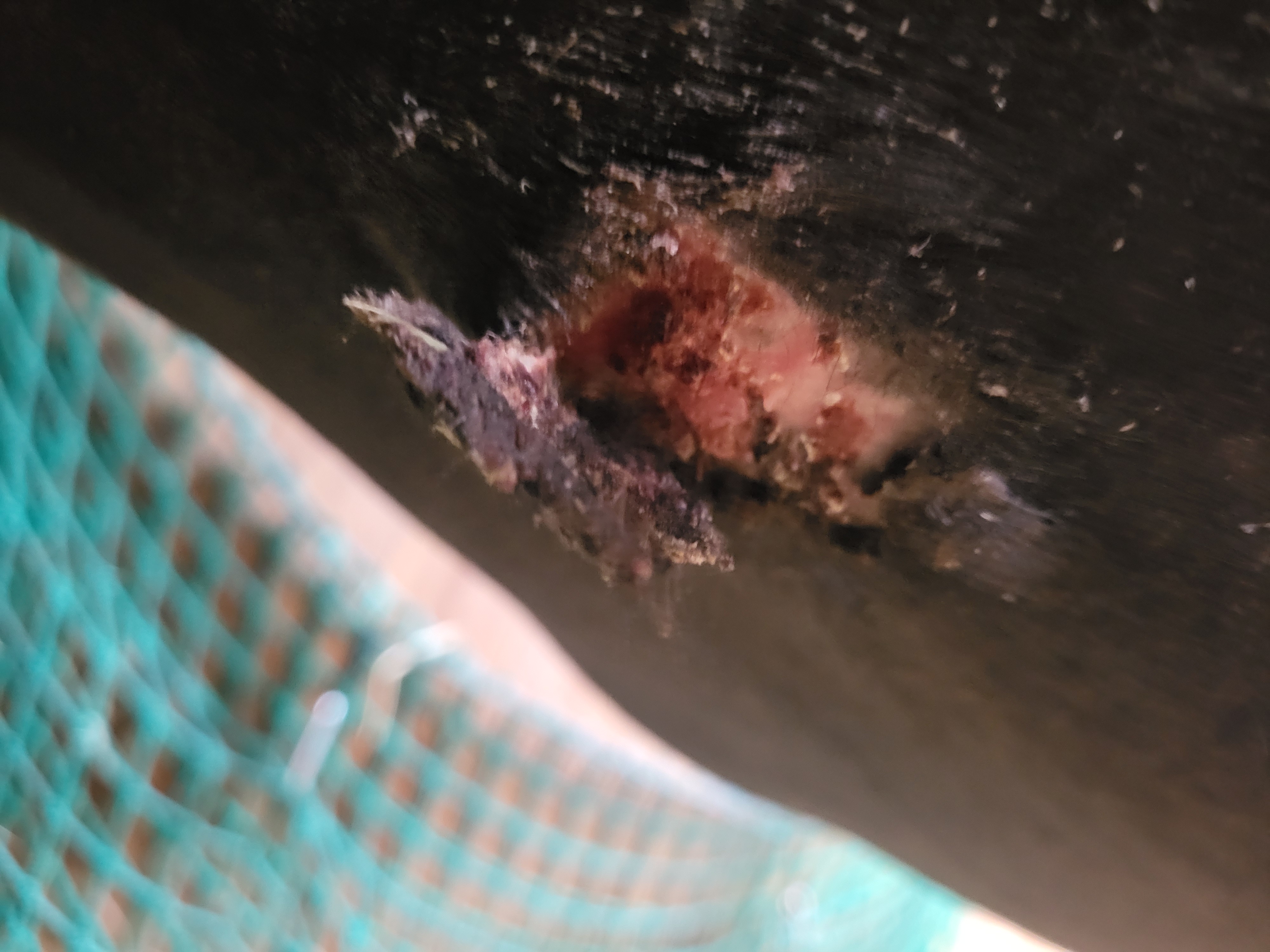 Das Sarkoid wächst weiter. Es ist von Fingernagelgröße auf ca. 4.5 cm angewachsen. Ist das normal???? Wir schmieren abwechselnd 4 Tage Dermequin, dann Pause. Heute Abend war der erste Tag der Pause und es scheint als ob sich die Kruste am vorderen Rand ablöst. Ich habe mich schwer beherrscht und nicht daran geknibbelt.