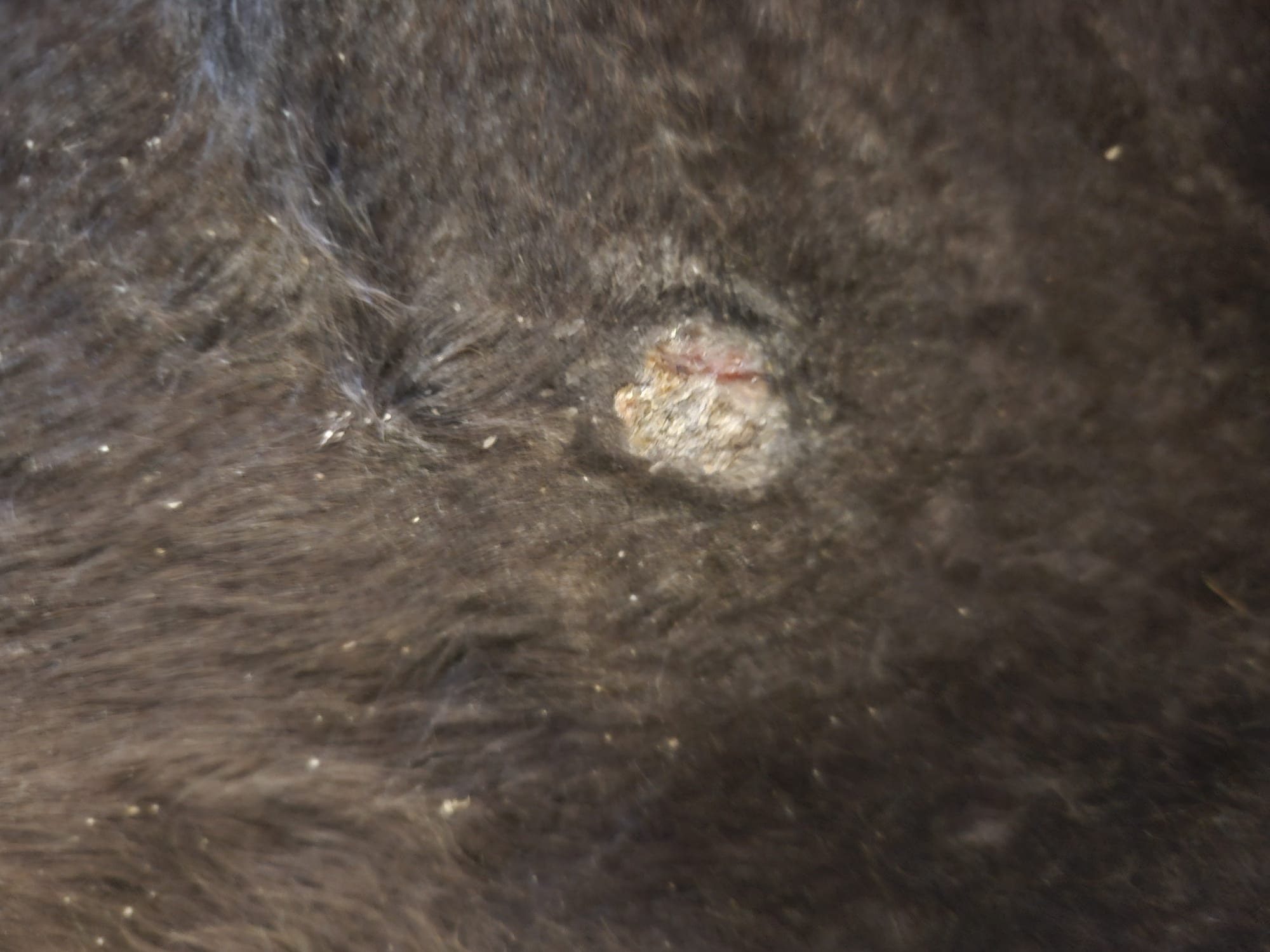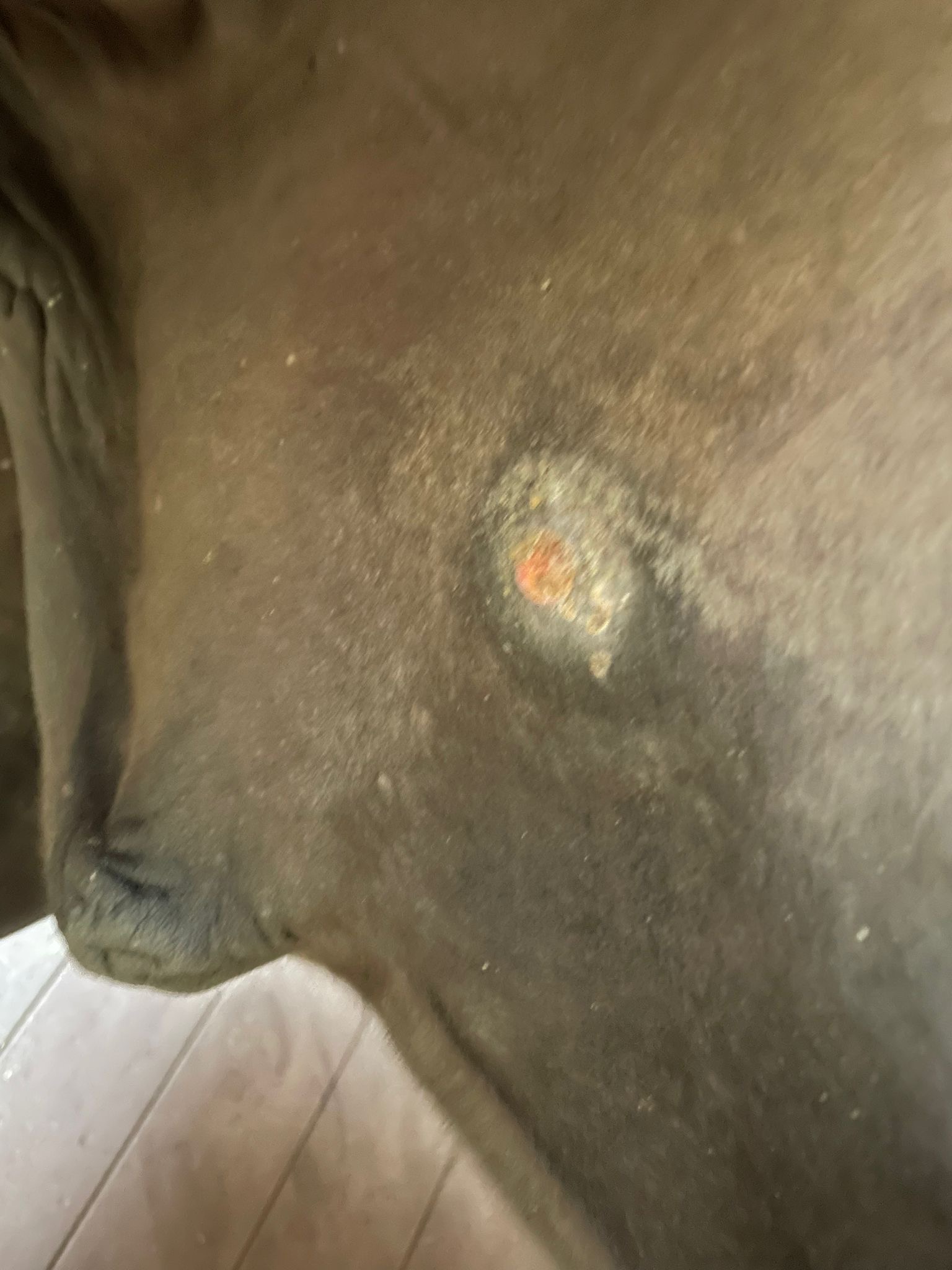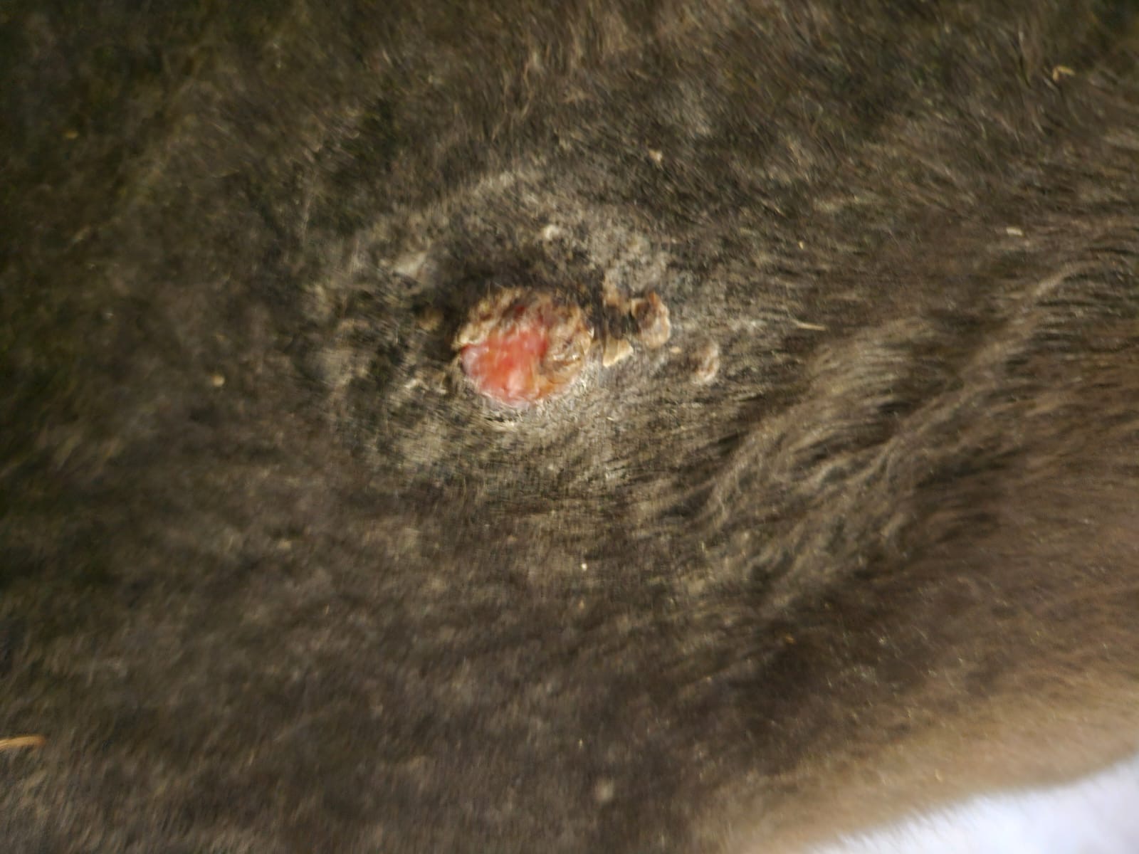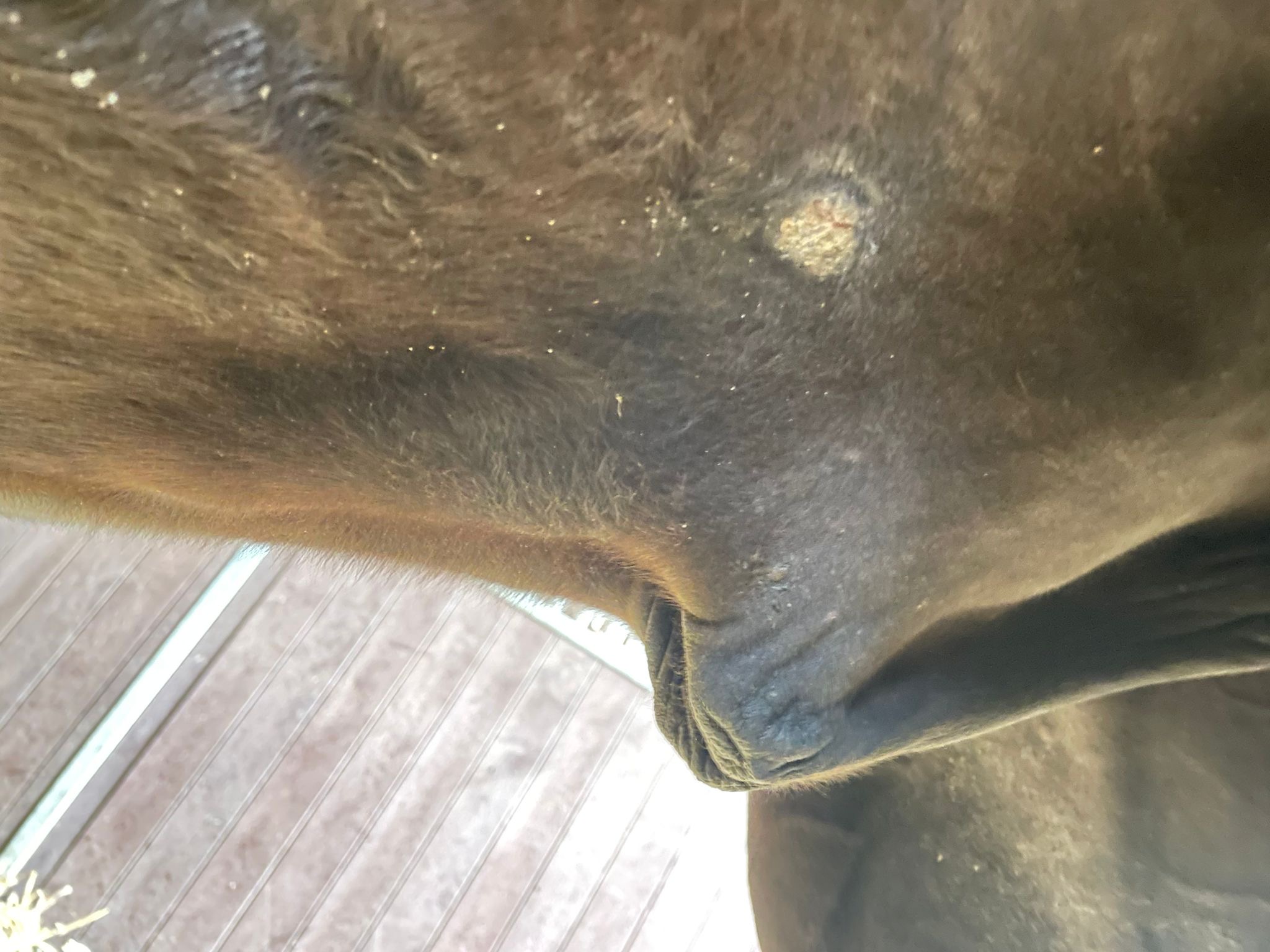 Links und rechts scheint nicht eindeutig zu sein. Mein Sohn war gerade am Stall. Die Kruste von dem älteren Sarkoid auf Emils rechter Seite ist ab.
