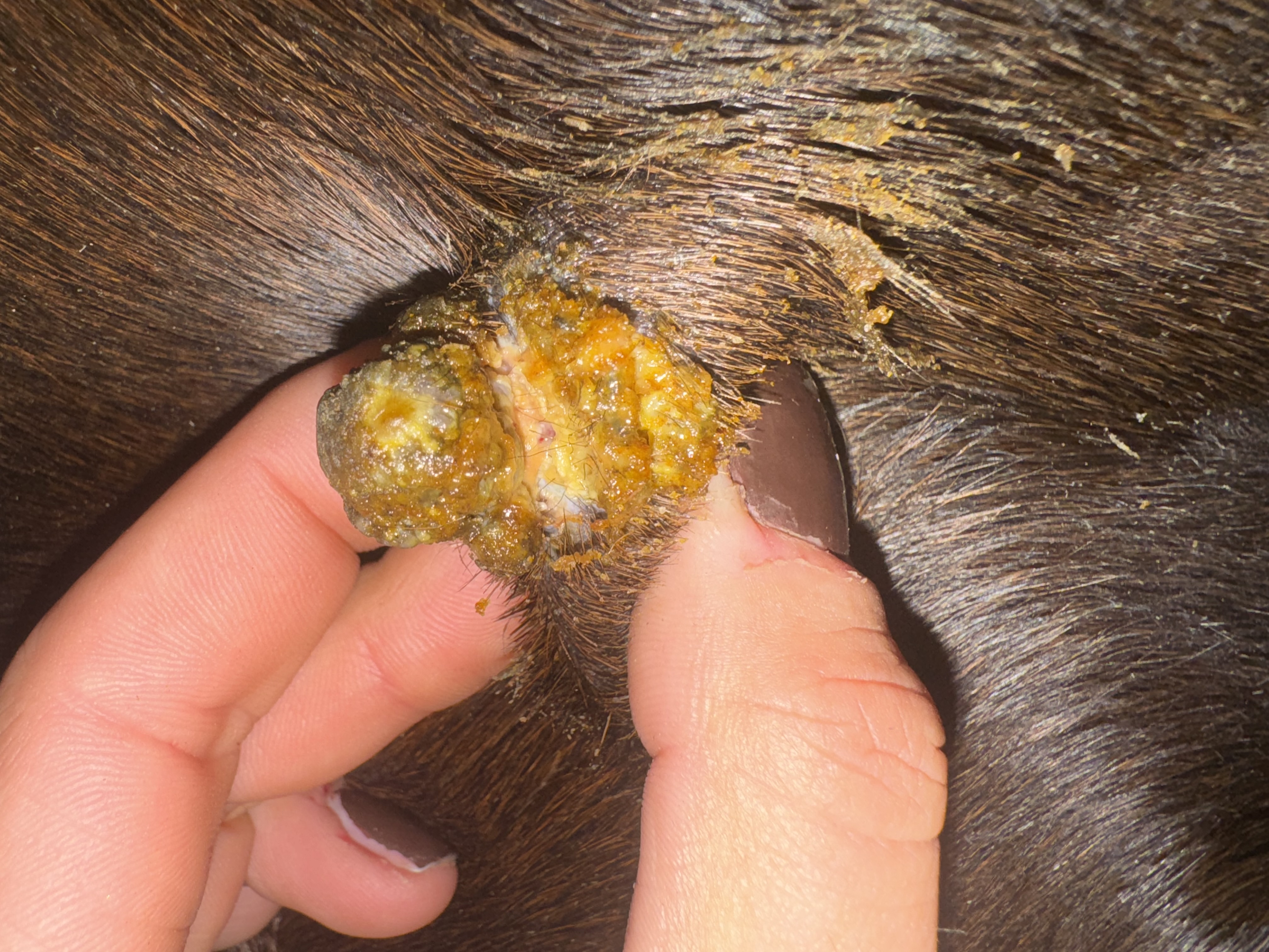 Heute haben alle wieder Tumor Gewebe verloren und hatten neue eingetrocknete blutige Stellen. die kleinen an der Brust kommen langsam an ihre Substanz, ich denke, da liegt nicht viel Tumor Gewebe darunter.