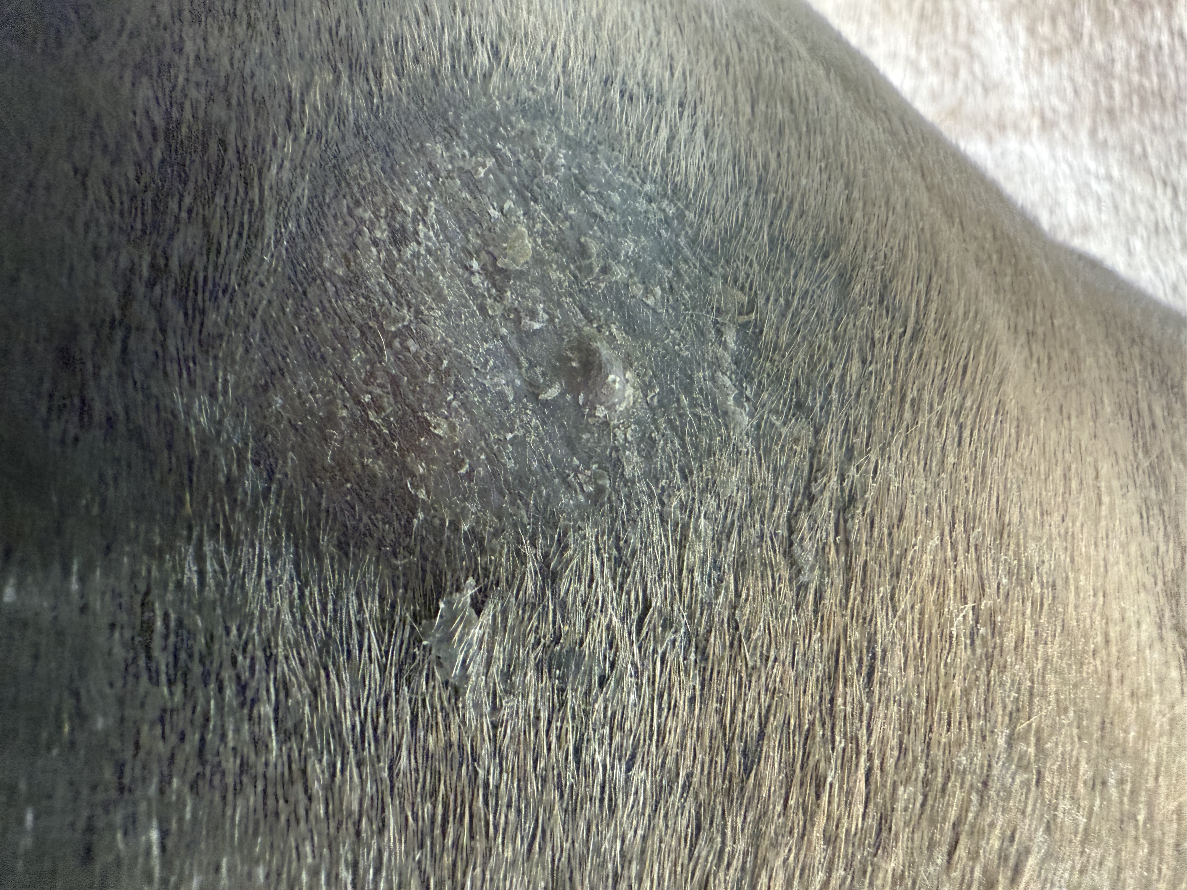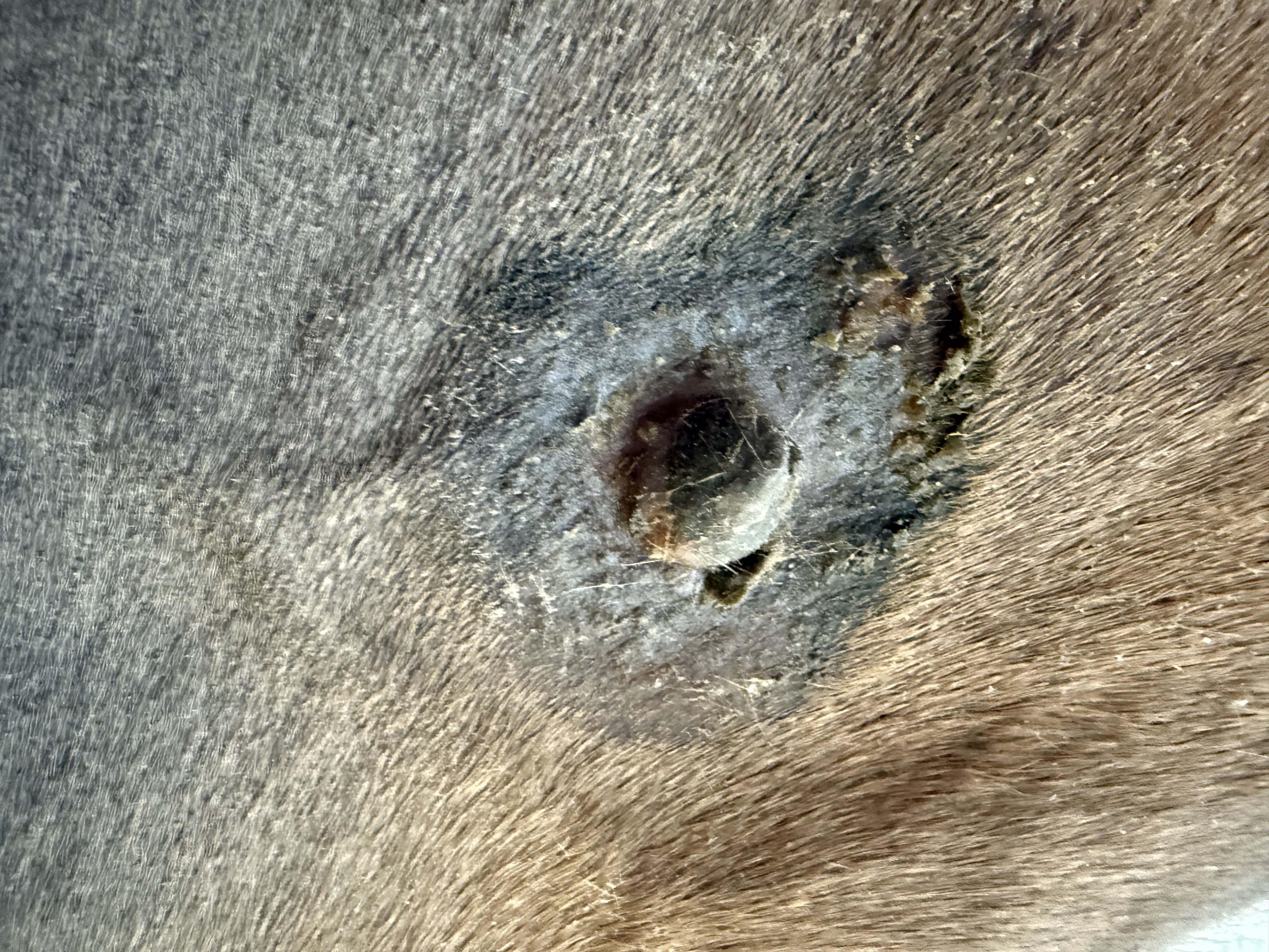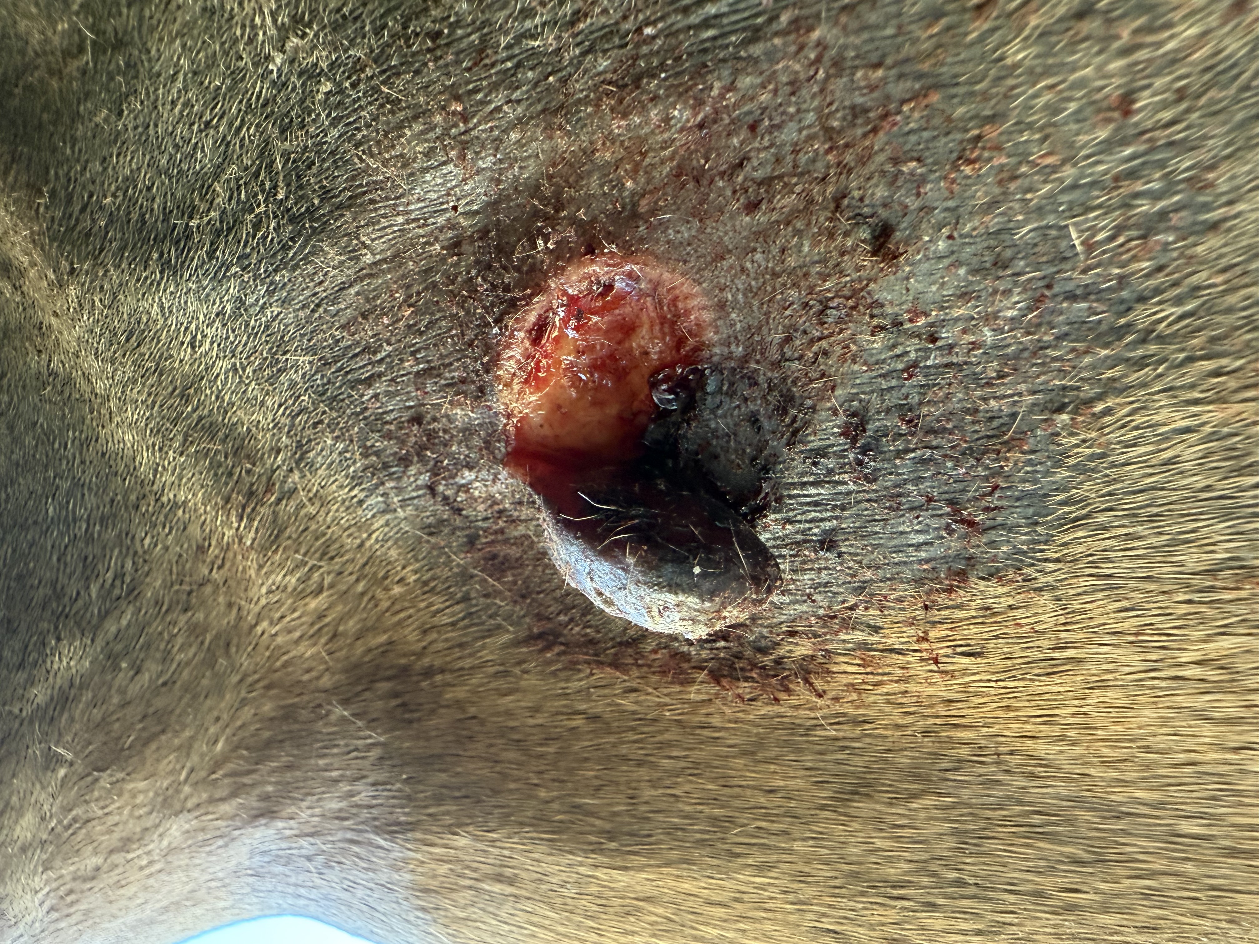 Ich hab jetzt das kleine Fitzelchen Haut an dem das Sarkoid noch hing, abgeschnitten. So konnte ich es trocken abtupfen und hab direkt Salbe drauf geschmiert.