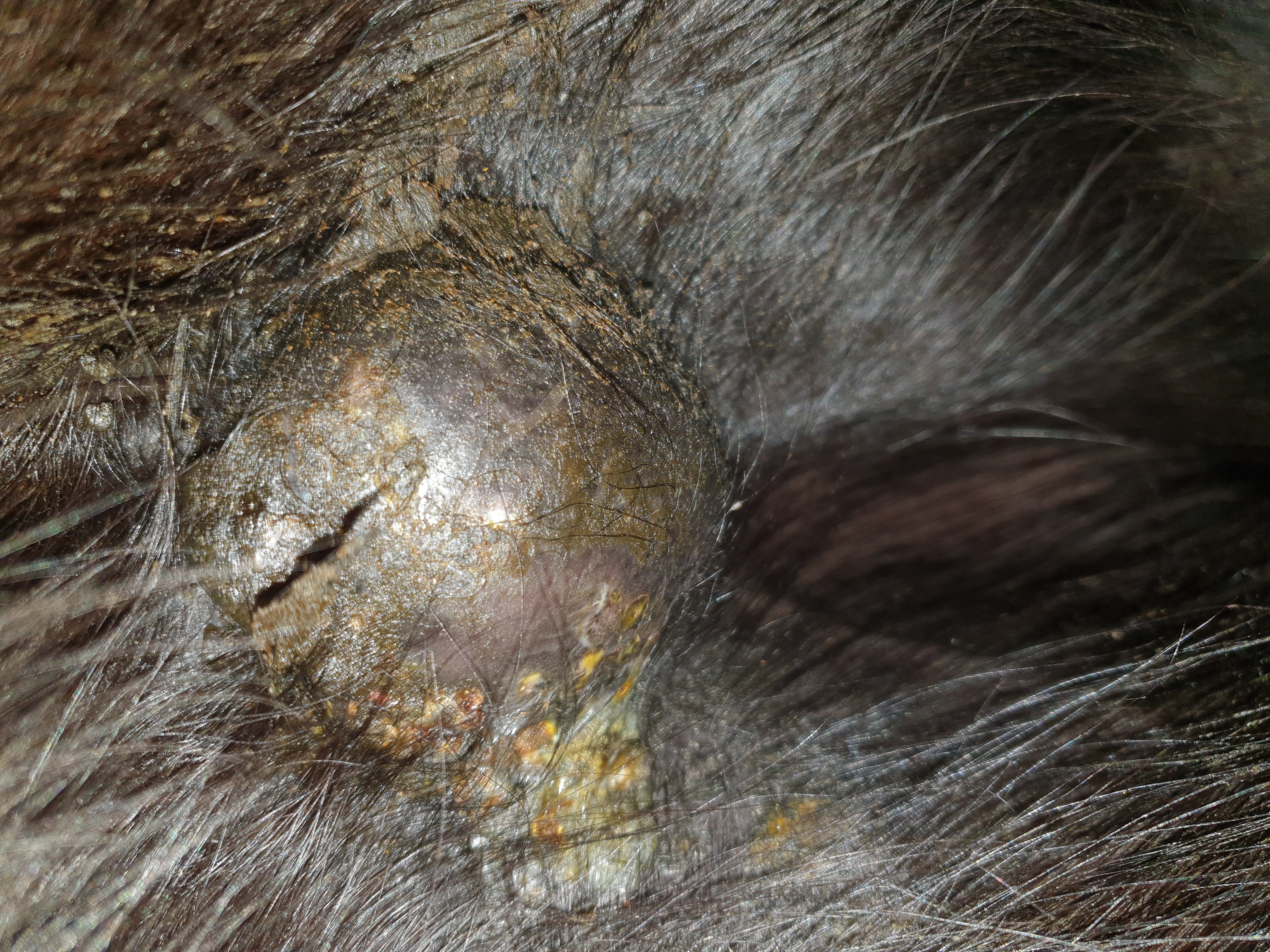 Ich sehe bislang noch nicht so viel. Es ist etwas größer geworden, es bilden sich kleinere Krusten und am Rand sieht man auch etwas gelbe Flüssigkeit aber von abfallen ist es noch ganz weit weg.....