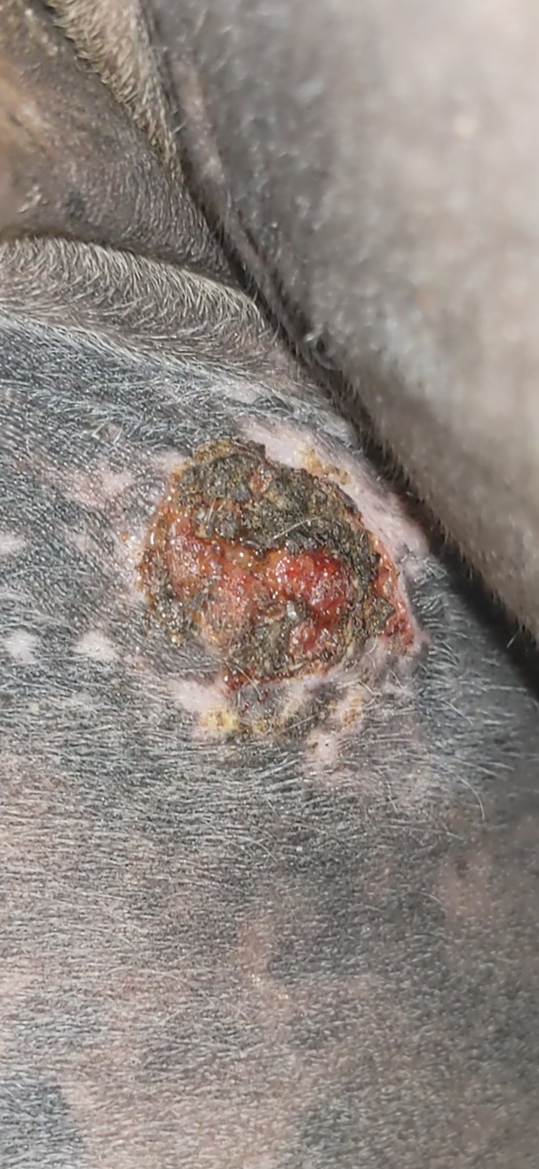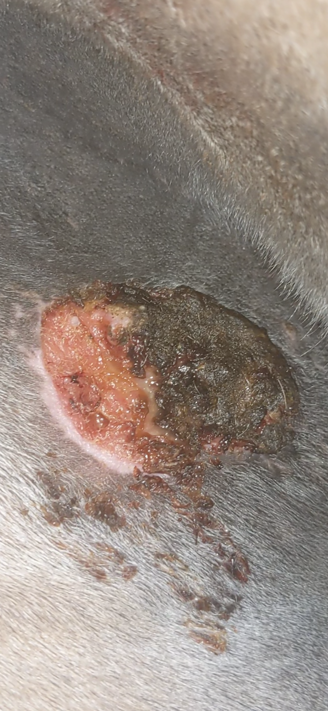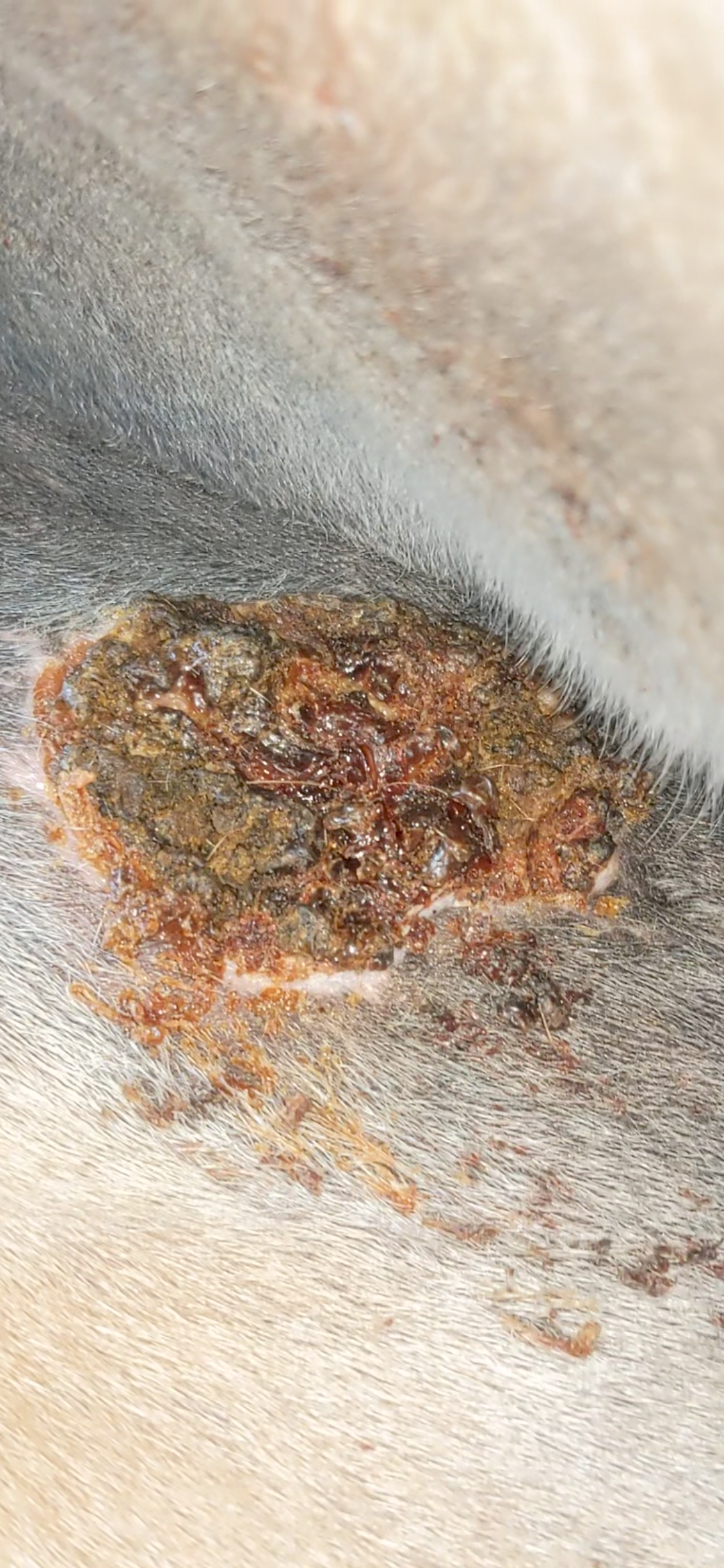 Nr. 4 hat wie Nr.1 auch vorher 1:1 bekommen. Aber auch dem habe ich hochkonzentriertert volle Ladung gegeben. Komischer Weise ist der davon gar nicht angeschwollen. Hier hat Pony aber nach dem ersten Kleistern wieder einmal die Kruste abgebissen. Ich habe dann direkt nochmal volle Ladung drauf gehaun. Gefühlt ist es nun etwas flacher und hat eine neue Kruste.