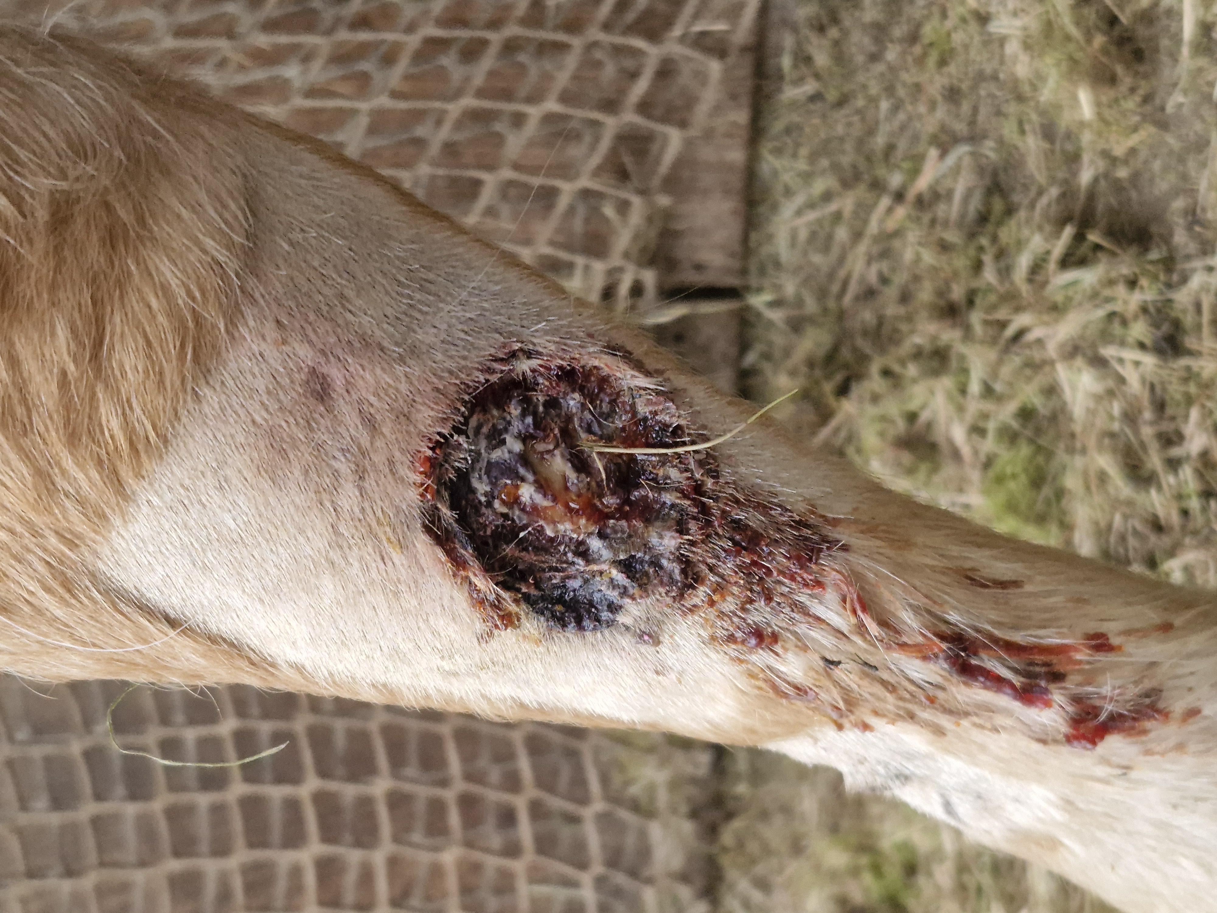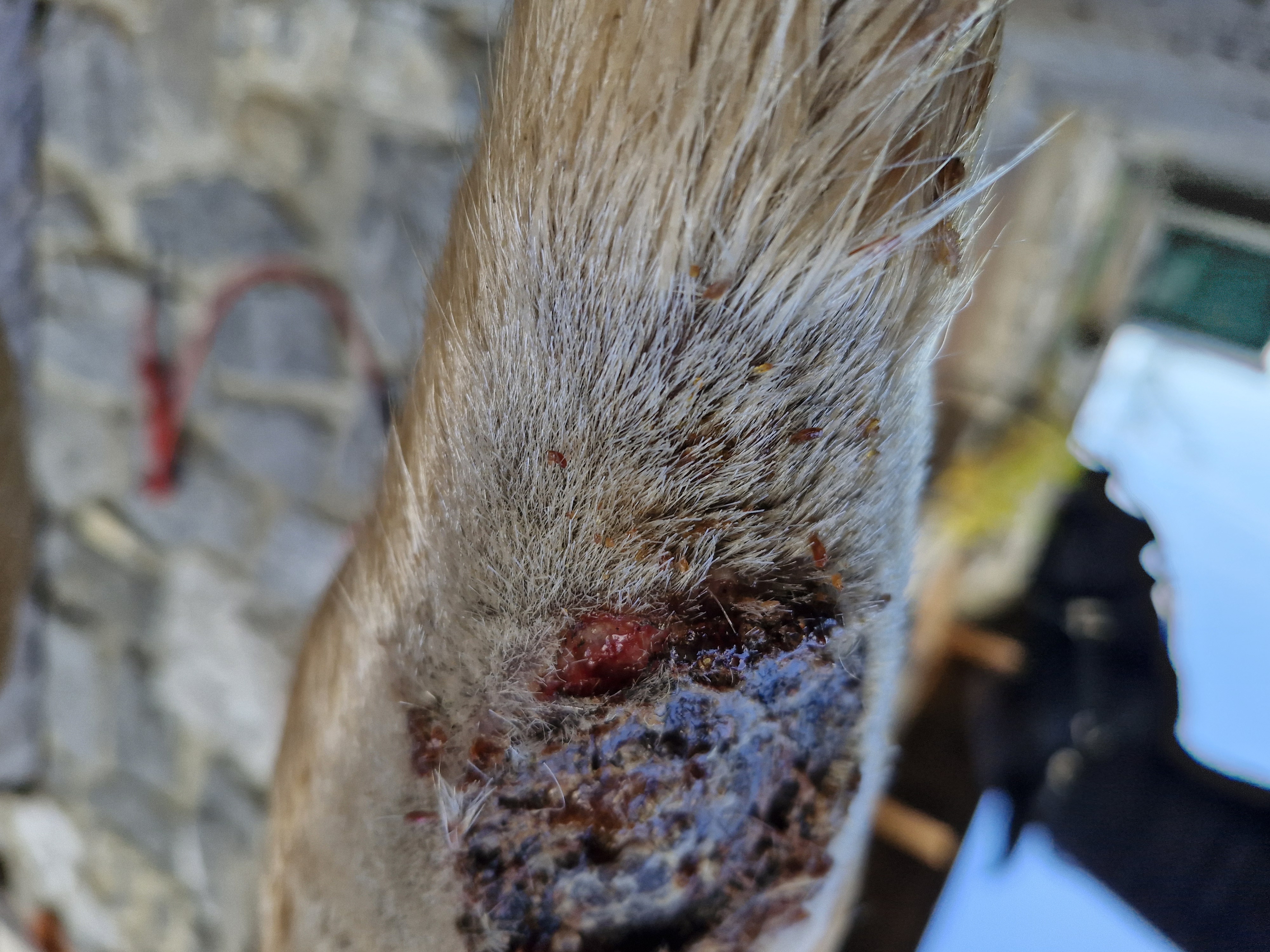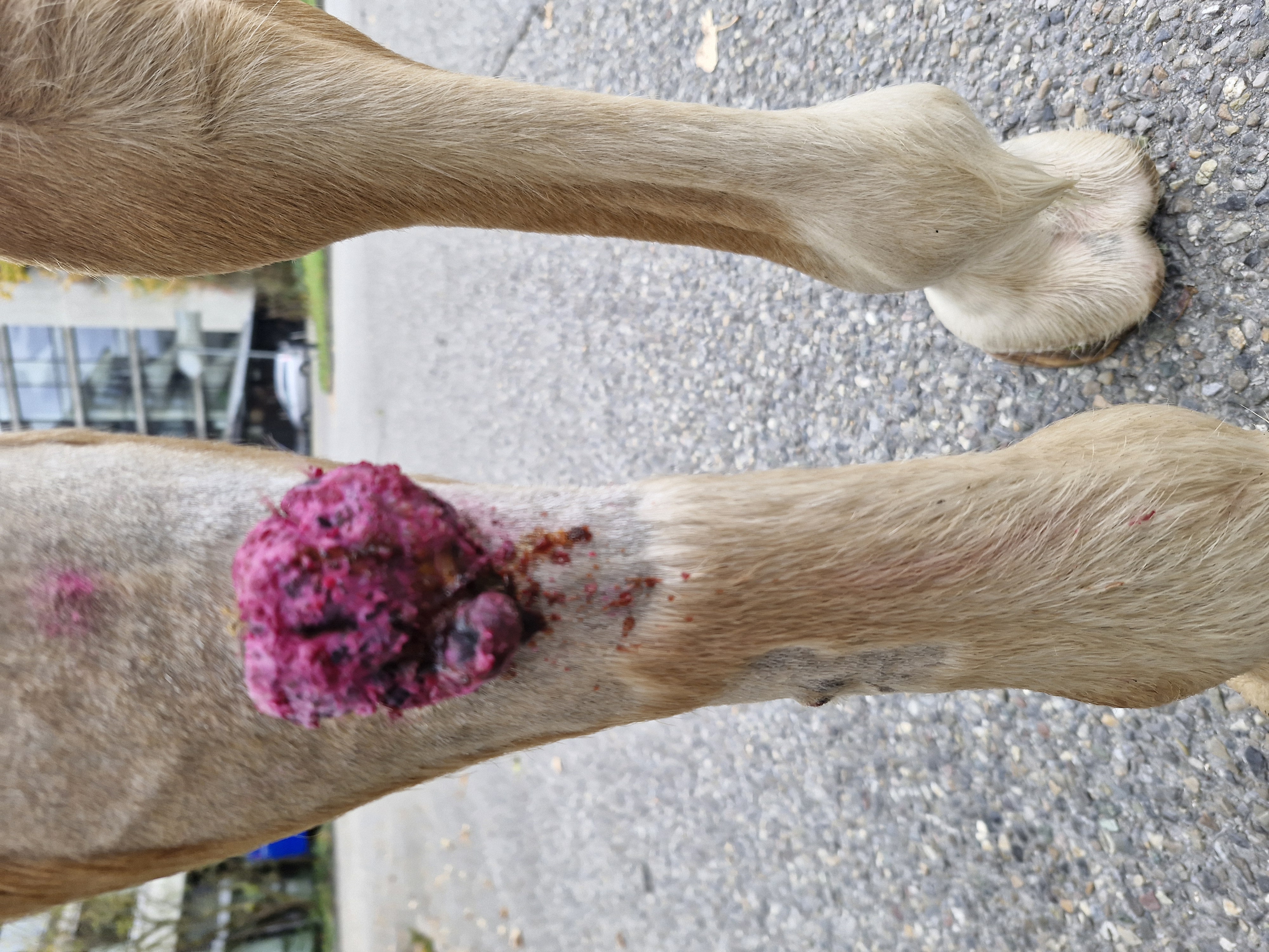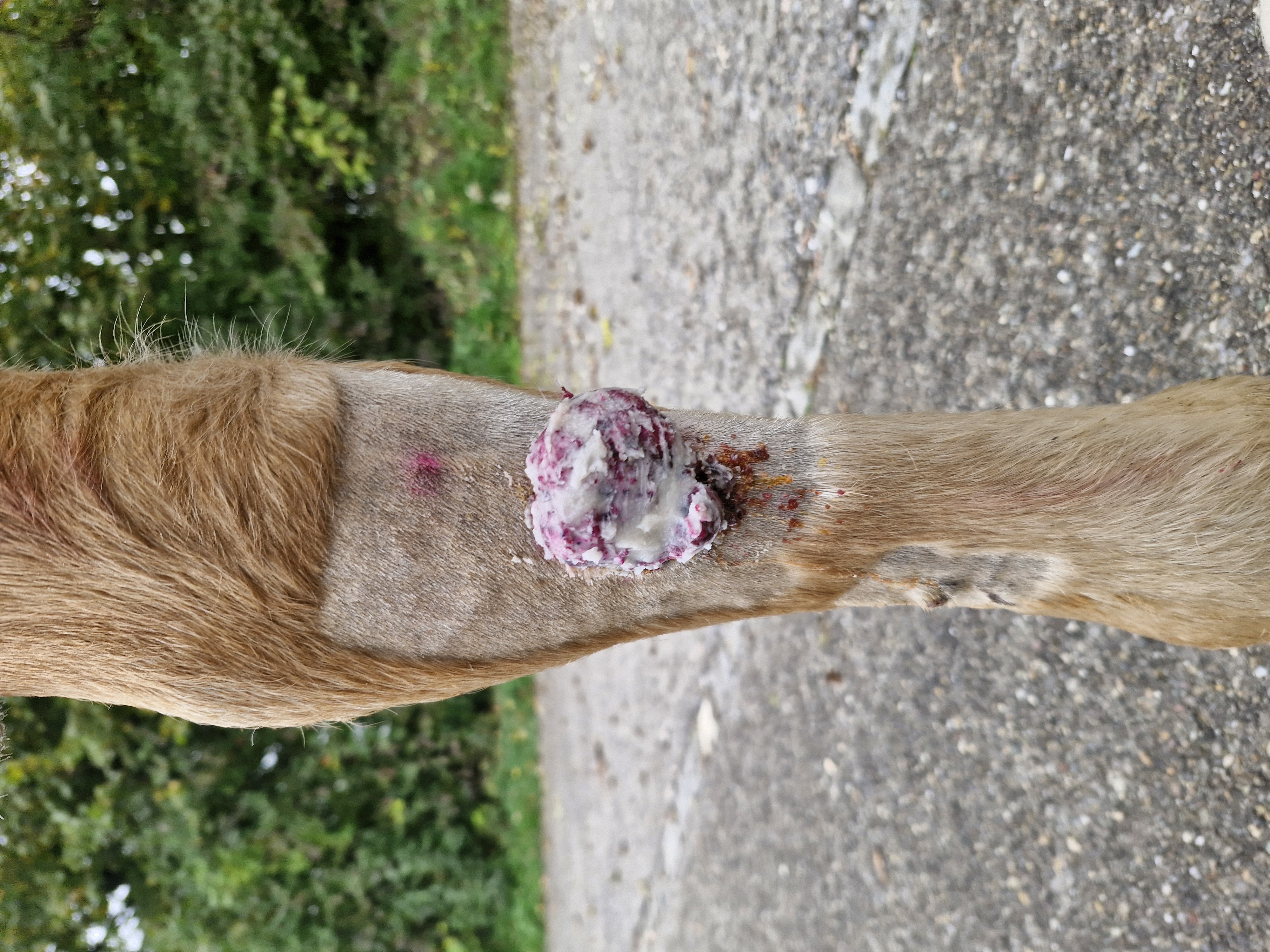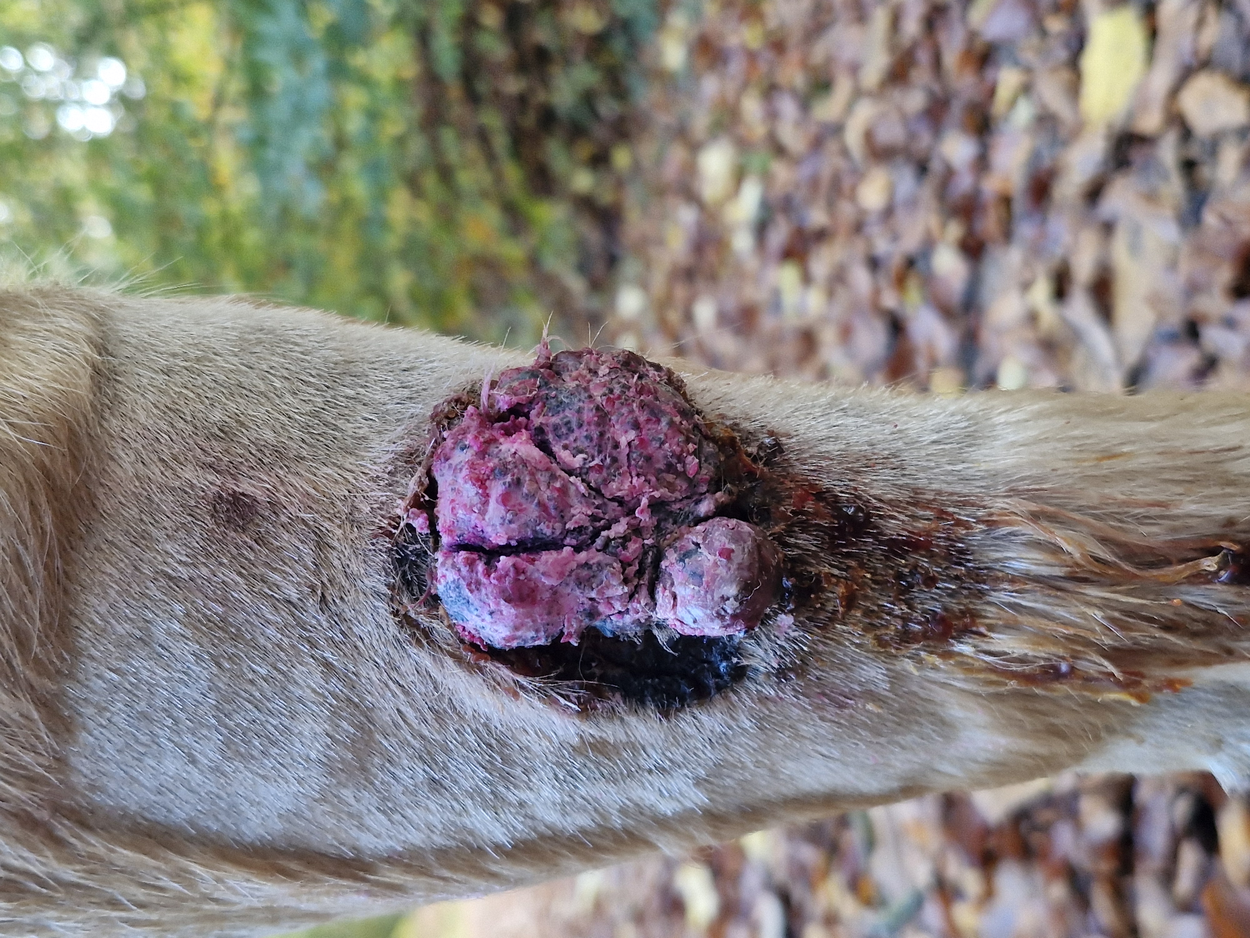 Heute war das erste Mal eine yschwellung um das Sarkoid. Es war sehr schmerzhaft morgens. Am Nachmittag nach dem Laufen war es offensichtlich nicht mehr so schmerzhaft da der Tierarzt die oberste Schicht runtergekratzt hat.