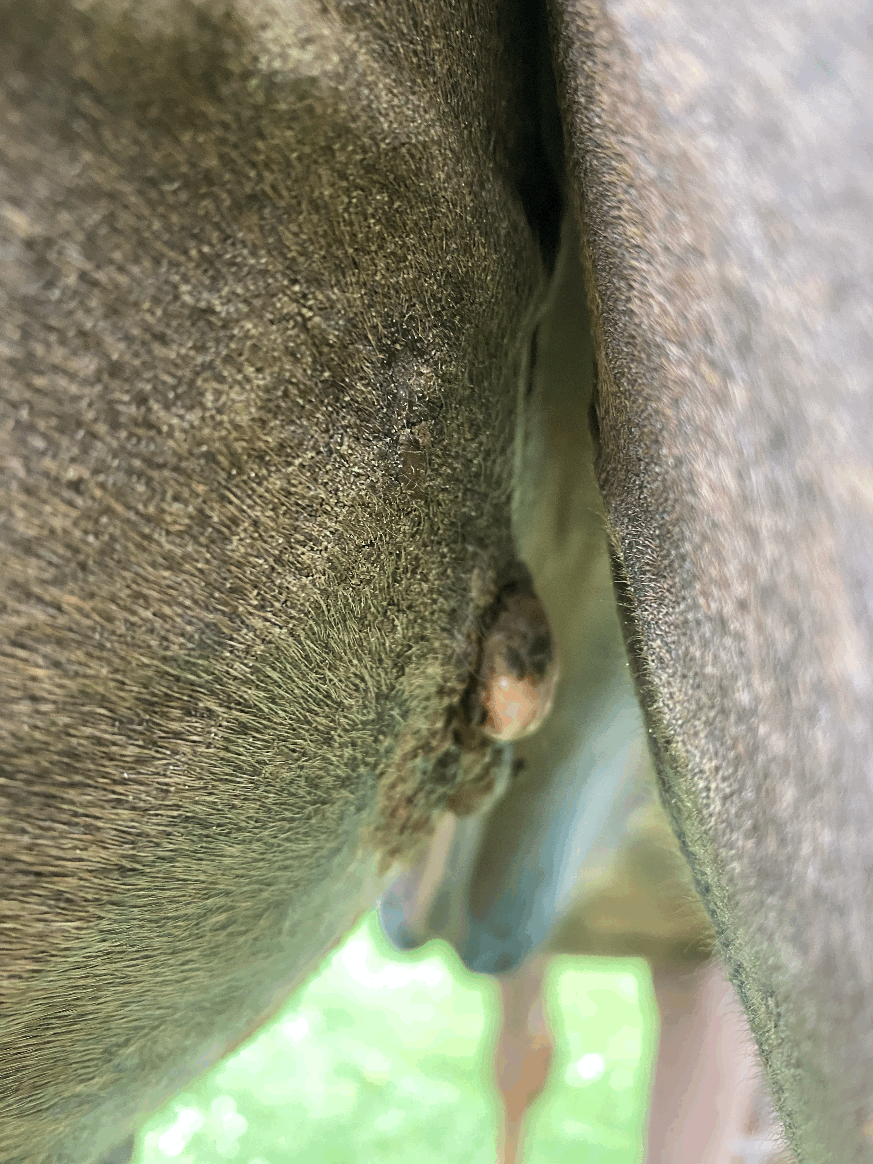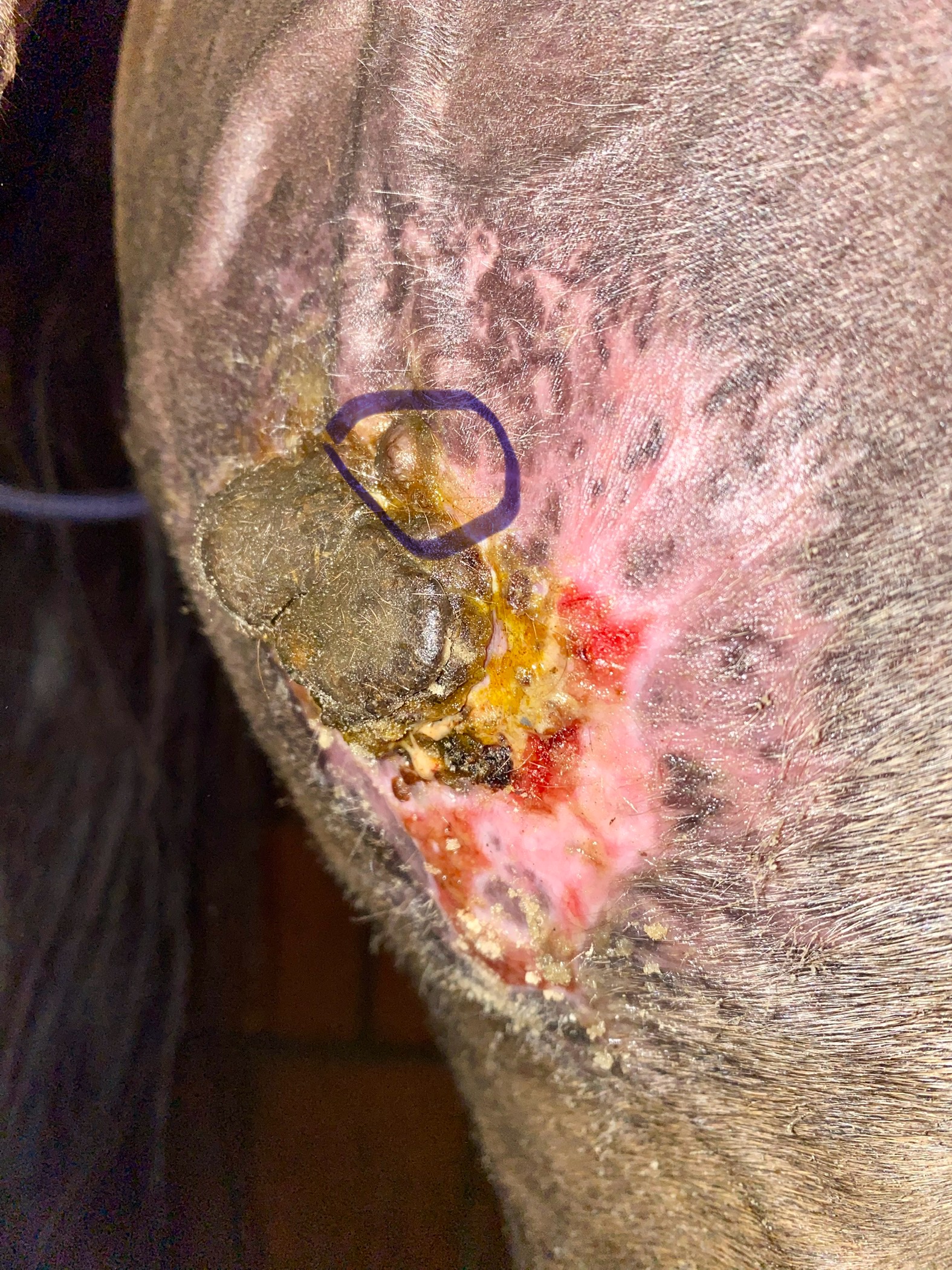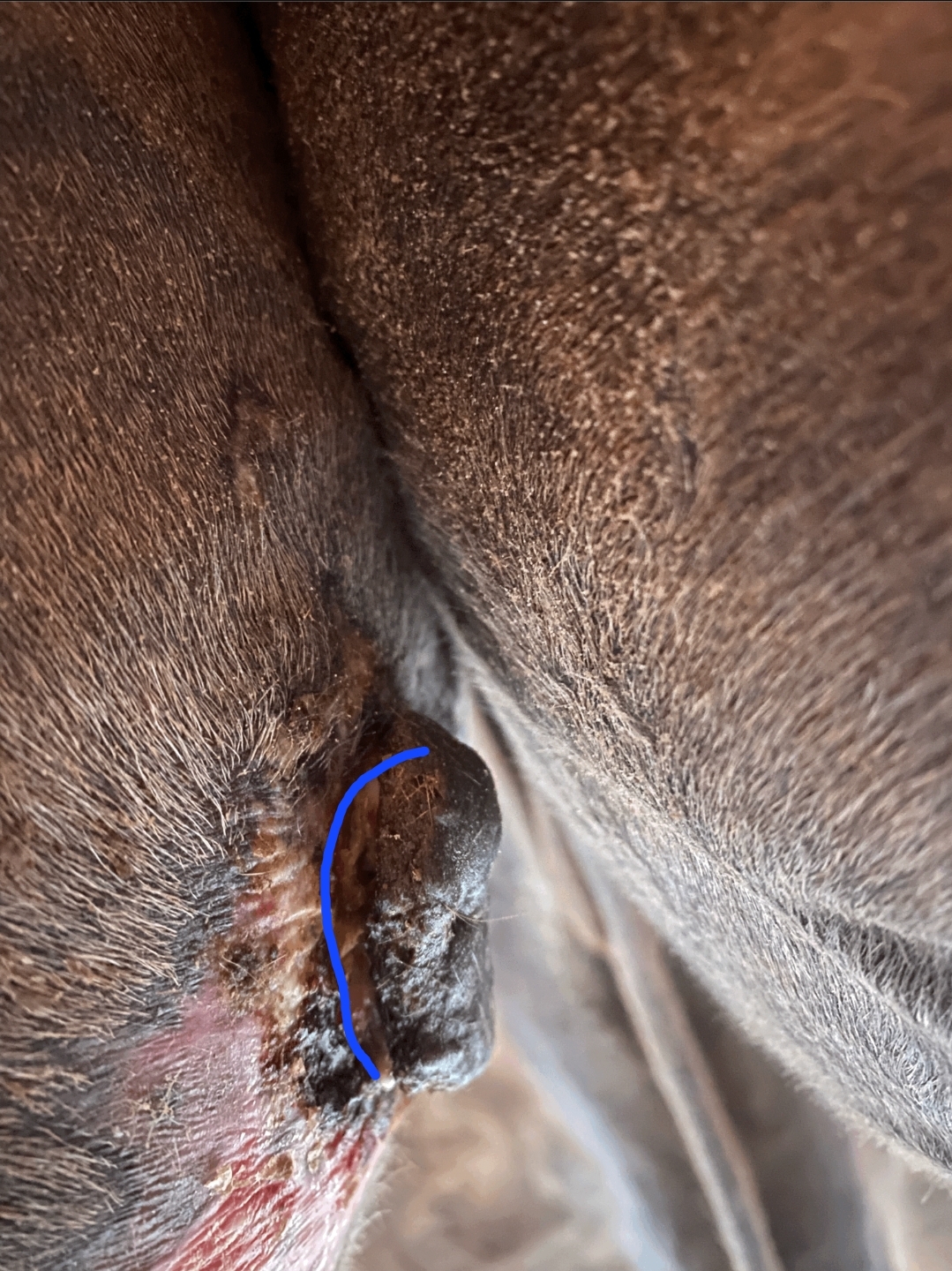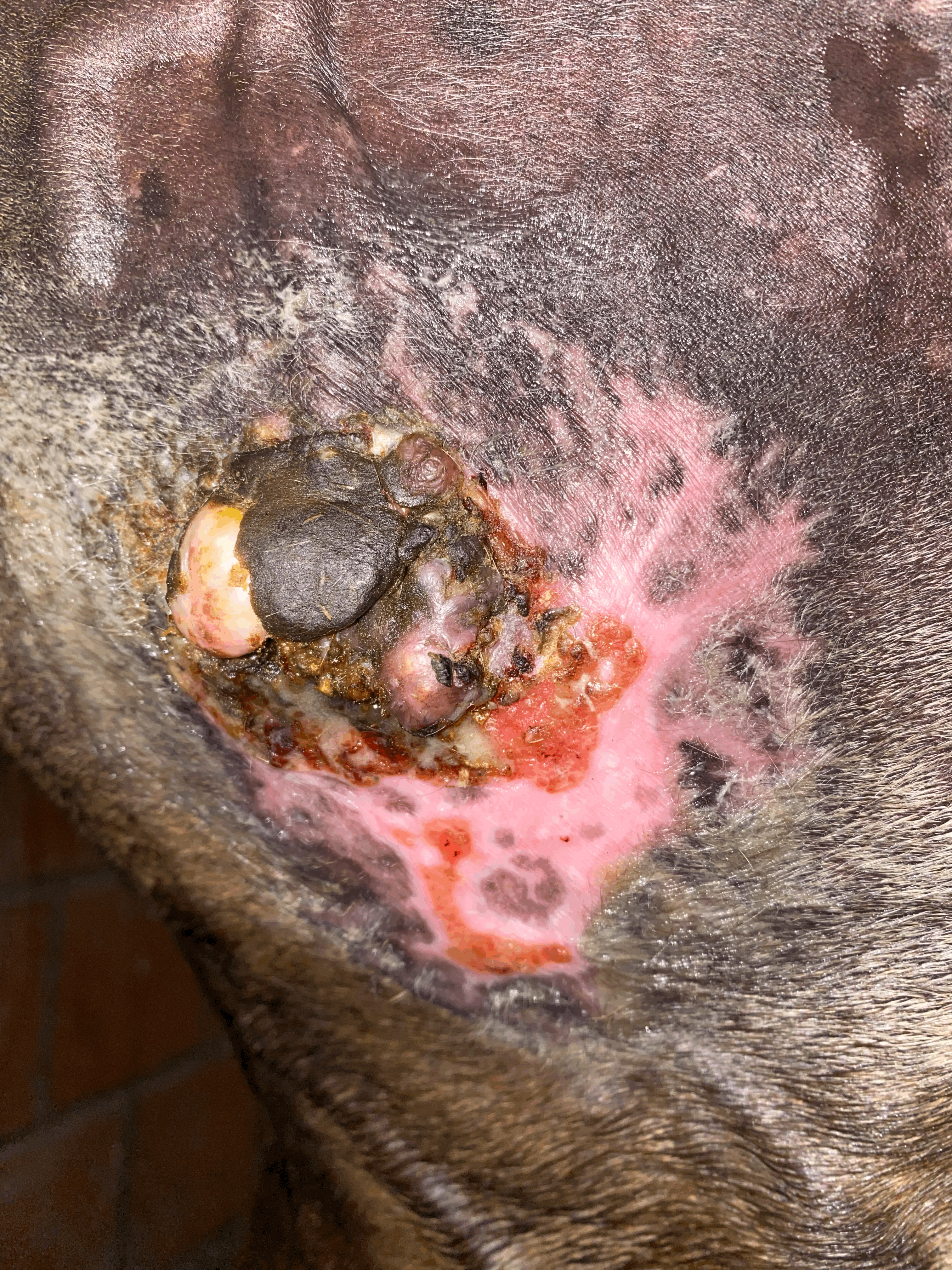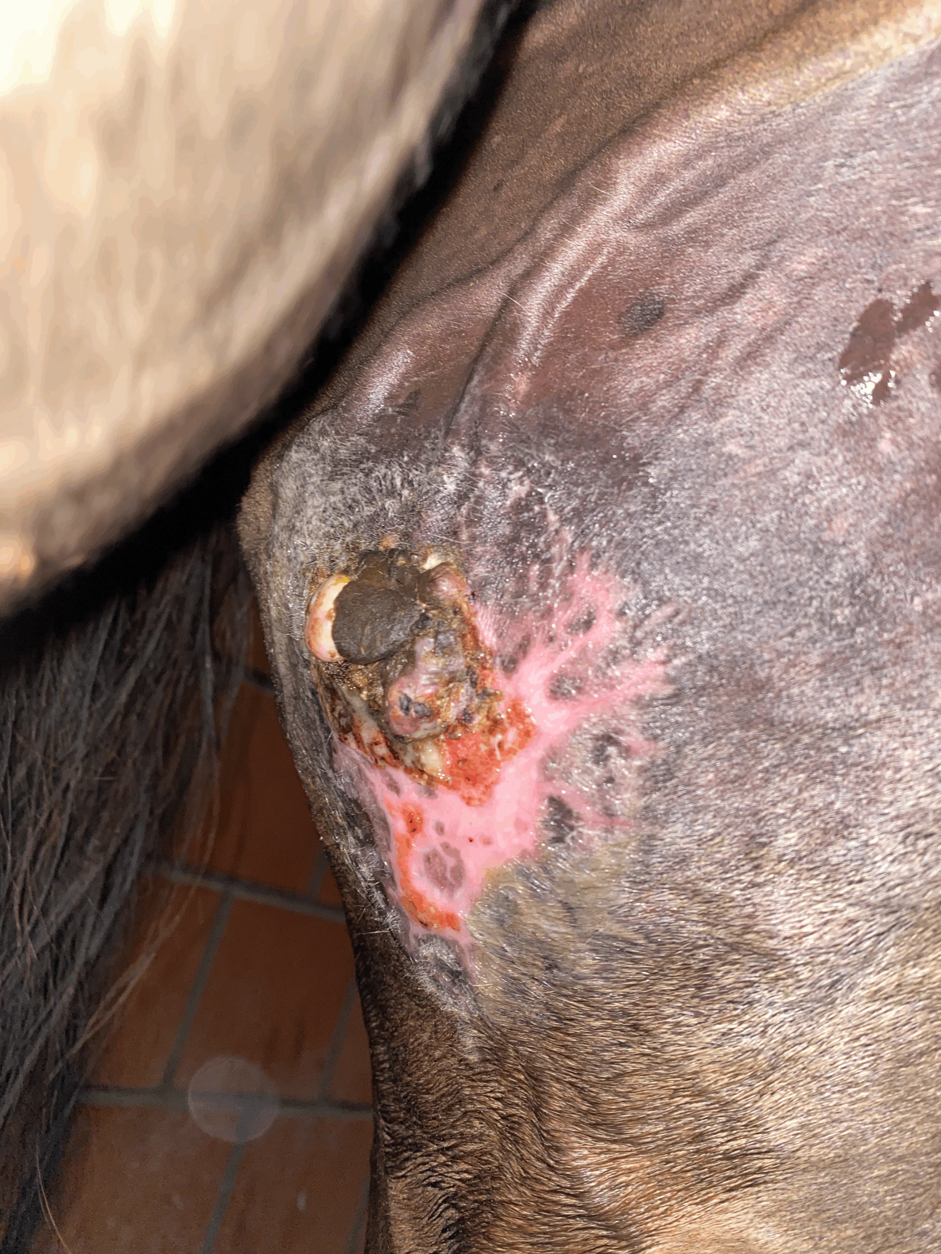 heute konnte ich die von dir markierte Stelle sehr gut unter dem Tumor eincremen. Am unteren Rand des Sarkoids habe ich allerdings den Eindruck, dass die Creme die gesunde Haut zunehmend angreift. Die Region scheint auch deutlich empfindlicher zu sein. Natürlich schütze ich die umliegenden Hautareale sorgfältig mit Lavanid-Gel und einer zusätzlichen Schicht Vaseline. Dennoch wirkt die Creme stellenweise recht stark.