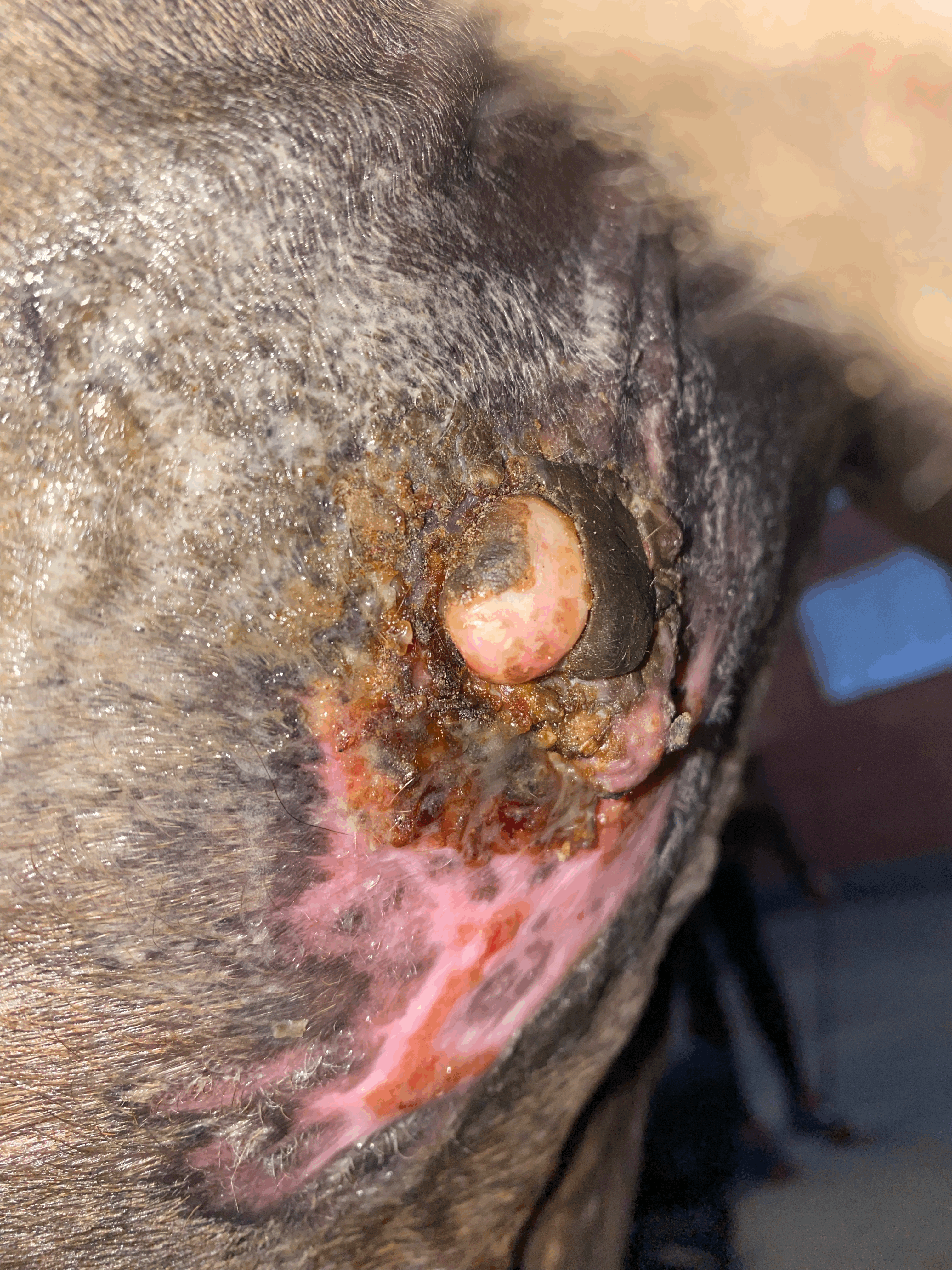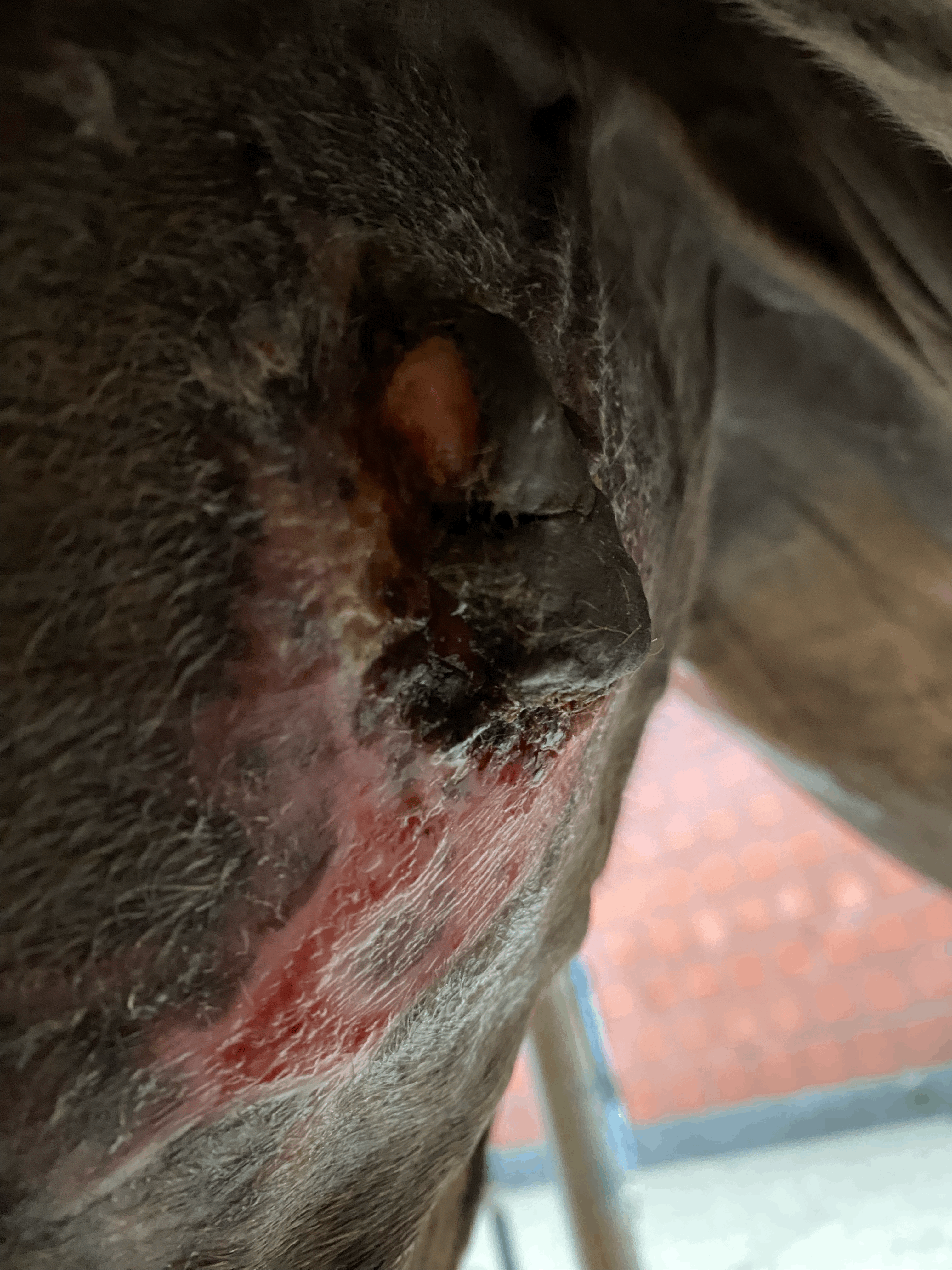 aktuell gibt es noch nicht viele Neuigkeiten. Die hintere Kruste arbeitet zunehmend, und ich komme mit der Creme gut unter das Sarkoid. Ich creme nach wie vor 1× täglich und hoffe, dass sich der vordere Tumorteil ebenfalls zeitnah ablöst.