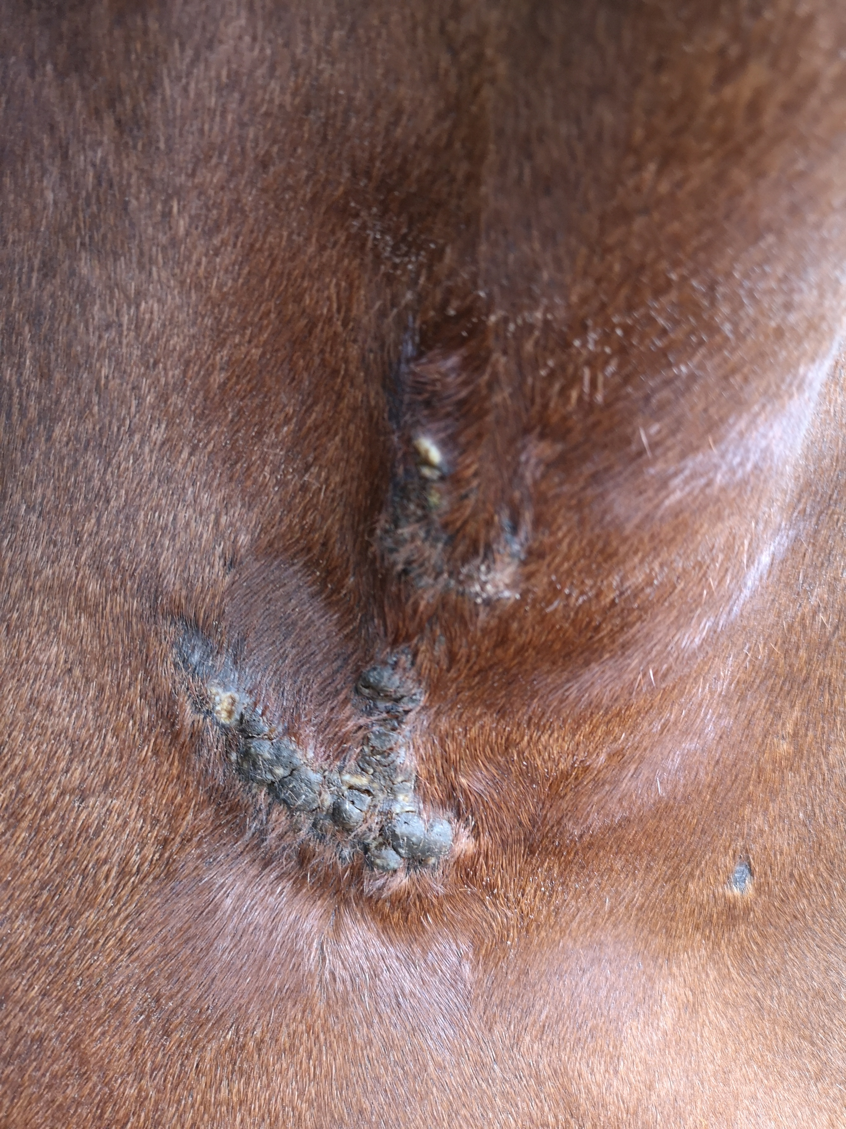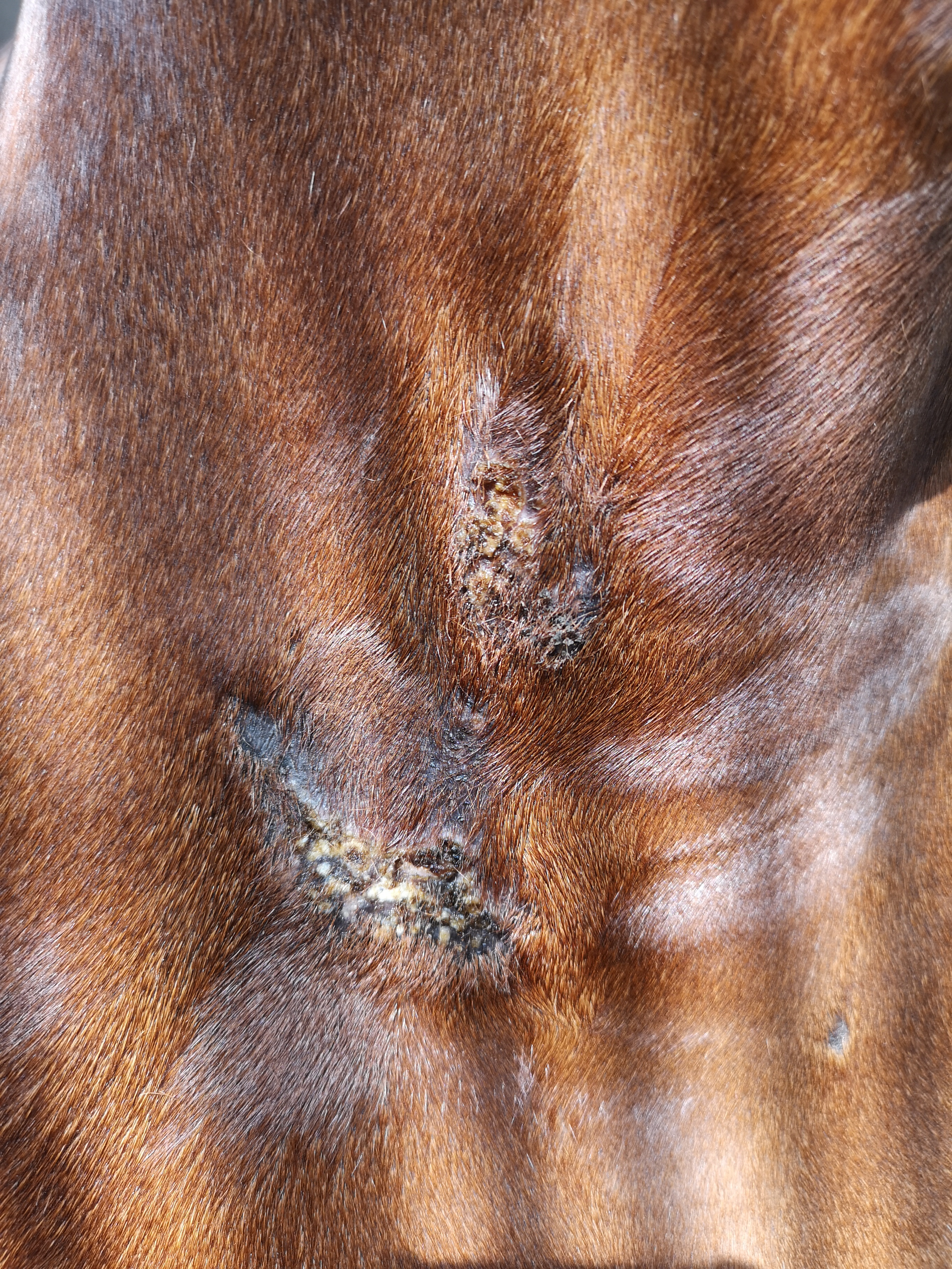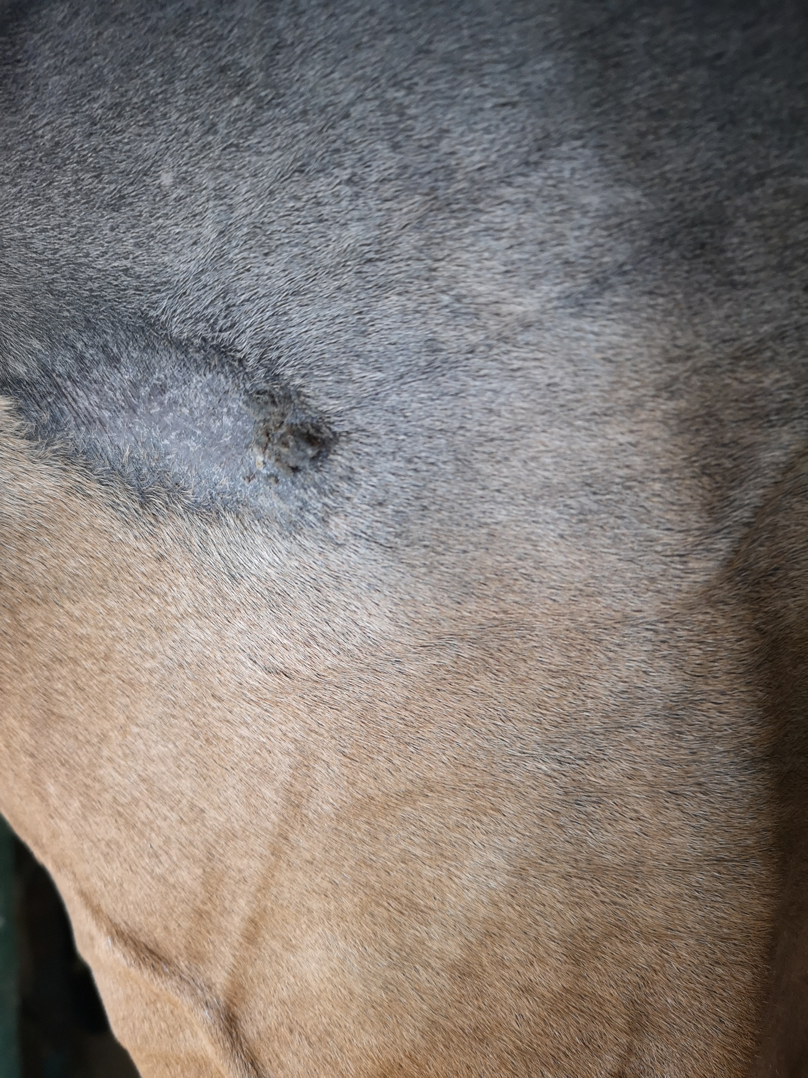 Hallo trinchen, ich lese gespannt bei Euch mit. Wir haben so was wie Ihr am Innenschenkel habt, an der Achsel - und Eures an der Brust hat meine Stute in ähnlicher Form auf der anderen Seite. Schmierst Du den kleinen haarlosen Fleck etwas abseits an der Brust auch? Das sieht für mich nämlich auch verdächtig aus. Ich selbst habe mal ne Woche pur geschmiert, als ich so gar keine Reaktion bekommen habe bzw. testen wollte, ob da noch was ist oder nicht. Das hat bei mir den vollen Durchbruch gebracht. Ich würde dem Frieden an dem Schenkelsarkoid auch noch nicht trauen und würde wie Du weiterschmieren. Es sprießen zwar vereinzelt Haare, aber nicht durchgehend (in der linken oberen Ecke z.B. nicht).