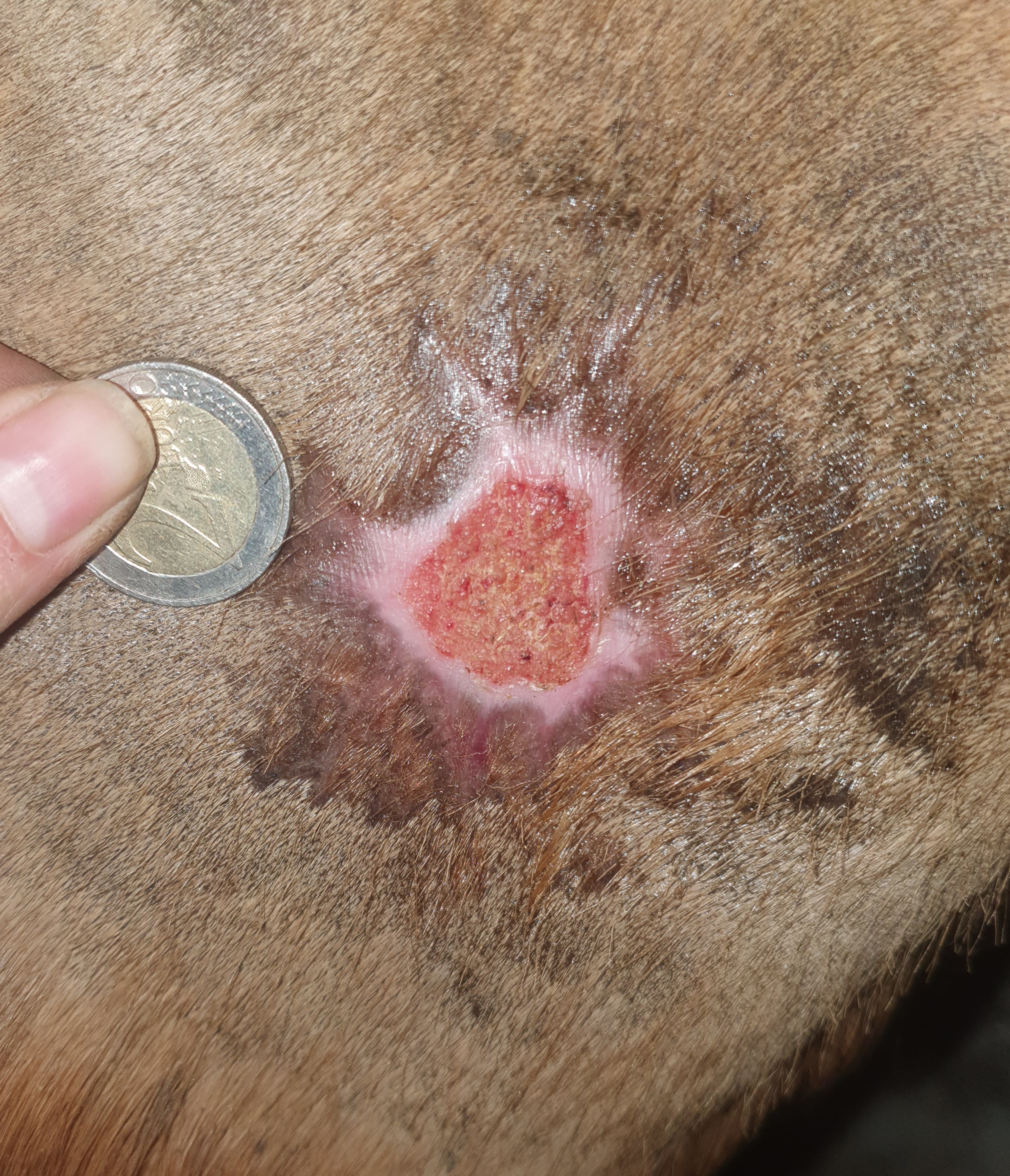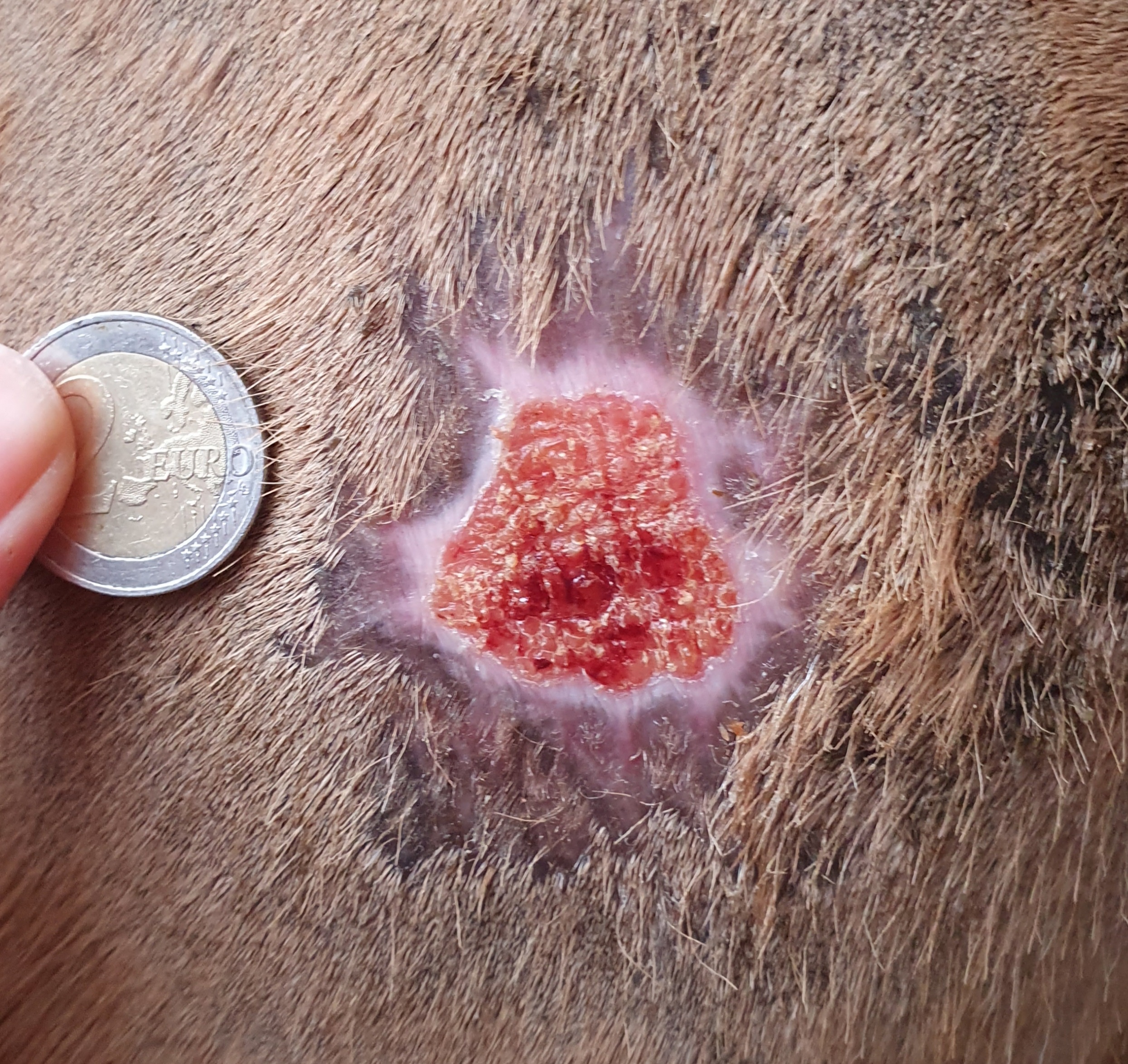 Huhu, sind das Gelbliche am rechten unteren Rand und am Fell Bepanthen-Reste? Die Sarkoidfläche selbst ist trocken und leicht bröselig, oder?