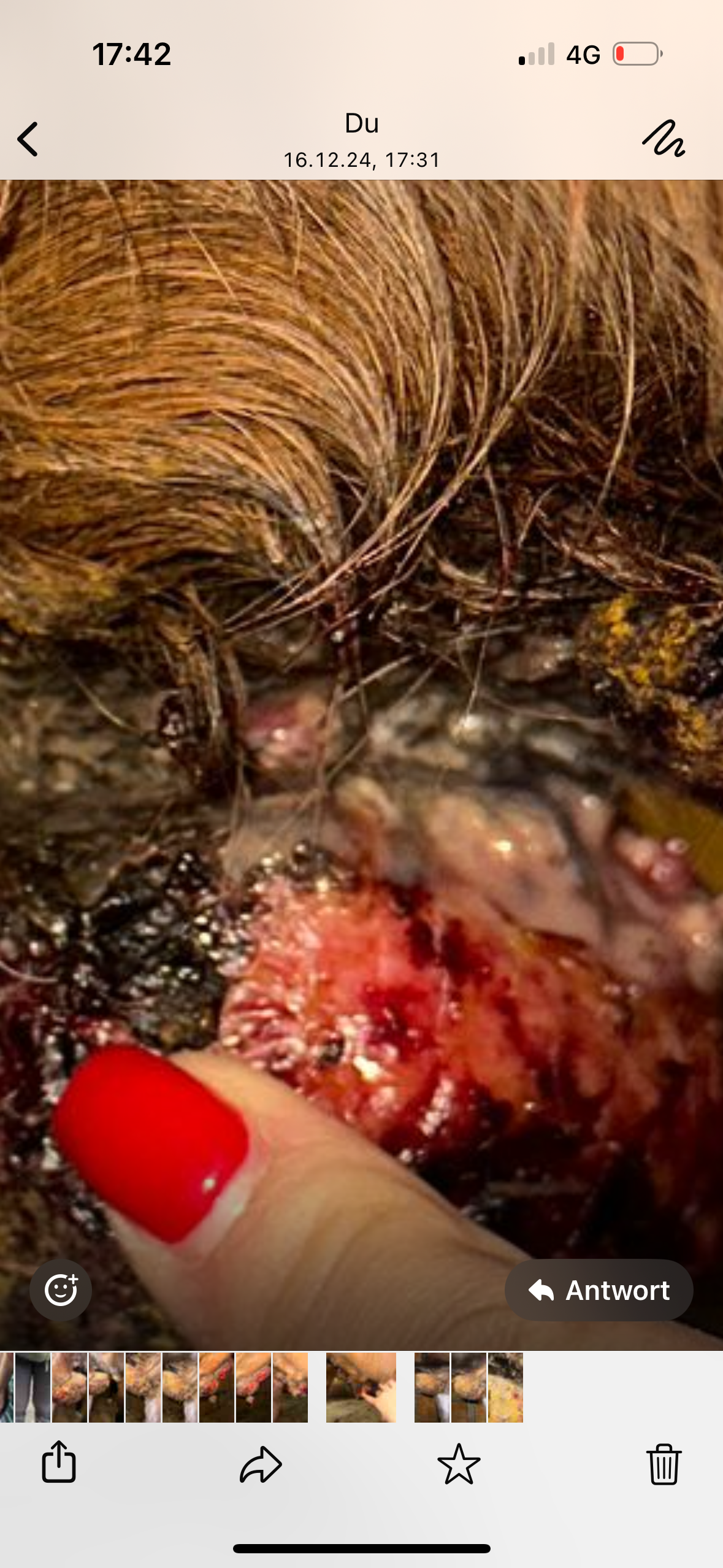 Ich sehe aber auch eine deutliche Veränderung beim hinteren Teil. Es sieht aus, als ob sich die Salbe durchfrisst oder das Sarkoid herausgezogen wird. Auf dem Bild finde ich es schwieriger erkennbar als live. Der rosa Rand befindet sich weiter innen als der dunkle Rand, das bis jetzt so noch nie erkennbar.