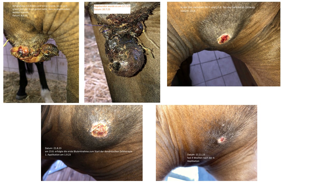 vielen Dank für die Fotos, das beruhigt tatsächlich. Ich habe mal 2 Collagen gemacht, wie die Entwicklung der Sarkoide vor der Behandlung mit CompX aussah. Begonnen haben beide ca. 1/2 cm groß. Ich hatte meine Tierärztin gefragt, sie hat mir die Behandlung mit Aldara empfohlen. Leider war diese Salbe für fast 4 Monate nicht erhältlich. In der Zeit habe ich mit Aciclovir und EM-Salbe geschmiert. Die Behandlung mit der Aldara war im Ohr nicht gut möglich, da er sich kaum einschmieren ließ (zumindest nicht gezielt). An der Brust war es besser, da konnte ich den Rand einschmieren, so dass sich das Sarkoid anfing abzuschnüren. Mit Veras Creme im Wechsel hat sich dann auch 1/3 des inzwischen deutlich faustgroßen Sarkoids abgelöst (vor dem Abbinden). Das Sarkoid am Ohr wurde dann zum großen Teil weggeschnitten (das Ohr hing schon runter), den Rest sollte die dendritische Zelltherapie bearbeiten. Laut Tierarzt von PetBioCell hatten wir eine 85% Erfolgschance. Tja, wir gehören halt zu den anderen 15%. Nach einer niederschmetternden Aussage der Pferdechirurgie Gießen bezüglich der Dauer und der Kosten für eine Laser-OP entschied ich mich (zum Glück), erst mal die CompX zu probieren. Der Verlauf der Behandlung ist ja dann dokumentiert.